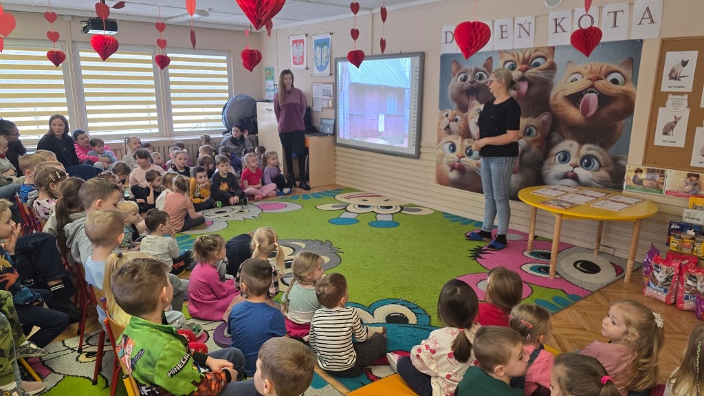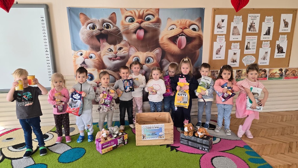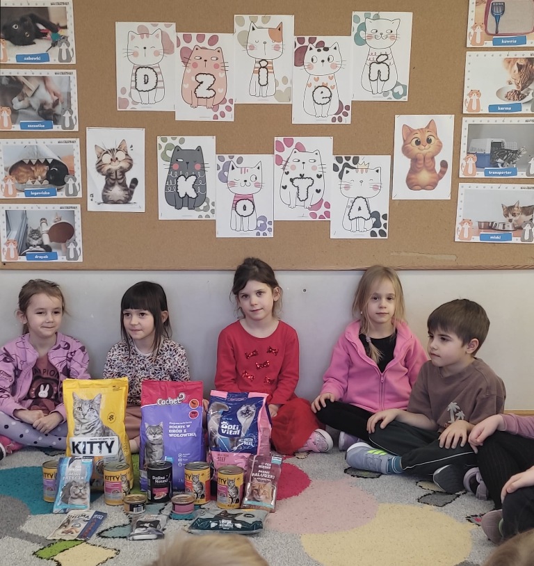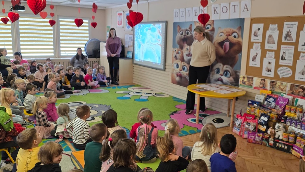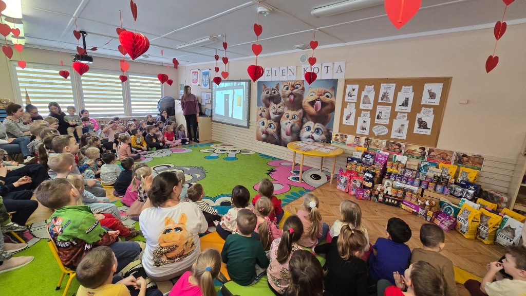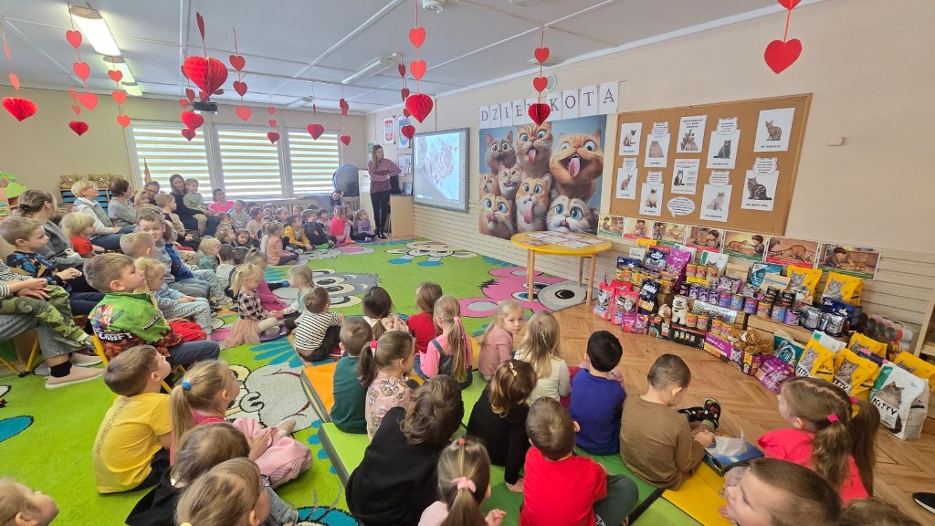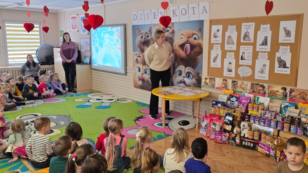 Dzień Kota to święto poświęcone kocim przyjaciołom, jednemu z najbardziej oddanych człowiekowi gatunków zwierząt domowych. Obchodzony 17 lutego w Polsce Dzień Kota to wyraz uznania dla wyjątkowej więzi między ludźmi, a kotami, kładący nacisk na radość i towarzystwo, jakie wnoszą one do naszego życia. Dzień ten staje się również platformą do podnoszenia świadomości na temat dobrostanu kotów i potrzeby adopcji ze schronisk, podkreślając odpowiedzialne podejście do ich posiadania. Z tej okazji w naszym przedszkolu, odbyła się zbiórka suchej karmy dla kotów. Przedszkolaki i Rodzice bardzo aktywnie włączyli się do akcji, dzięki czemu zgromadziliśmy bardzo dużą ilość pożywienia. Dzisiaj w Przedszkole Integracyjnym gościliśmy wyjątkowego gościa ze Schroniska dla zwierząt w Łowiczu. Pani Maria Smela podzieliła się z Nami efektami pracy nad miejscem, w którym bezdomne łowickie koty będą mogły znaleźć tymczasowe schronienie. Opowiedziała dzieciom i pokazała jak wygląda kocie życie w schronisku , uwrażliwiła przedszkolaki na potrzeby zwierząt domowych.
