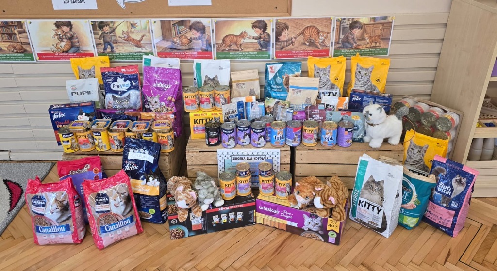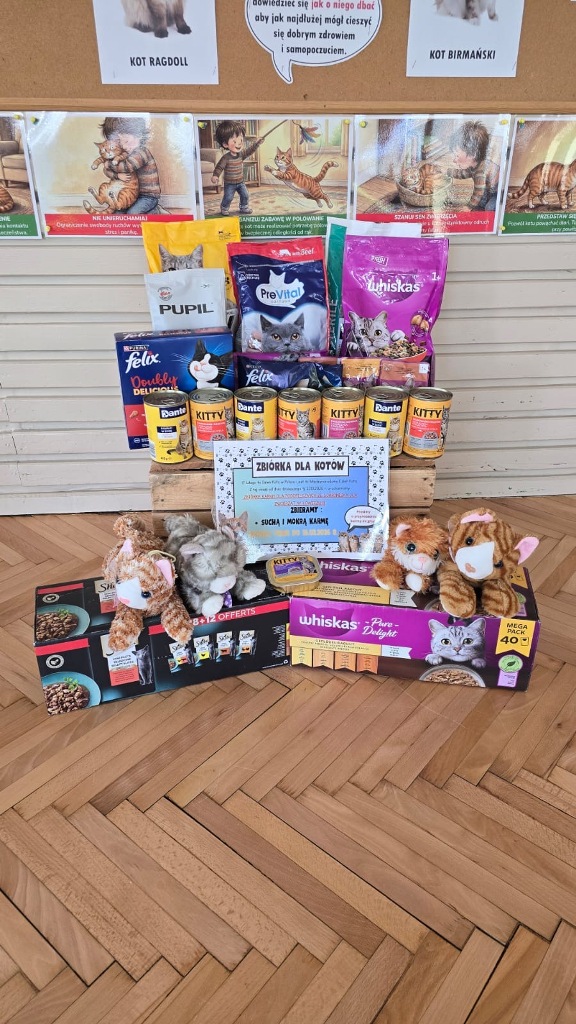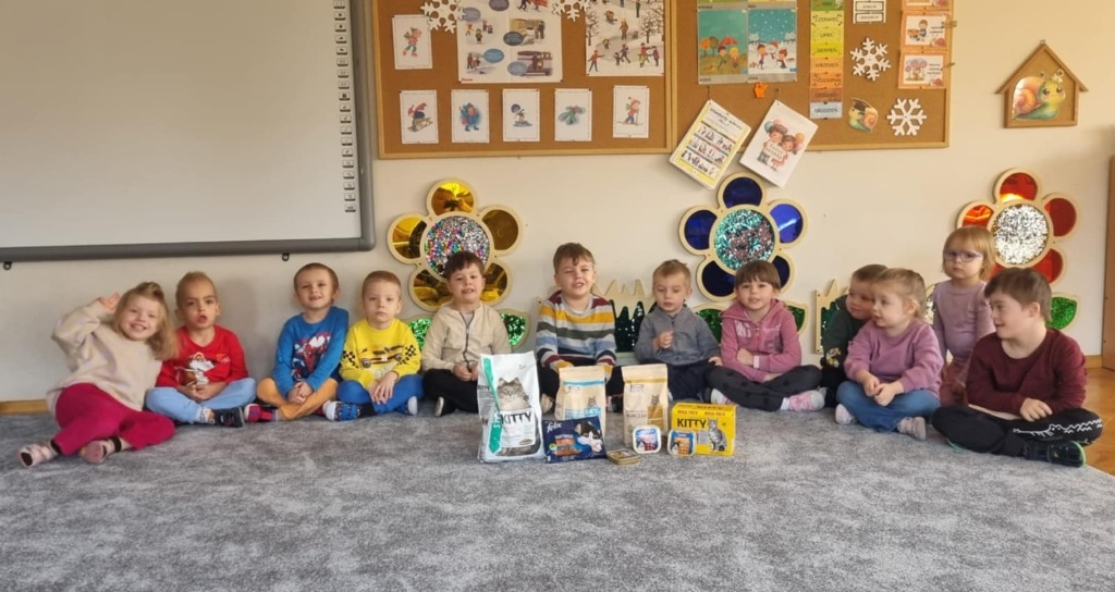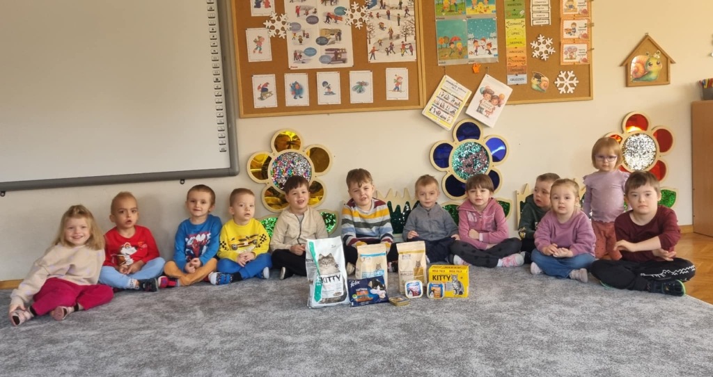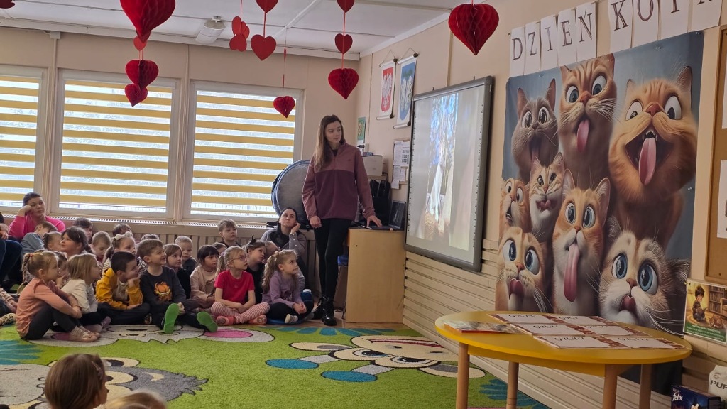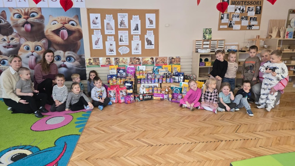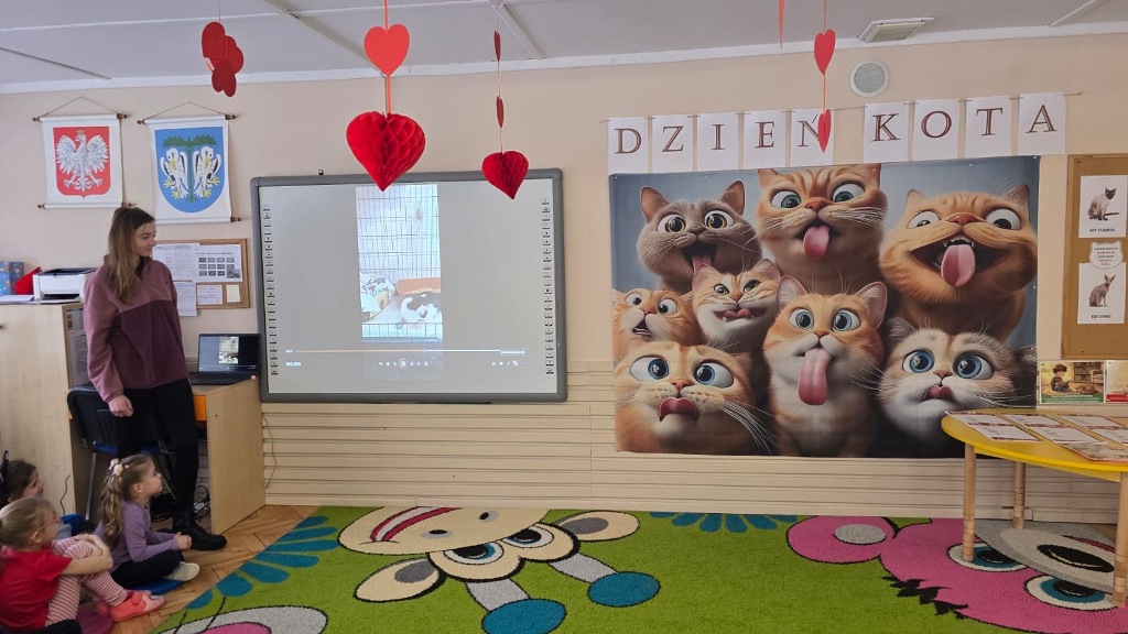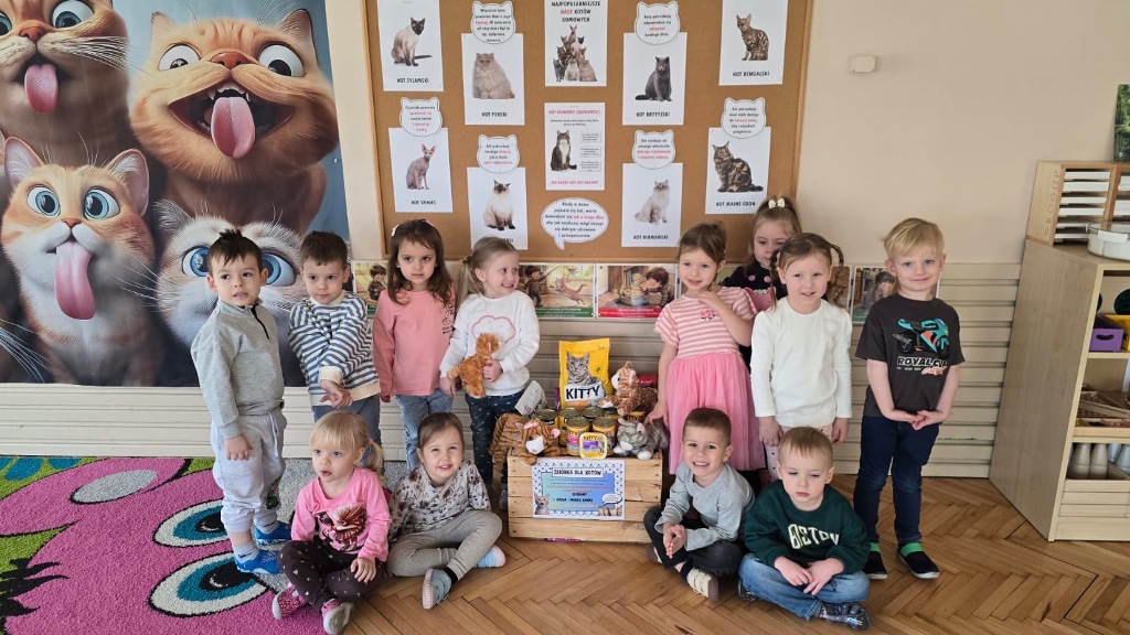 Dzień Kota to święto poświęcone kocim przyjaciołom, jednemu z najbardziej oddanych człowiekowi gatunków zwierząt domowych. Obchodzony 17 lutego w Polsce Dzień Kota to wyraz uznania dla wyjątkowej więzi między ludźmi, a kotami, kładący nacisk na radość i towarzystwo, jakie wnoszą one do naszego życia. Dzień ten staje się również platformą do podnoszenia świadomości na temat dobrostanu kotów i potrzeby adopcji ze schronisk, podkreślając odpowiedzialne podejście do ich posiadania. Z tej okazji w naszym przedszkolu, odbyła się zbiórka suchej karmy dla kotów. Przedszkolaki i Rodzice bardzo aktywnie włączyli się do akcji, dzięki czemu zgromadziliśmy bardzo dużą ilość pożywienia. Dzisiaj w Przedszkole Integracyjnym gościliśmy wyjątkowego gościa ze Schroniska dla zwierząt w Łowiczu. Pani Maria Smela podzieliła się z Nami efektami pracy nad miejscem, w którym bezdomne łowickie koty będą mogły znaleźć tymczasowe schronienie. Opowiedziała dzieciom i pokazała jak wygląda kocie życie w schronisku , uwrażliwiła przedszkolaki na potrzeby zwierząt domowych.