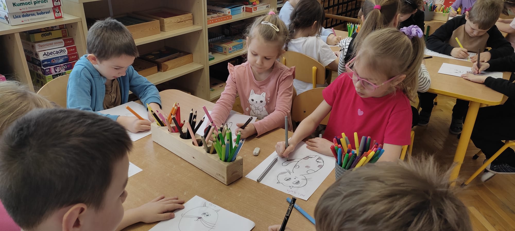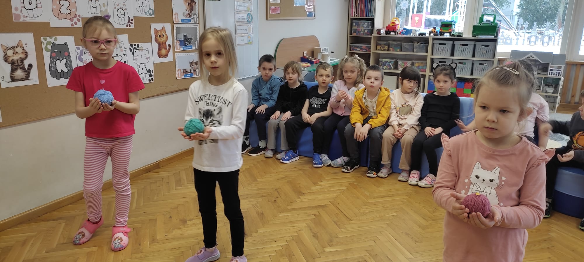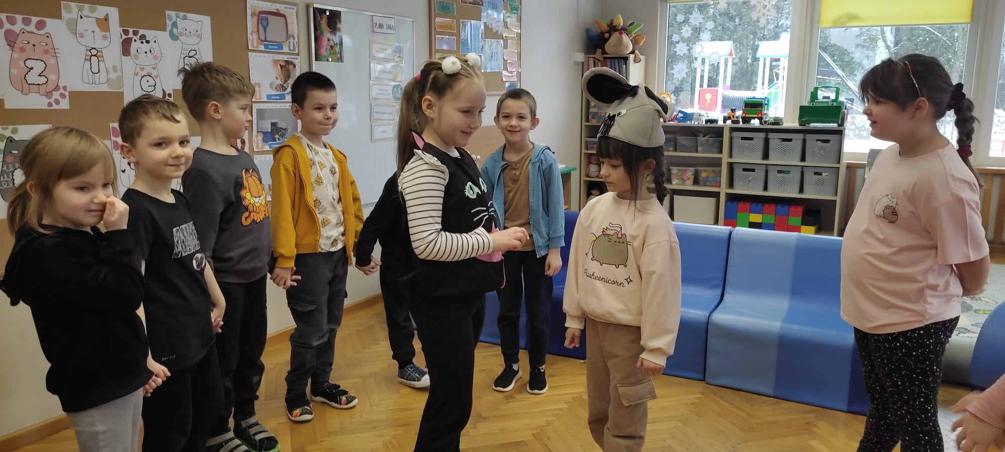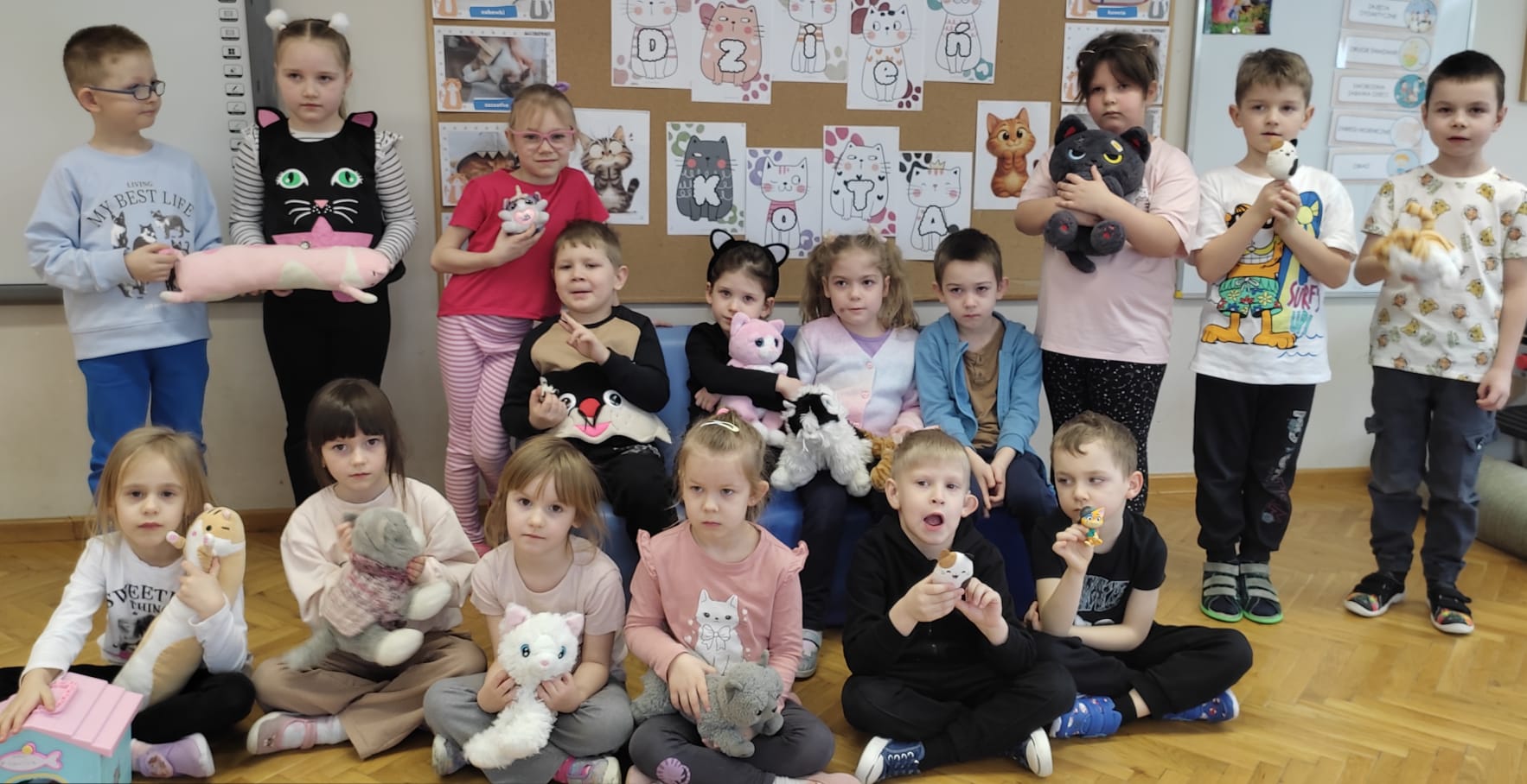 Wspólnie z ulubienicą dzieci "Kicią Kocią", wyruszyliśmy dziś w niezwykłą podróż do świata czworonogów. Przeglądając barwne książeczki Anity Głowińskiej, śledząc przygody naszej bohaterki, odkryliśmy, jak wiele radości daje dbanie o kocich przyjaciół. Pełna miseczka i ciepły kąt to nie wszystko – liczy się też szacunek i pomoc tym kotkom, które nie mają swojego domu. To dzień pełen radosnego mruczenia i wielkich emocji. Były zabawy ruchowe z kłębkami wełny, kocie piosenki, picie mleczka i oczywiście tradycyjna zabawa "Uciekaj myszko do dziury". Powstały także niezwykle oryginalne rysunki kotów, a każdy z nich miał swój niepowtarzalny charakter.