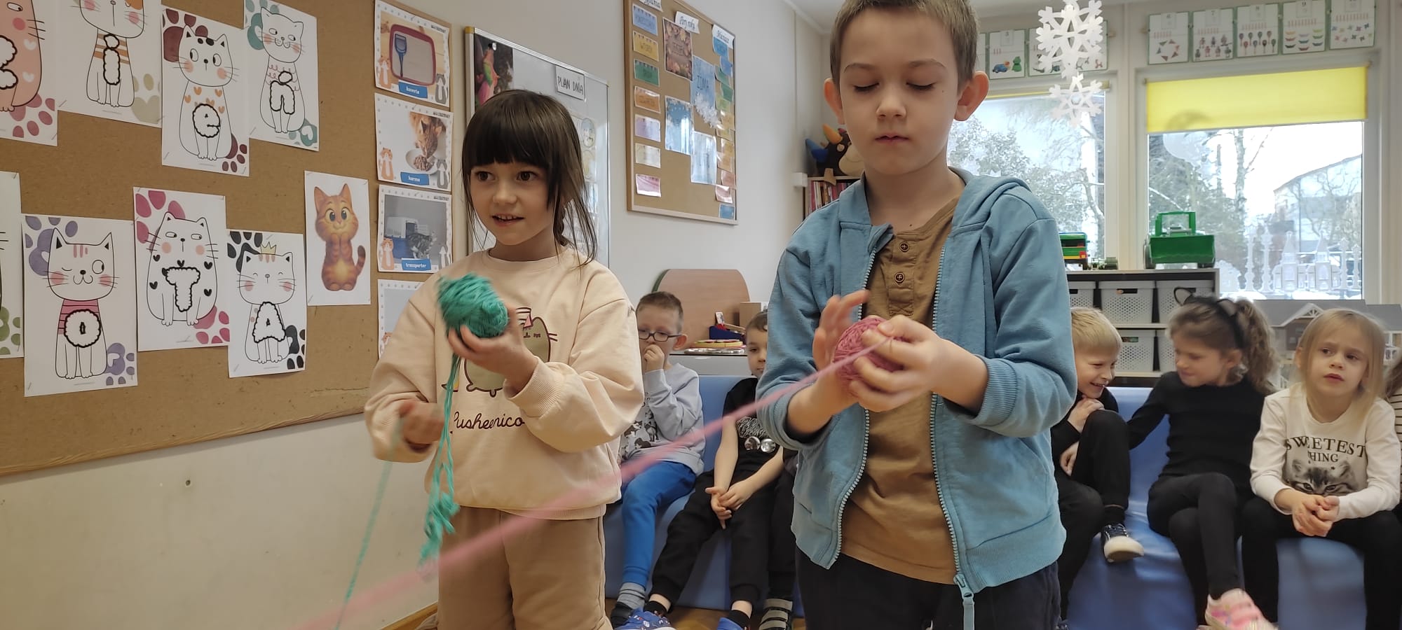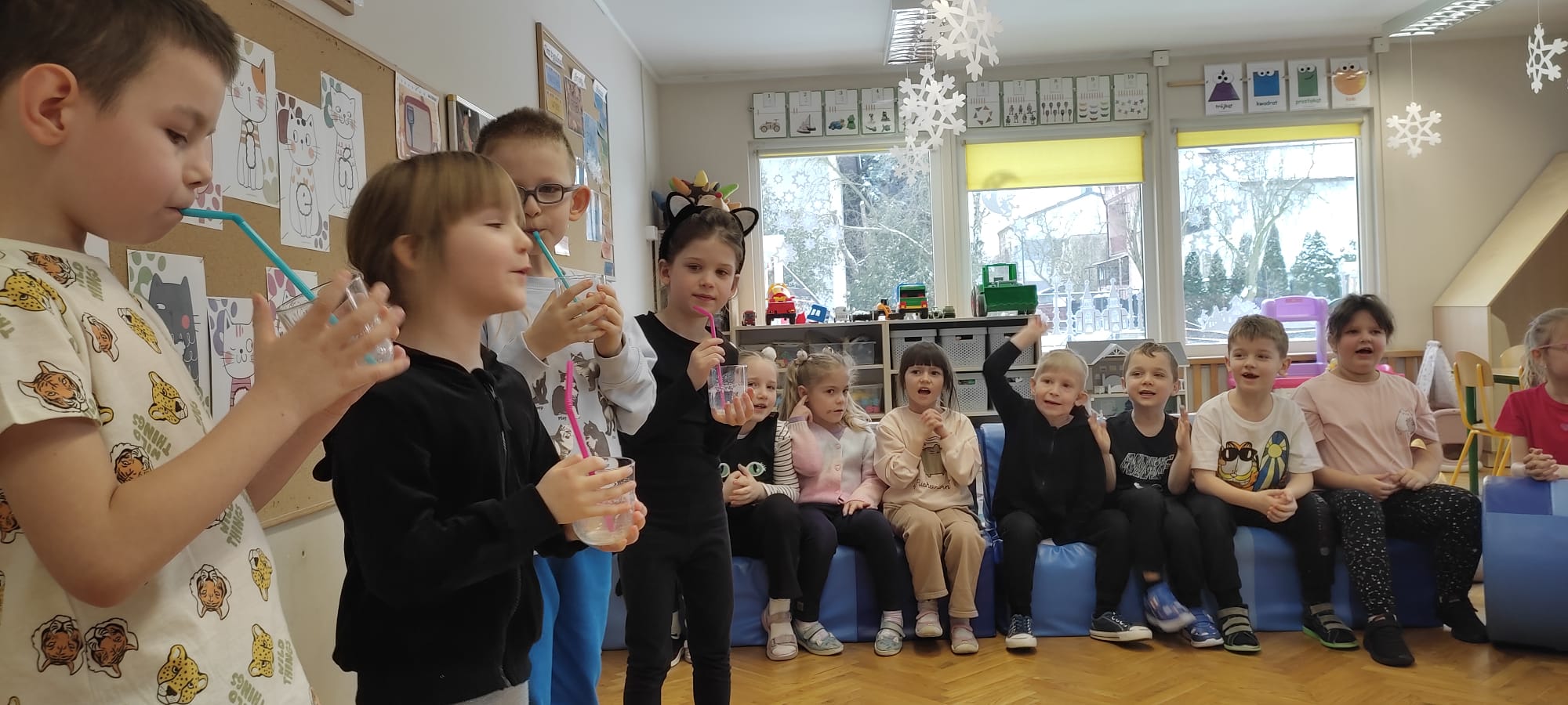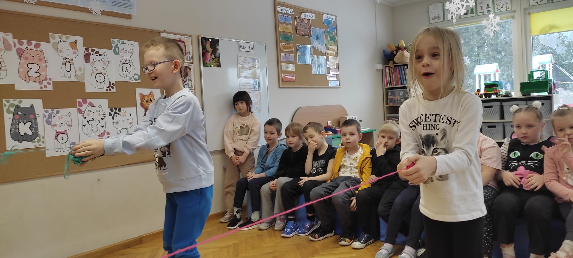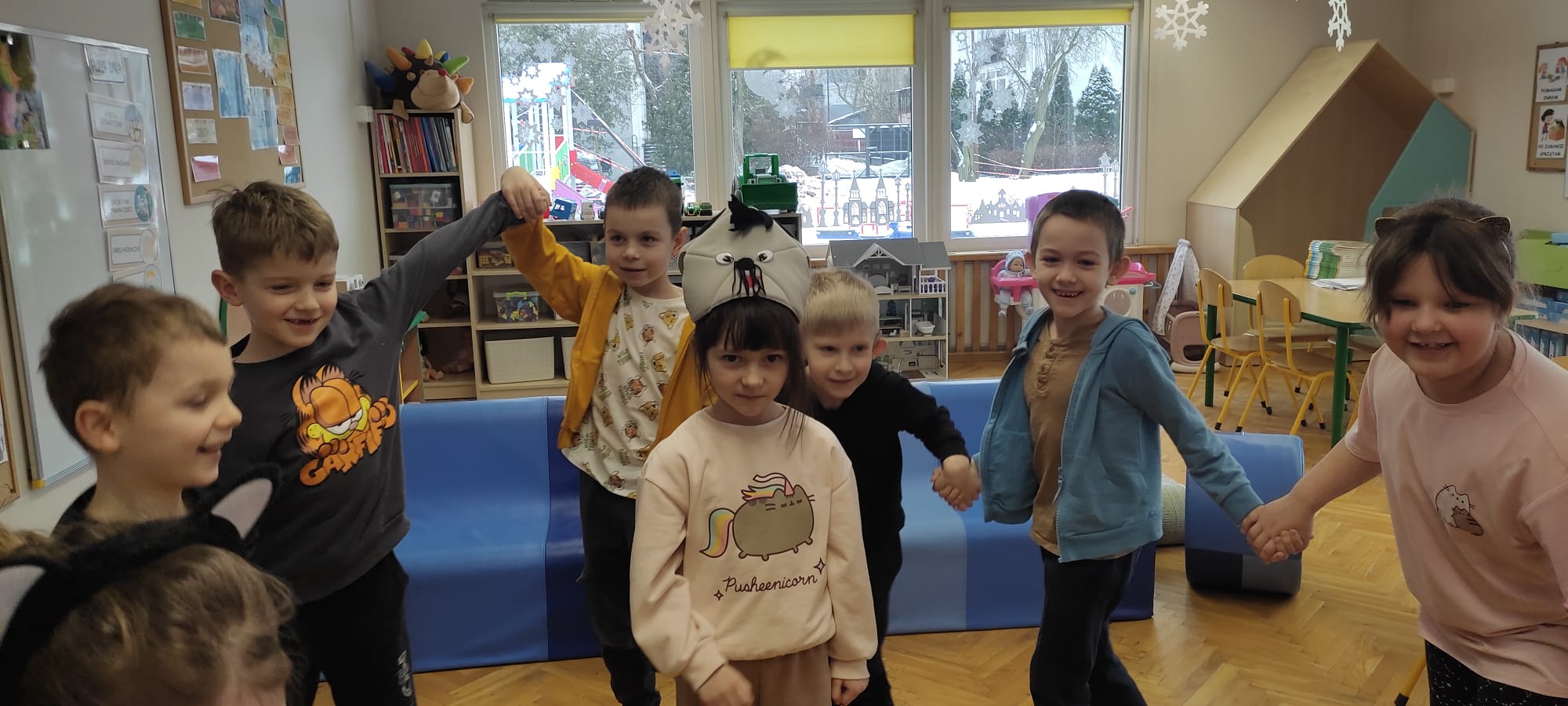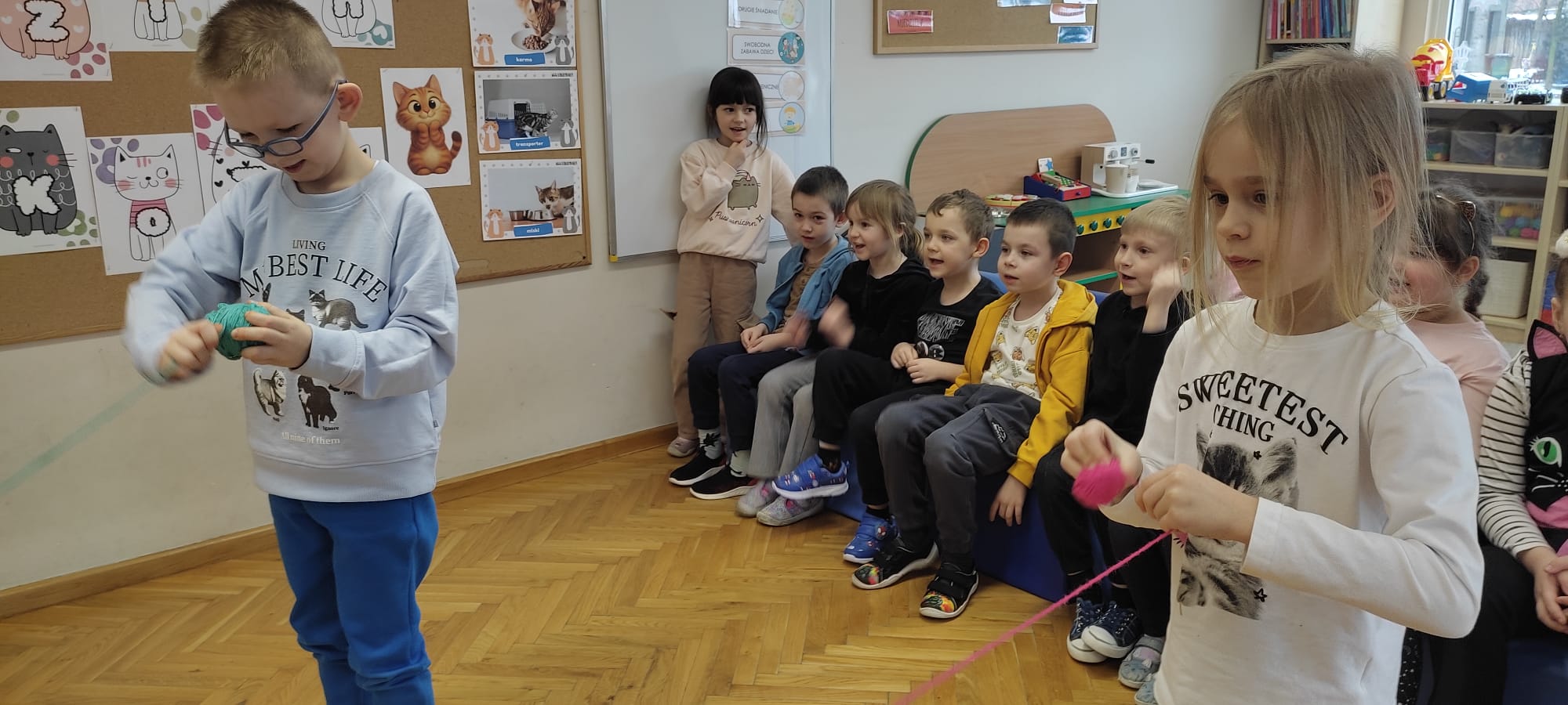 Wspólnie z ulubienicą dzieci "Kicią Kocią", wyruszyliśmy dziś w niezwykłą podróż do świata czworonogów. Przeglądając barwne książeczki Anity Głowińskiej, śledząc przygody naszej bohaterki, odkryliśmy, jak wiele radości daje dbanie o kocich przyjaciół. Pełna miseczka i ciepły kąt to nie wszystko – liczy się też szacunek i pomoc tym kotkom, które nie mają swojego domu. To dzień pełen radosnego mruczenia i wielkich emocji. Były zabawy ruchowe z kłębkami wełny, kocie piosenki, picie mleczka i oczywiście tradycyjna zabawa "Uciekaj myszko do dziury". Powstały także niezwykle oryginalne rysunki kotów, a każdy z nich miał swój niepowtarzalny charakter.