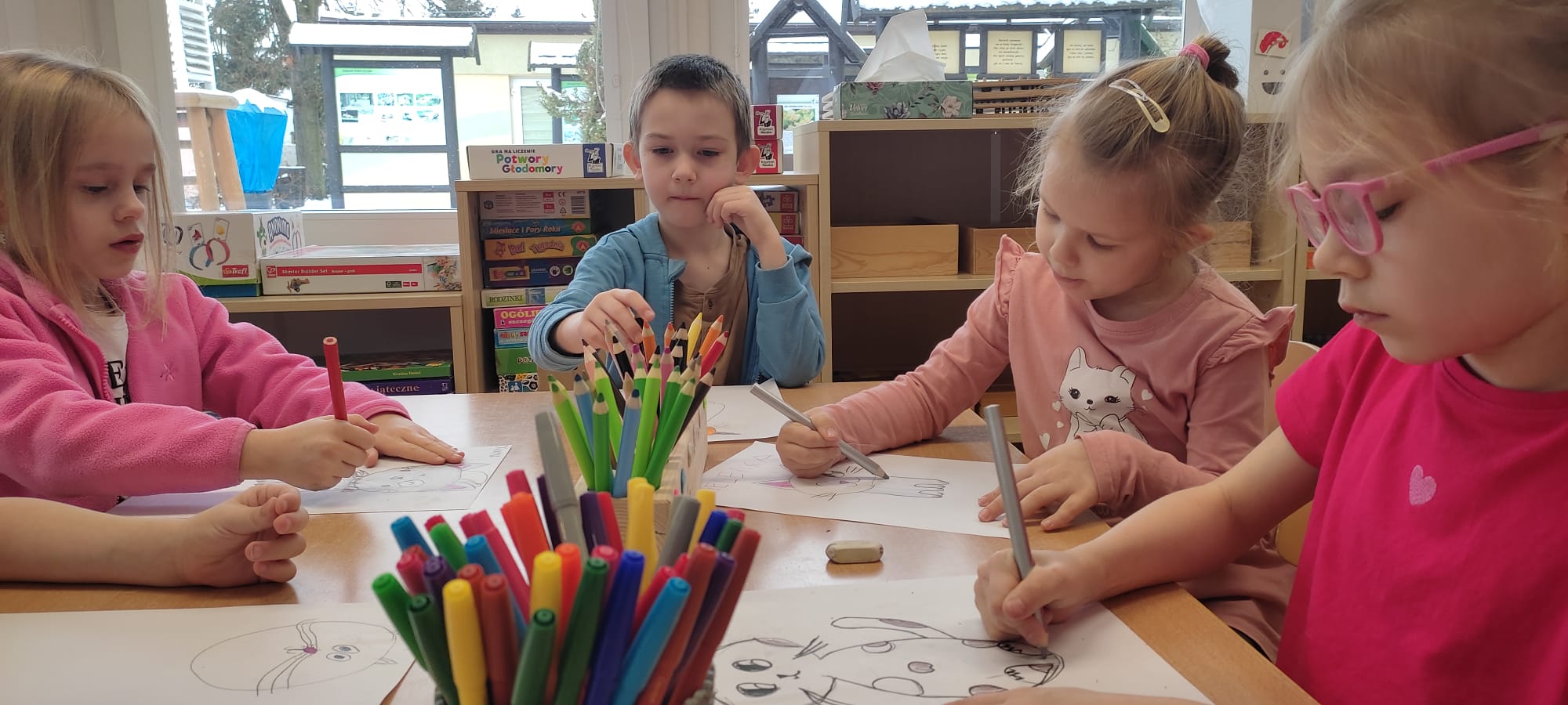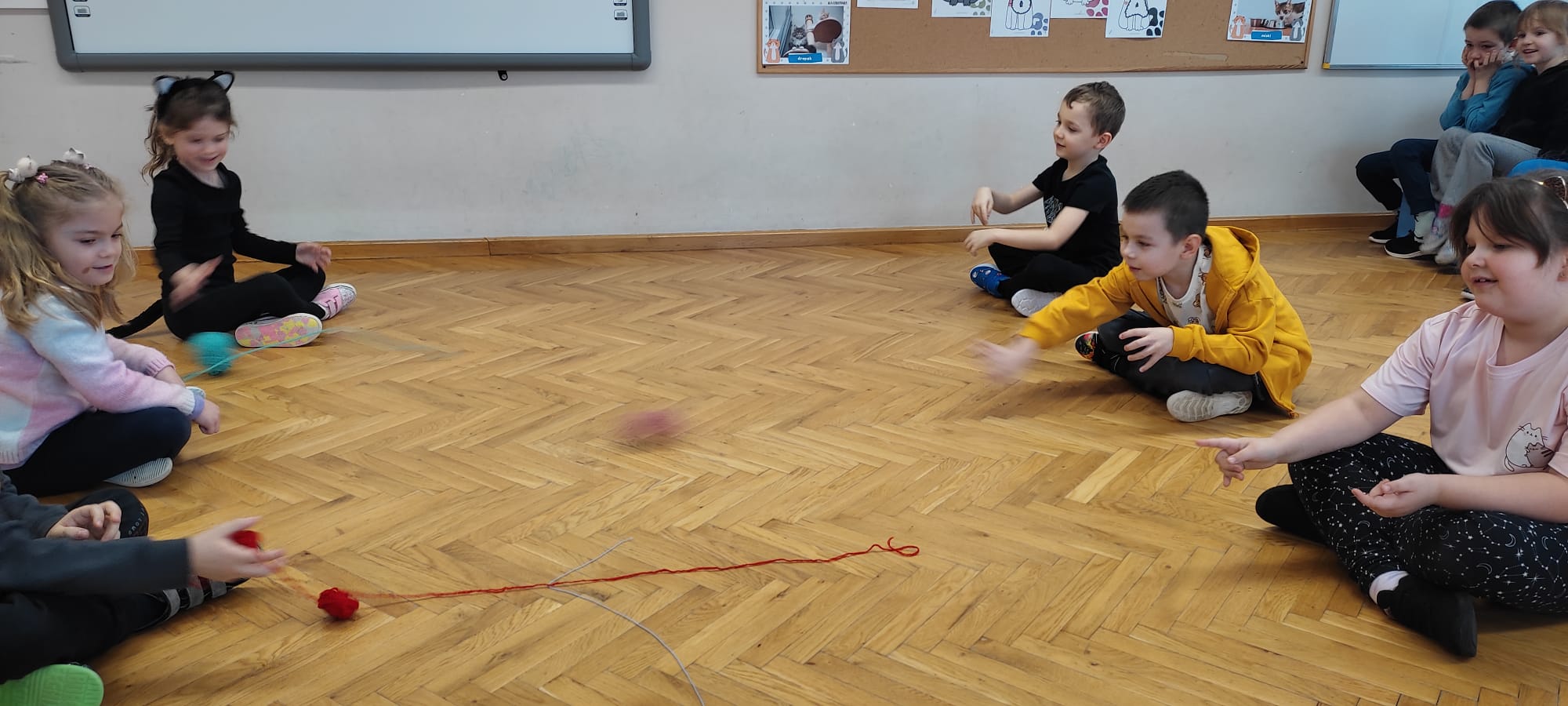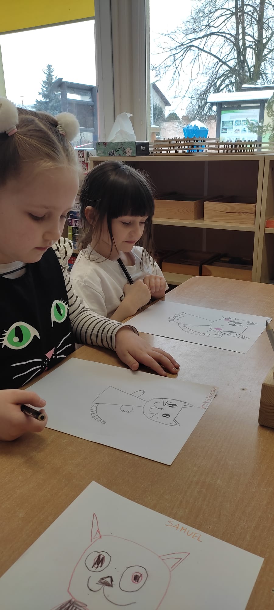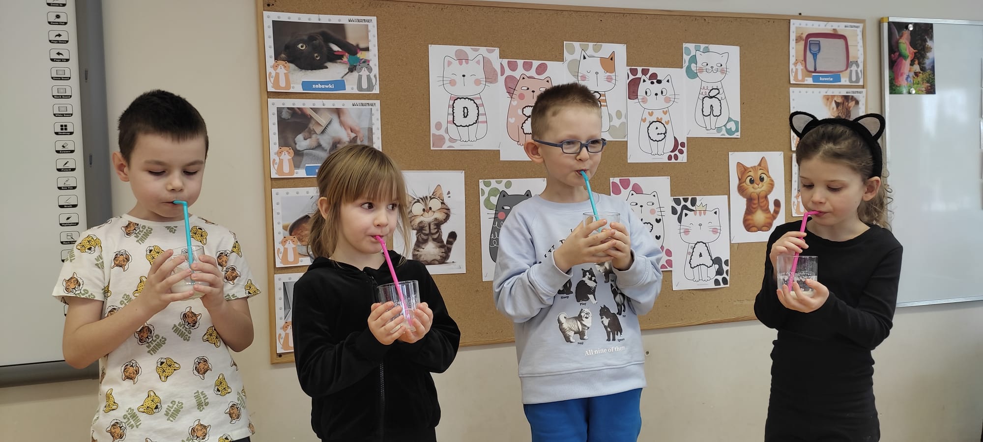 Wspólnie z ulubienicą dzieci "Kicią Kocią", wyruszyliśmy dziś w niezwykłą podróż do świata czworonogów. Przeglądając barwne książeczki Anity Głowińskiej, śledząc przygody naszej bohaterki, odkryliśmy, jak wiele radości daje dbanie o kocich przyjaciół. Pełna miseczka i ciepły kąt to nie wszystko – liczy się też szacunek i pomoc tym kotkom, które nie mają swojego domu. To dzień pełen radosnego mruczenia i wielkich emocji. Były zabawy ruchowe z kłębkami wełny, kocie piosenki, picie mleczka i oczywiście tradycyjna zabawa "Uciekaj myszko do dziury". Powstały także niezwykle oryginalne rysunki kotów, a każdy z nich miał swój niepowtarzalny charakter.