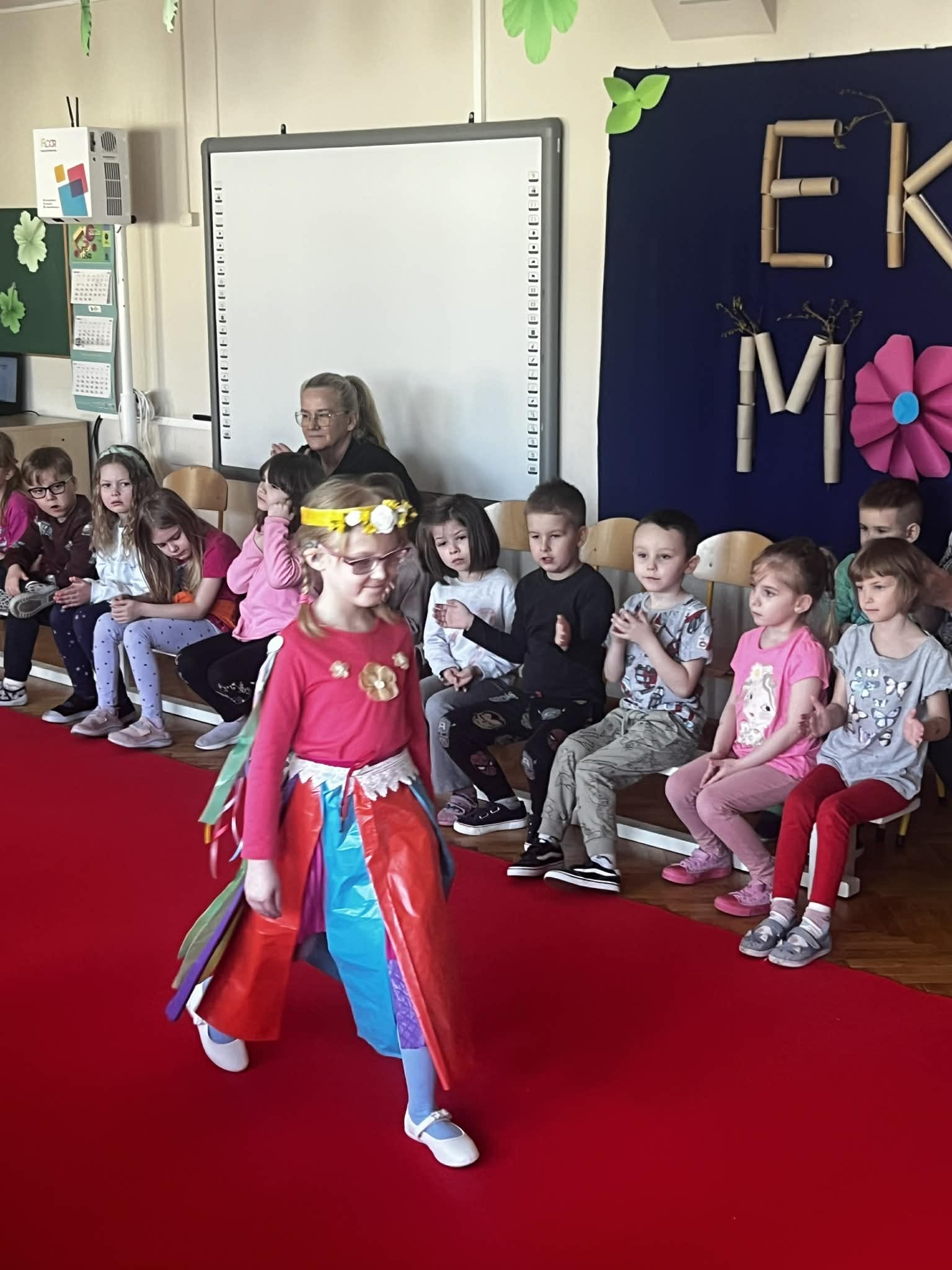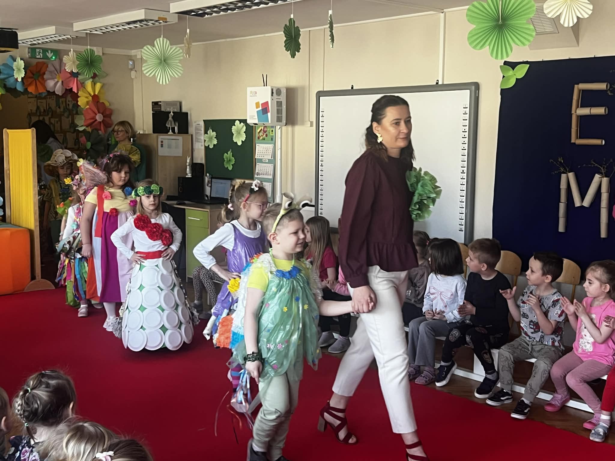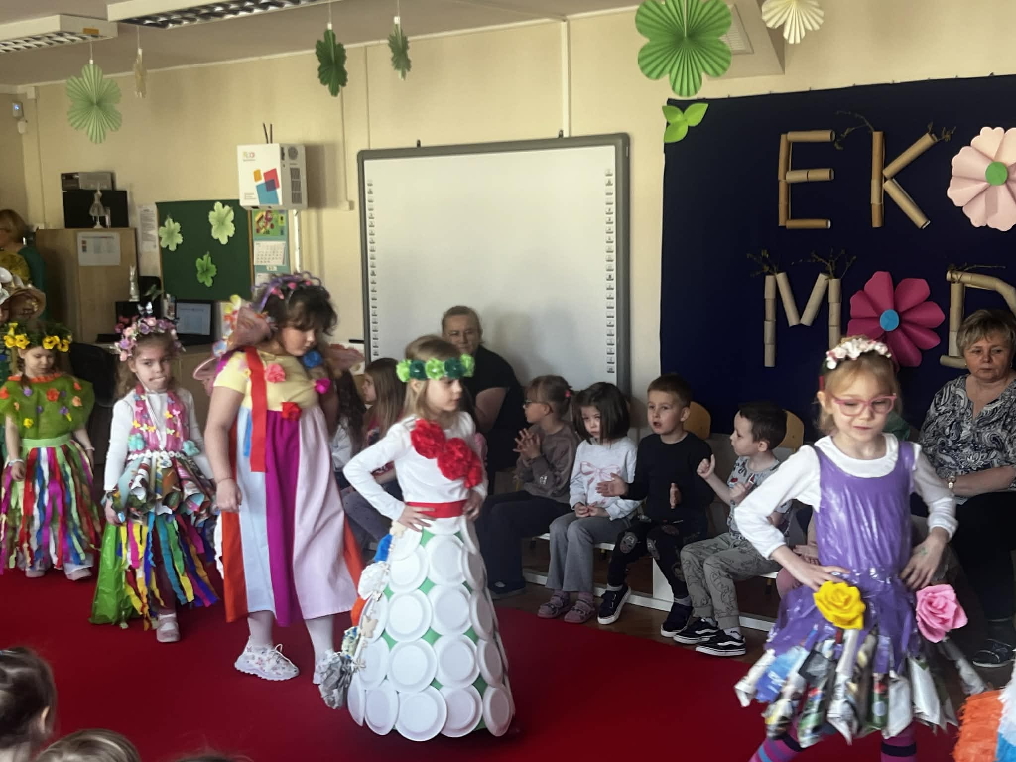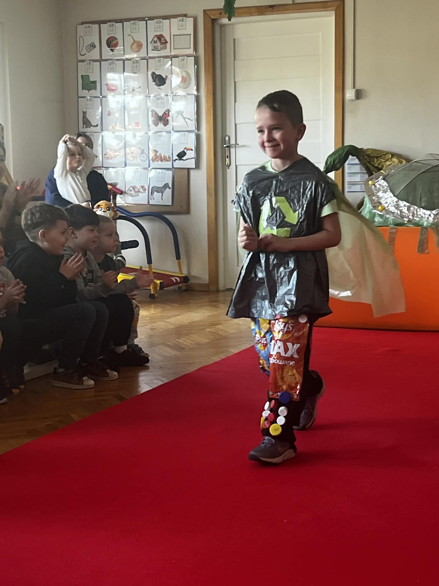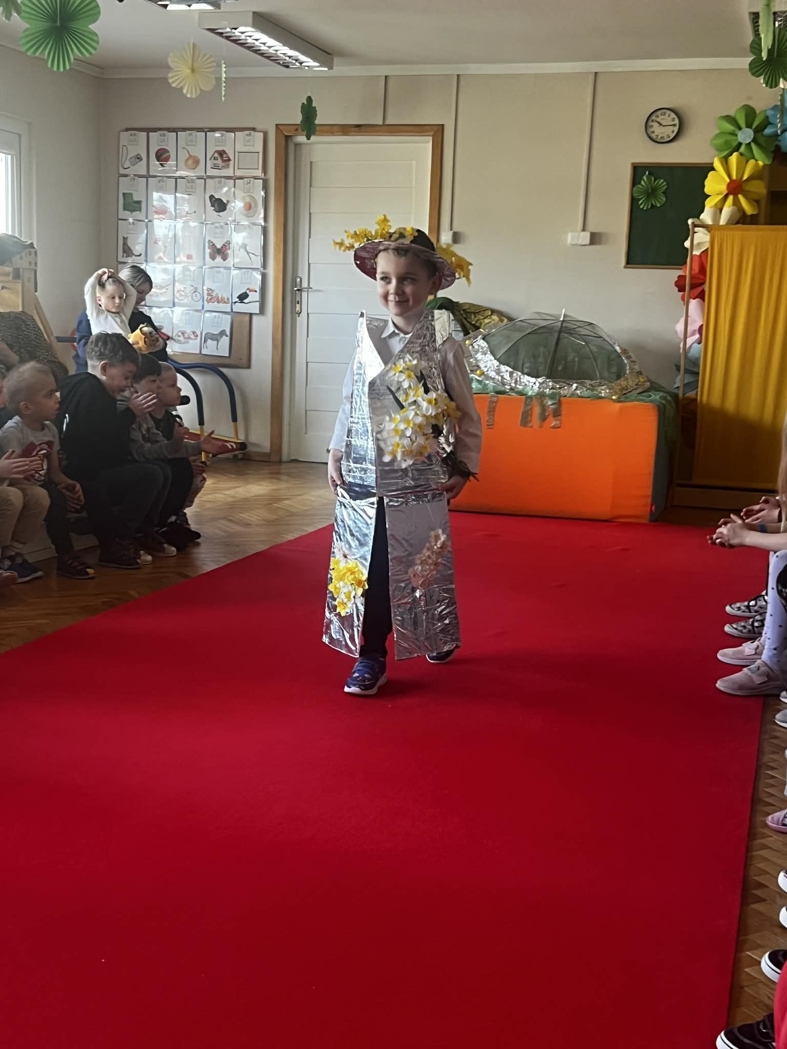 W dniu 24 marca 2026 r. w przedszkolu odbył się ,,Wiosenny pokaz mody". Wydarzenie to było nie tylko okazją do wspaniałej zabawy, ale również cenną lekcją troski o środowisko. Dzieci z grupy ,,Jeżyki" ogromnym zaangażowaniem zaprezentowały stroje przygotowane wspólnie z rodzicami. Wśród kreacji można było podziwiać niezwykle pomysłowe ubrania wykonane z gazet, kartonów, plastikowych butelek, nakrętek czy folii. Nie zabrakło kolorowych sukni, fantazyjnych peleryn, oryginalnych nakryć głowy oraz dodatków, które zachwycały kreatywnością i pomysłowością. Pokaz mody miał również ważny wymiar edukacyjny – dzieci uczyły się, jak poprzez ponowne wykorzystanie różnych materiałów można dbać o naszą planetę. Grupa „Jeżyki” udowodniła, że ekologia może być ciekawa, twórcza i pełna radości.