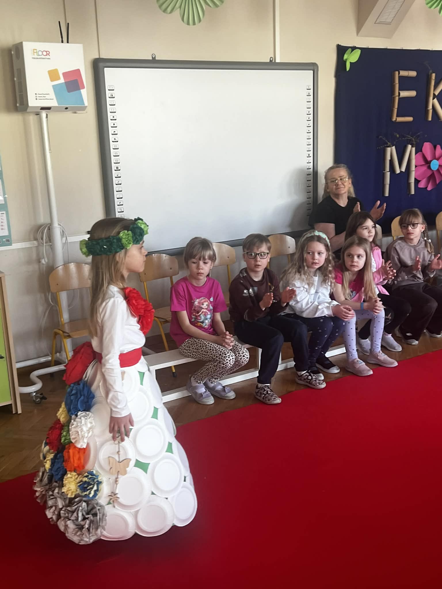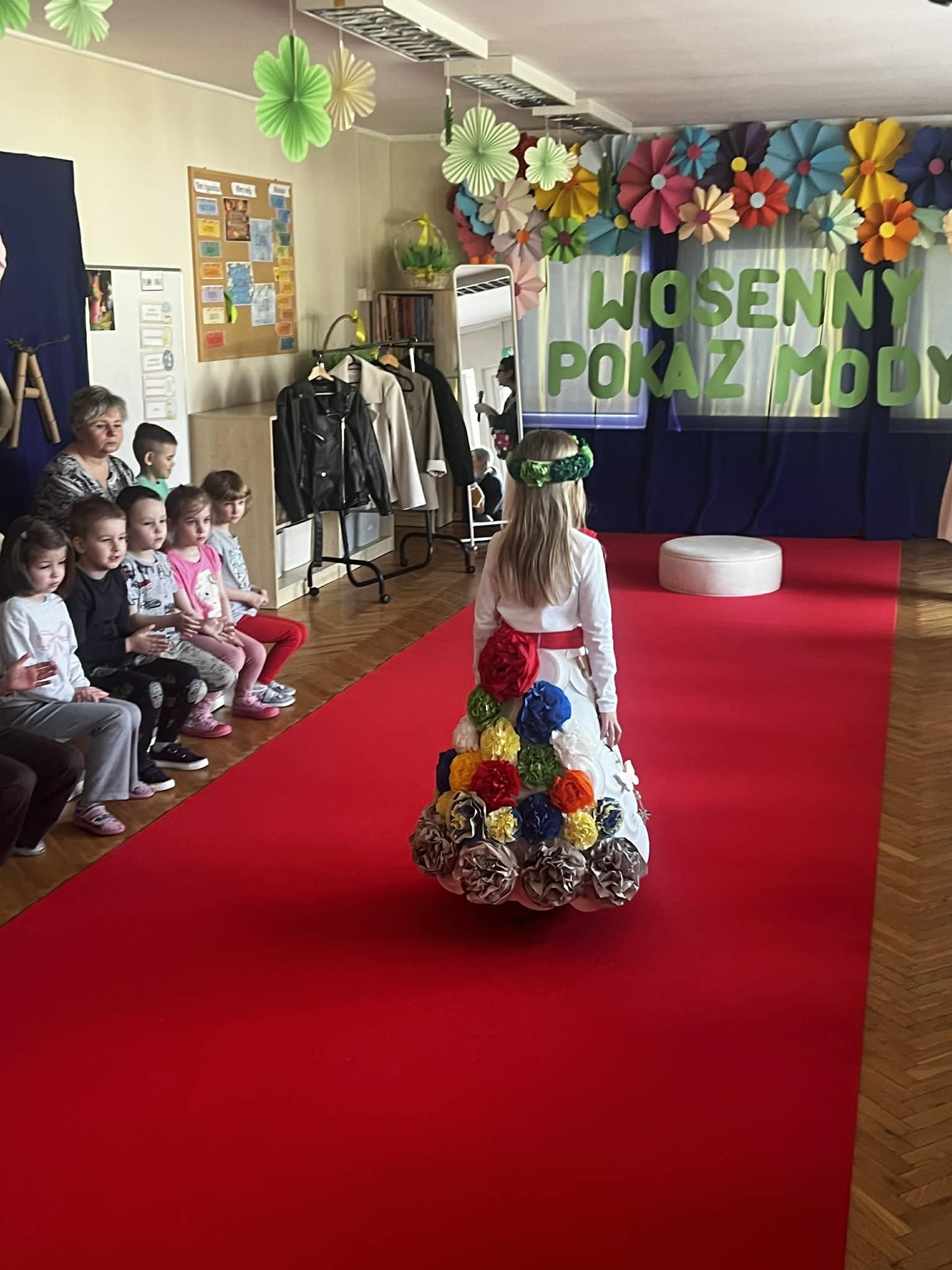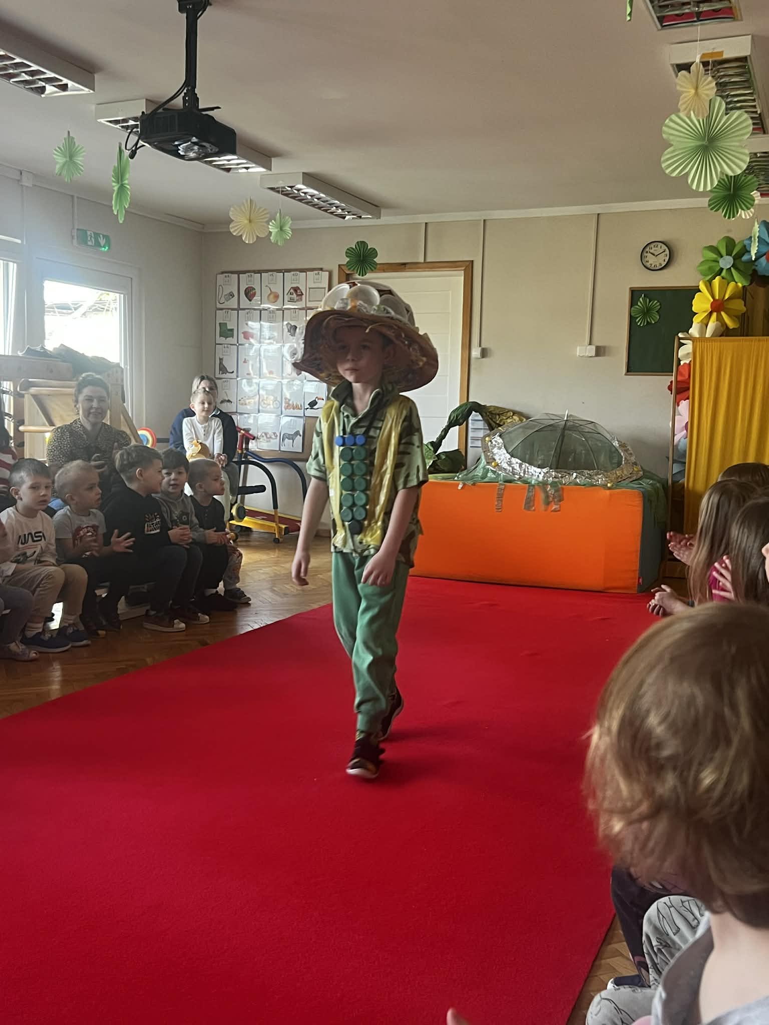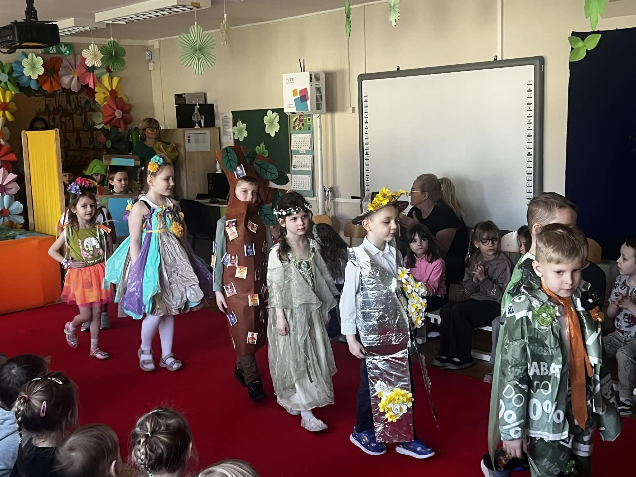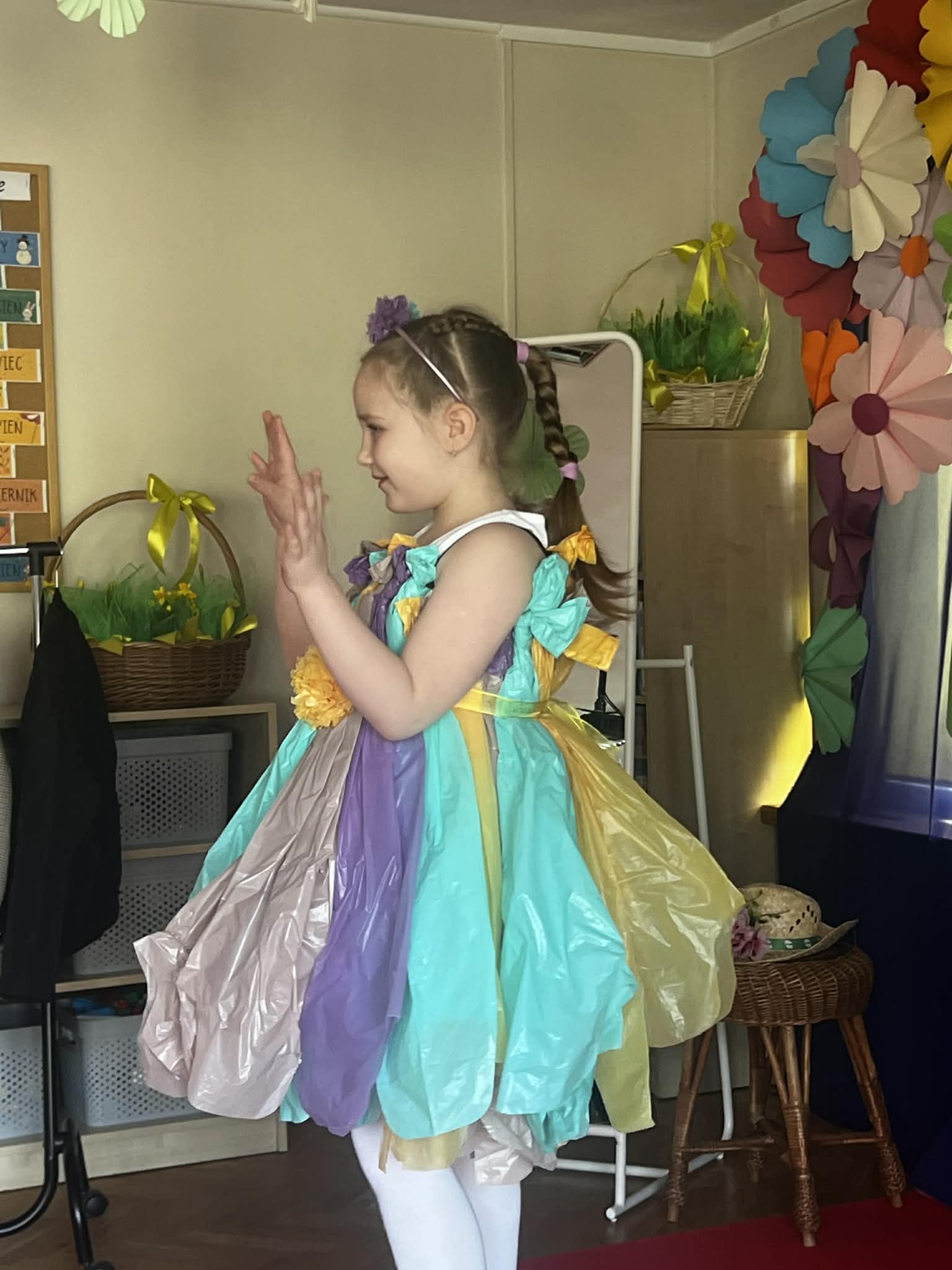 W dniu 24 marca 2026 r. w przedszkolu odbył się ,,Wiosenny pokaz mody". Wydarzenie to było nie tylko okazją do wspaniałej zabawy, ale również cenną lekcją troski o środowisko. Dzieci z grupy ,,Jeżyki" ogromnym zaangażowaniem zaprezentowały stroje przygotowane wspólnie z rodzicami. Wśród kreacji można było podziwiać niezwykle pomysłowe ubrania wykonane z gazet, kartonów, plastikowych butelek, nakrętek czy folii. Nie zabrakło kolorowych sukni, fantazyjnych peleryn, oryginalnych nakryć głowy oraz dodatków, które zachwycały kreatywnością i pomysłowością. Pokaz mody miał również ważny wymiar edukacyjny – dzieci uczyły się, jak poprzez ponowne wykorzystanie różnych materiałów można dbać o naszą planetę. Grupa „Jeżyki” udowodniła, że ekologia może być ciekawa, twórcza i pełna radości.