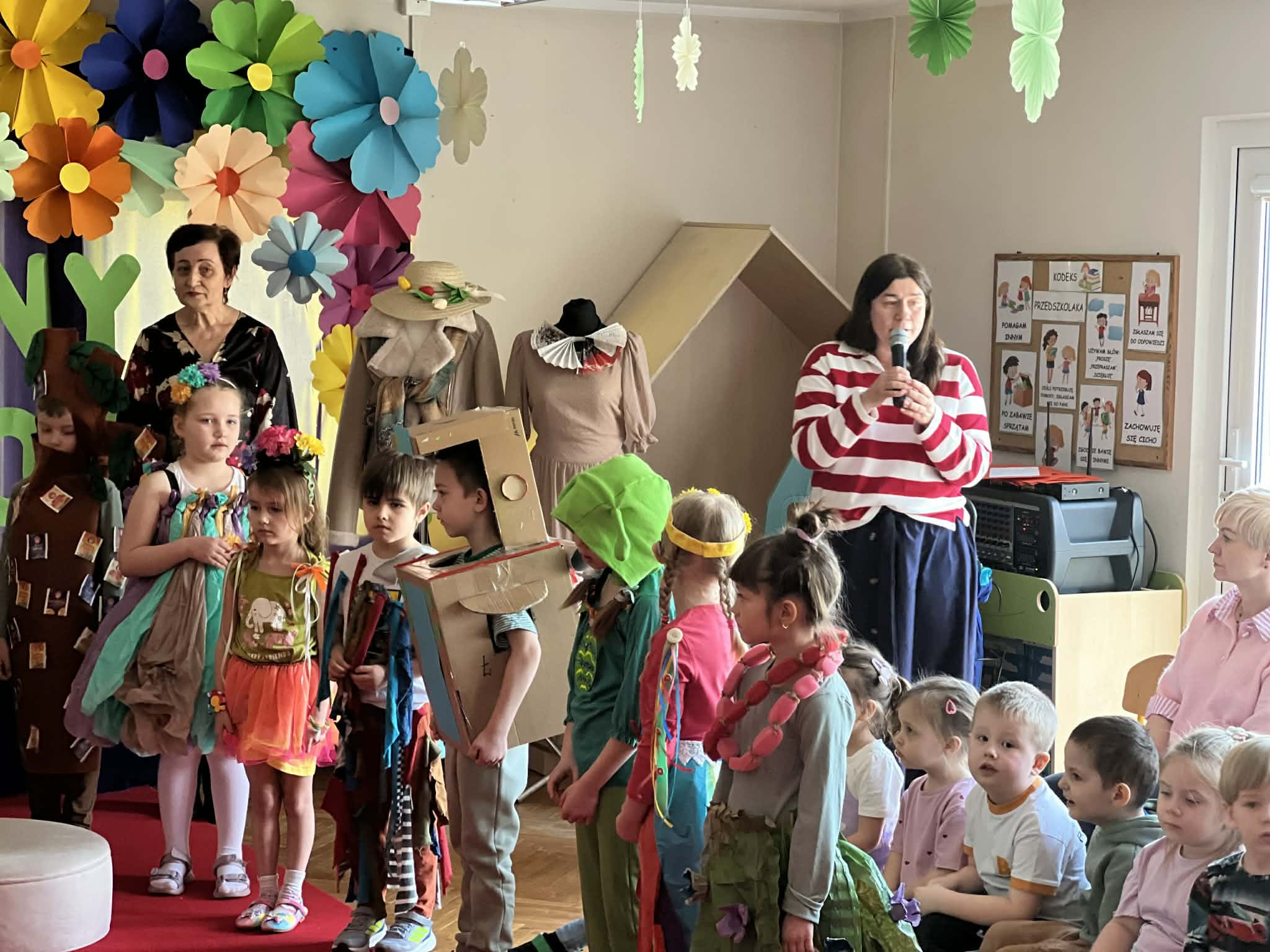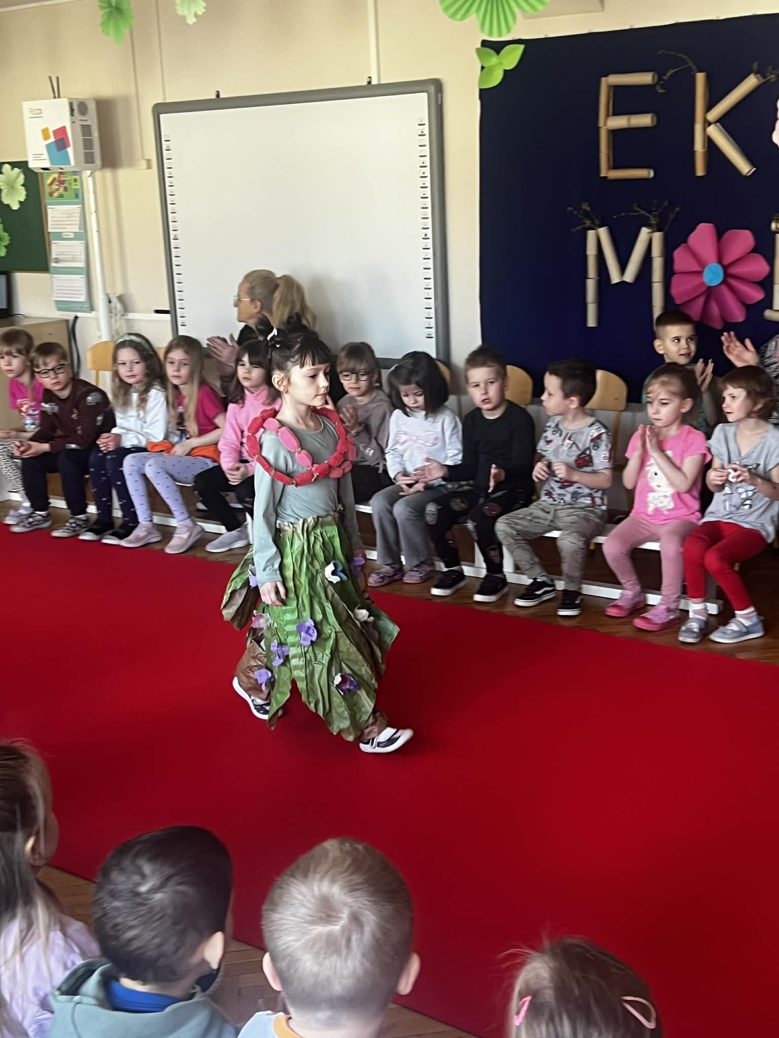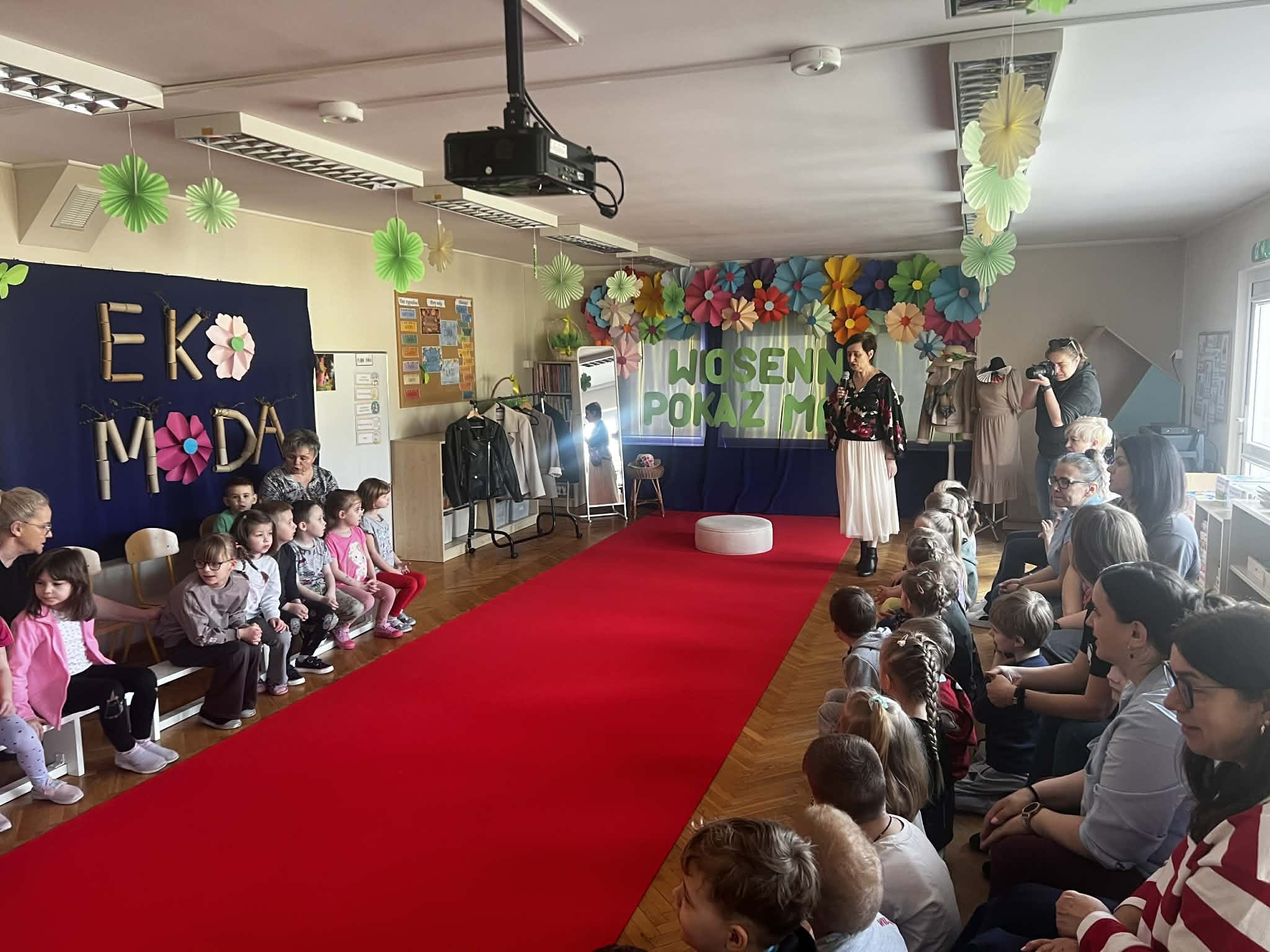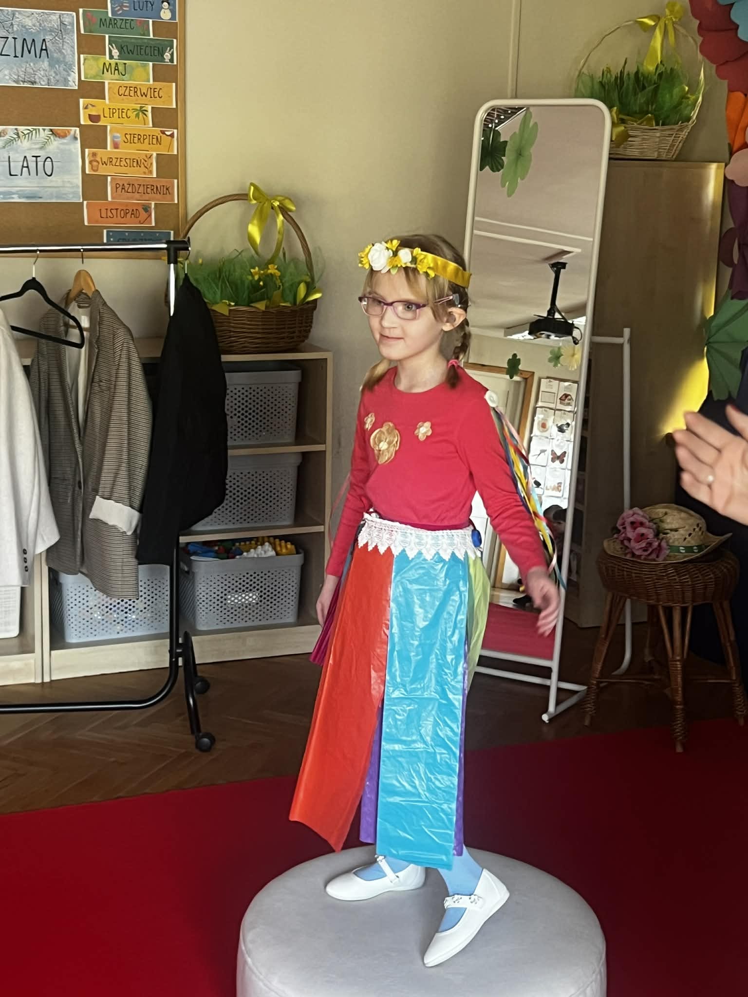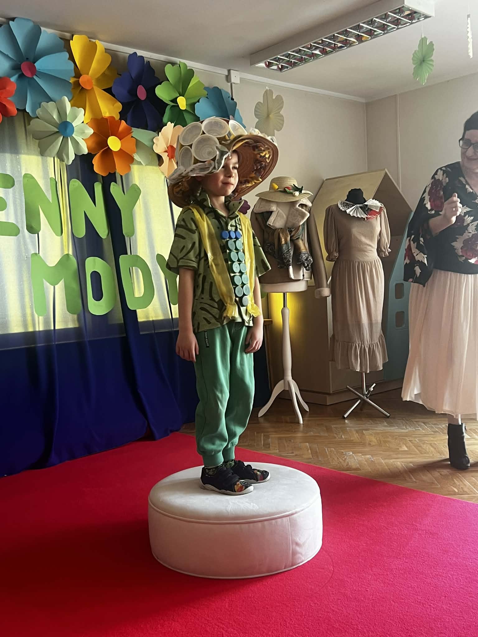 W dniu 24 marca 2026 r. w przedszkolu odbył się ,,Wiosenny pokaz mody". Wydarzenie to było nie tylko okazją do wspaniałej zabawy, ale również cenną lekcją troski o środowisko. Dzieci z grupy ,,Jeżyki" ogromnym zaangażowaniem zaprezentowały stroje przygotowane wspólnie z rodzicami. Wśród kreacji można było podziwiać niezwykle pomysłowe ubrania wykonane z gazet, kartonów, plastikowych butelek, nakrętek czy folii. Nie zabrakło kolorowych sukni, fantazyjnych peleryn, oryginalnych nakryć głowy oraz dodatków, które zachwycały kreatywnością i pomysłowością. Pokaz mody miał również ważny wymiar edukacyjny – dzieci uczyły się, jak poprzez ponowne wykorzystanie różnych materiałów można dbać o naszą planetę. Grupa „Jeżyki” udowodniła, że ekologia może być ciekawa, twórcza i pełna radości.