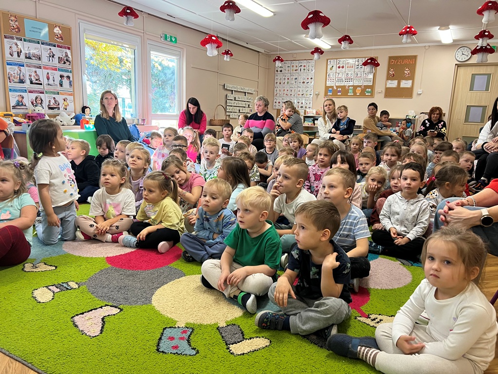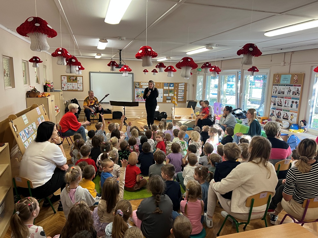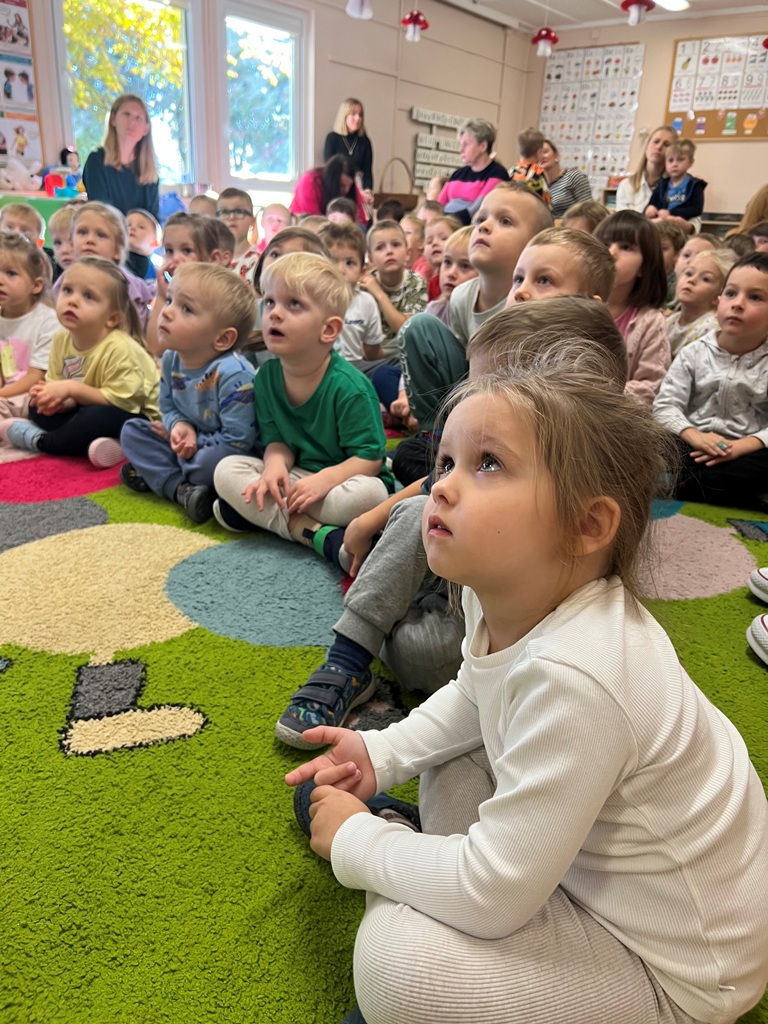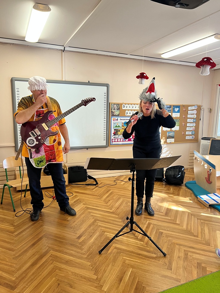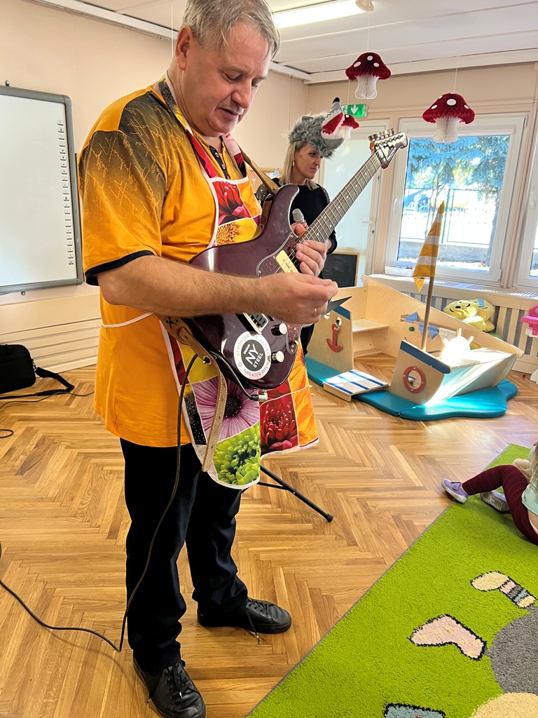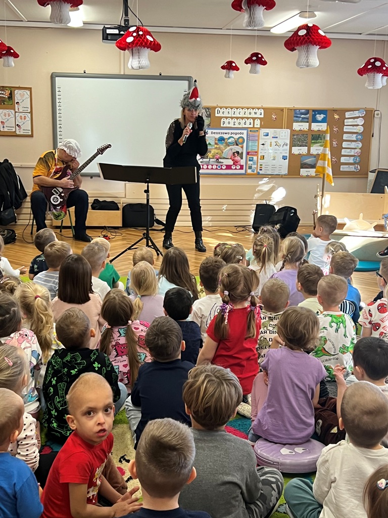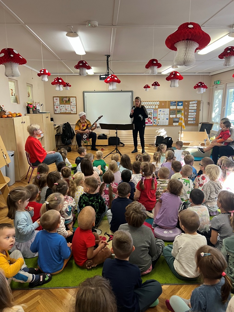 W poniedziałek 20 października 2025 r. Lawendowe Studio zagrało w przedszkolu wyjątkowy koncert – bajkę „Czerwony Kapturek" opowiedzianą dźwiękami gitary elektrycznej! Dzieci mogły posłuchać znanej historii w zupełnie nowej, pełnej energii odsłonie. Rockowe brzmienia mieszały się z melodyjnymi fragmentami, a mali widzowie z zapartym tchem śledzili przygody Czerwonego Kapturka i spotkanie z wilkiem.