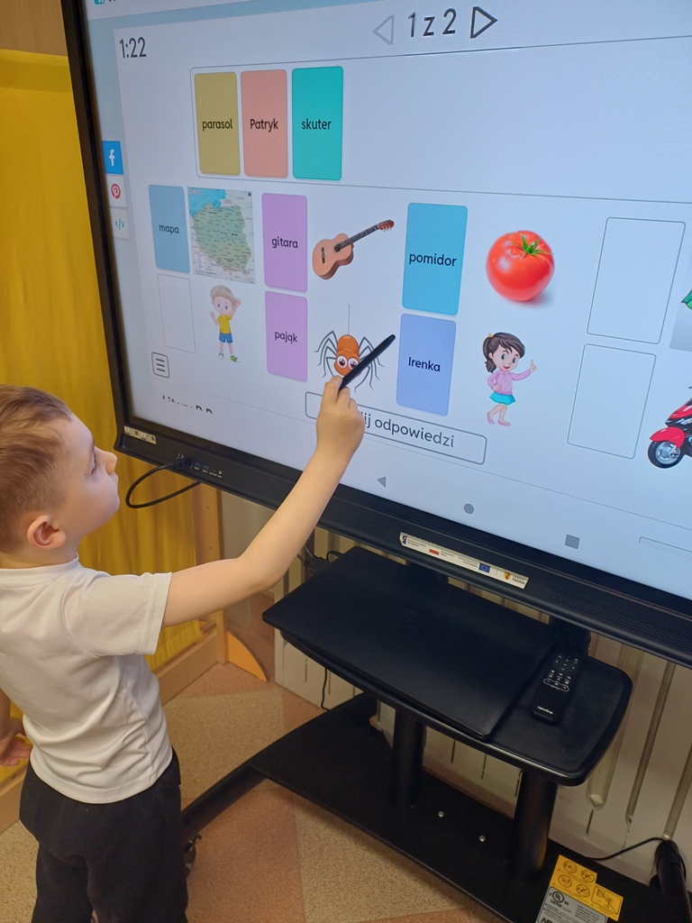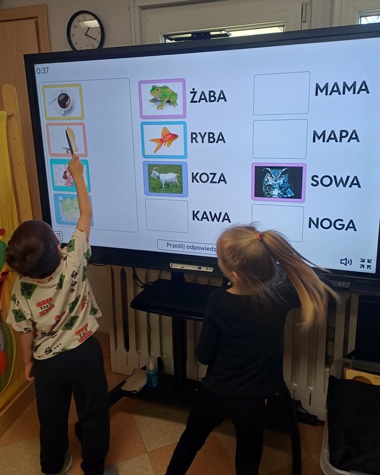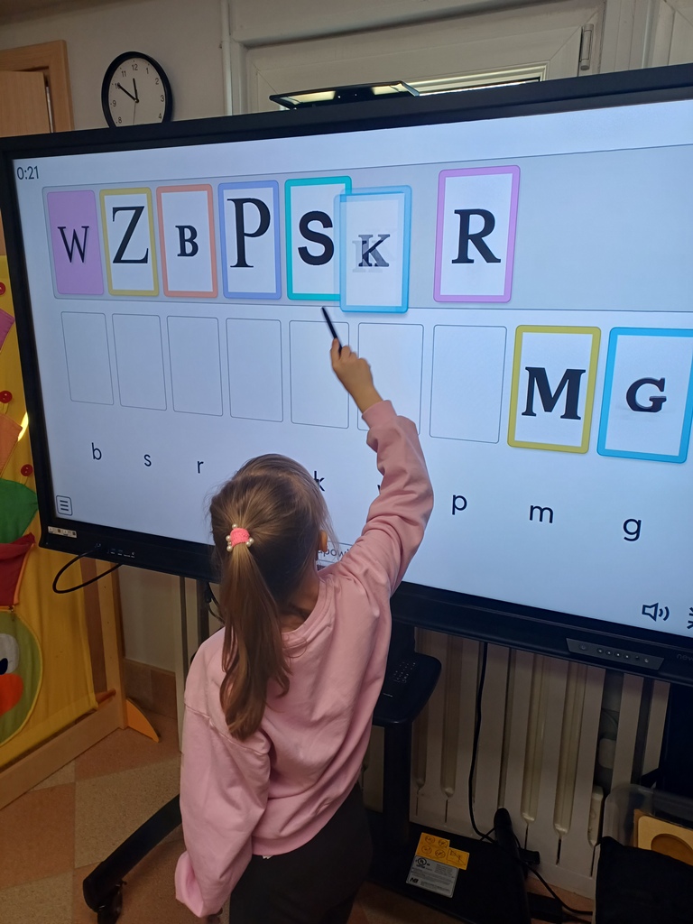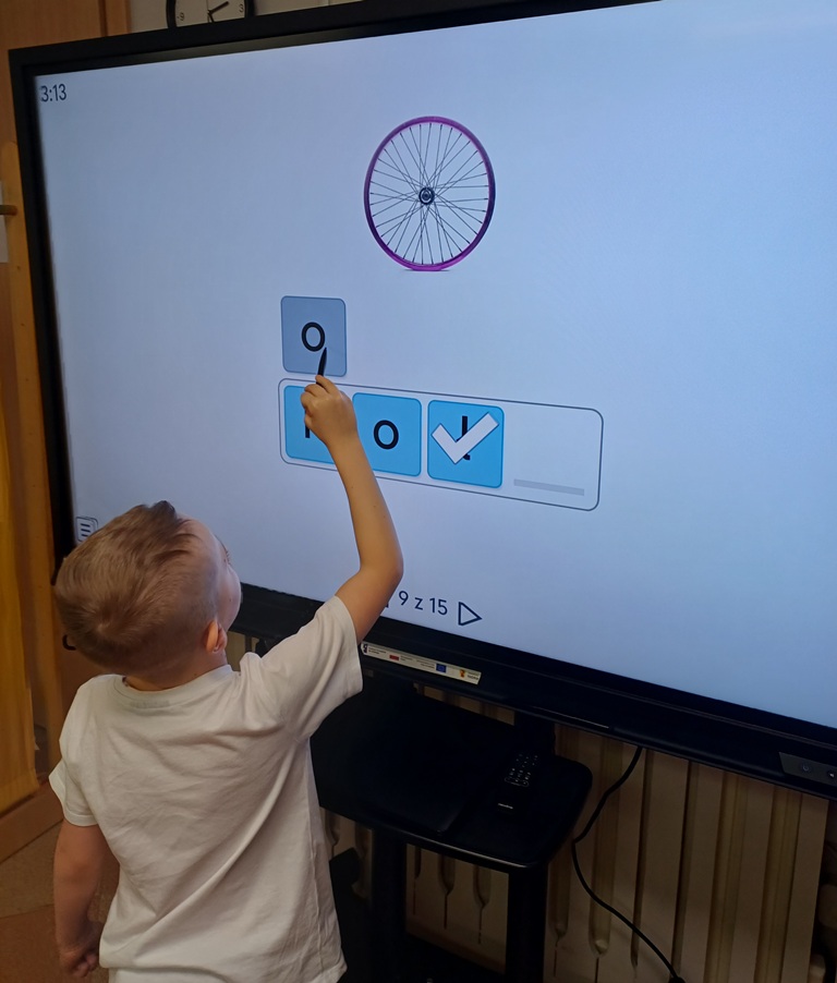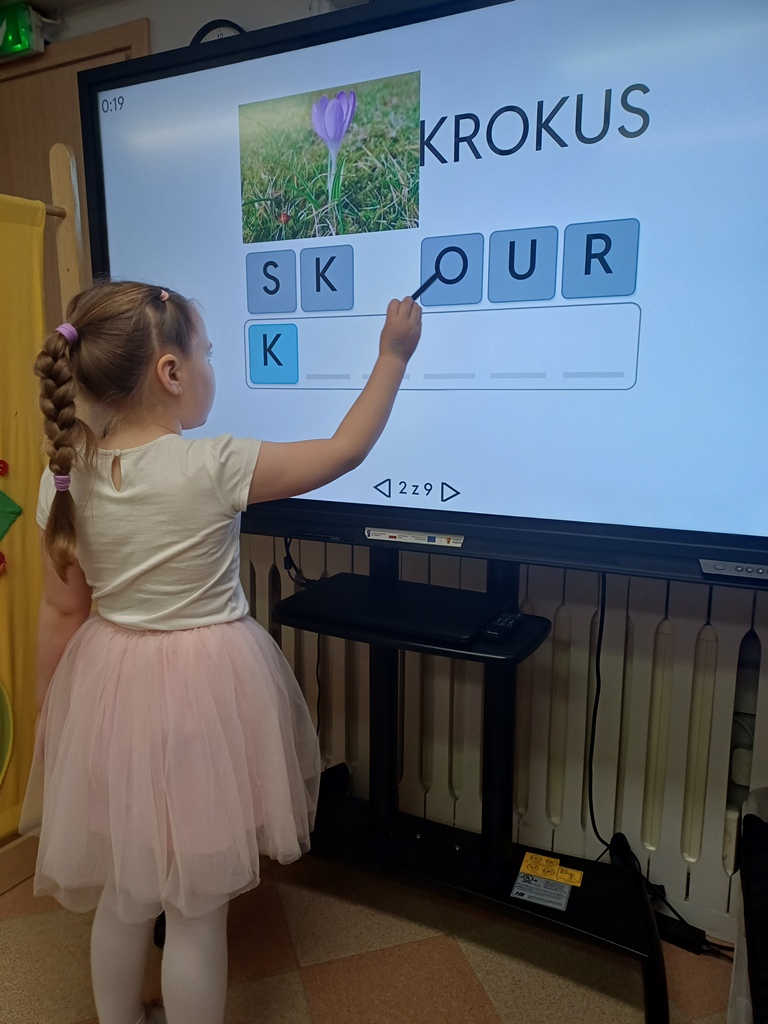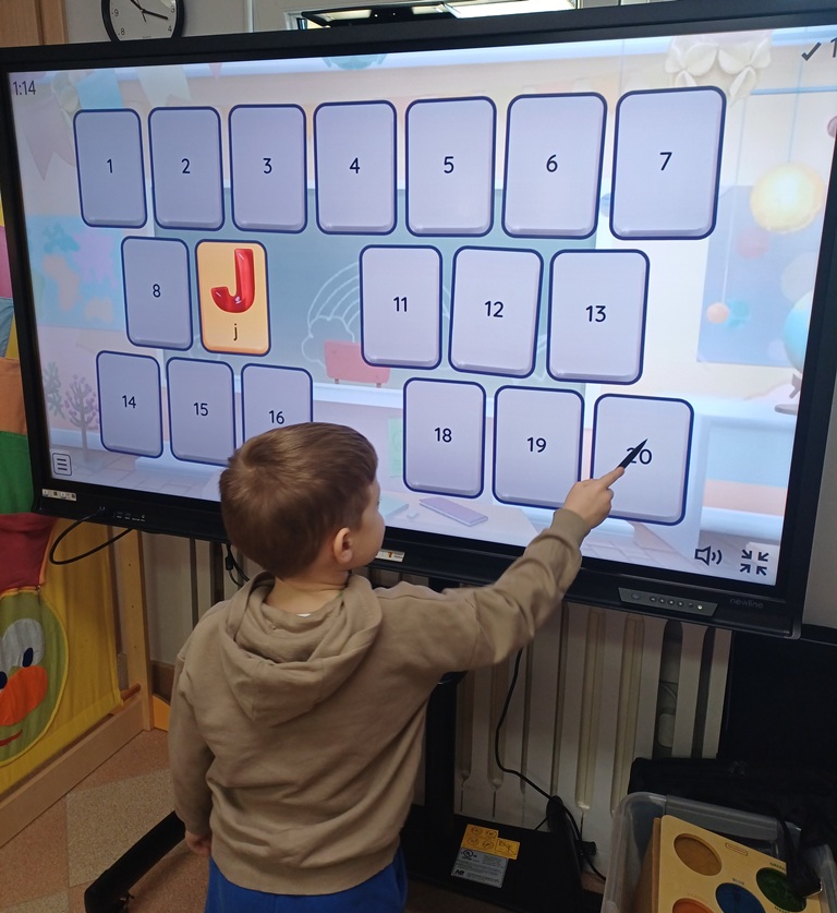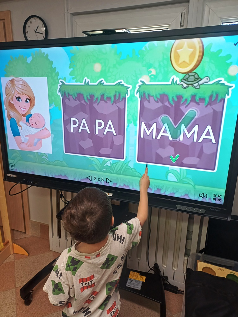Dzieci z grup „Wiewiórki" i „Jeżyki" z wielkim zaangażowaniem uczestniczą w zajęciach rozwijających kompetencje cyfrowe oraz przygotowujących je do podjęcia nauki w szkole. Podczas pracy z monitorem i interaktywnymi programami edukacyjnymi 6-latki poznają literki, łączą je w sylaby, a następnie tworzą pierwsze wyrazy.