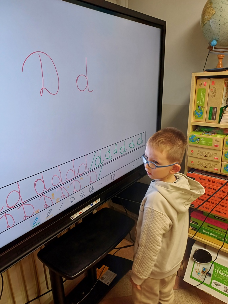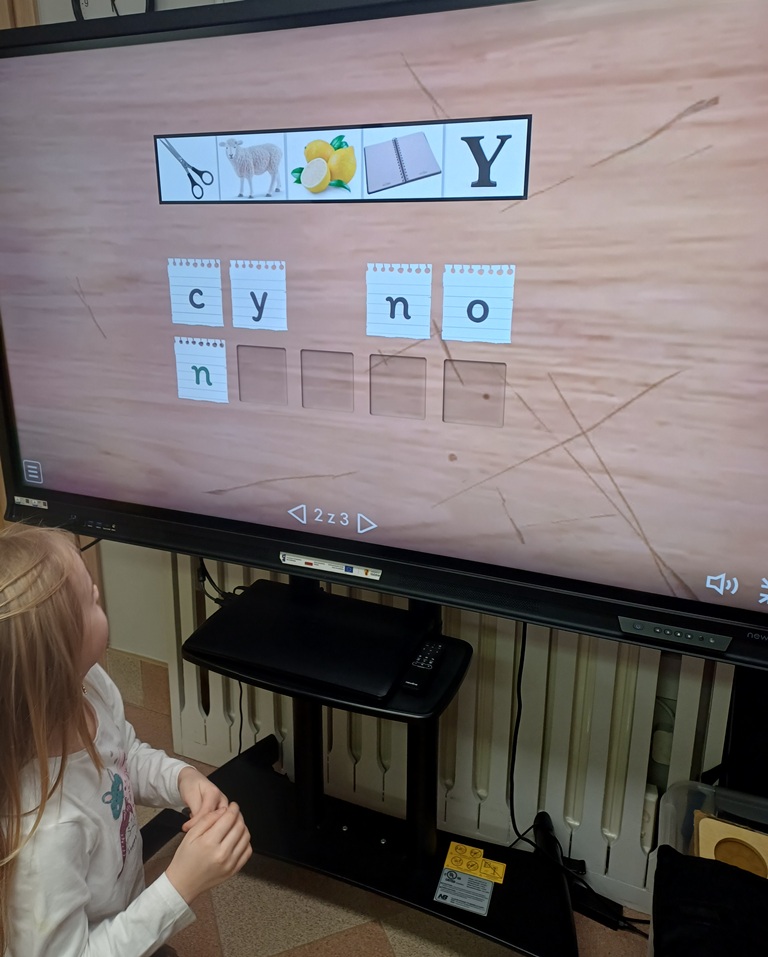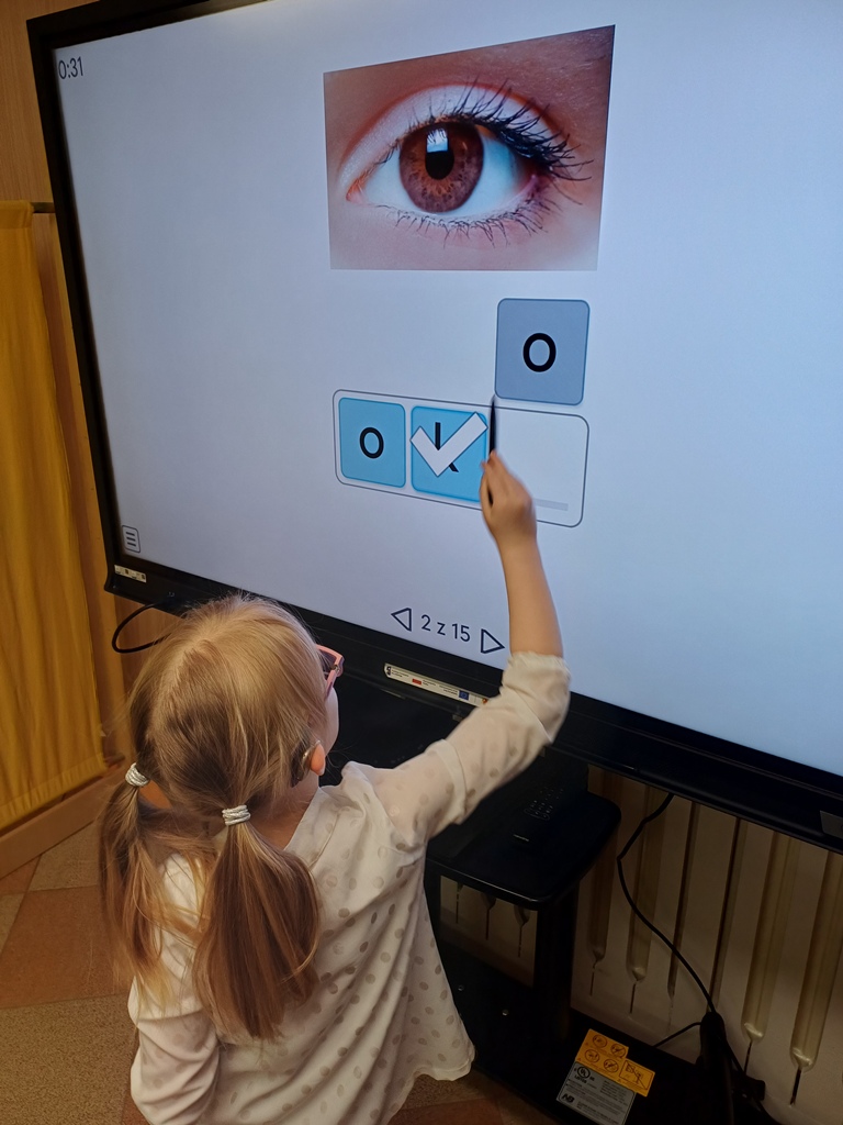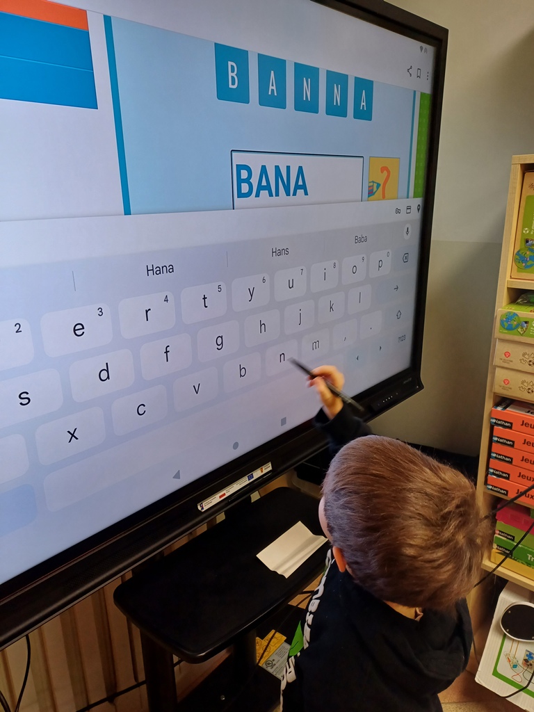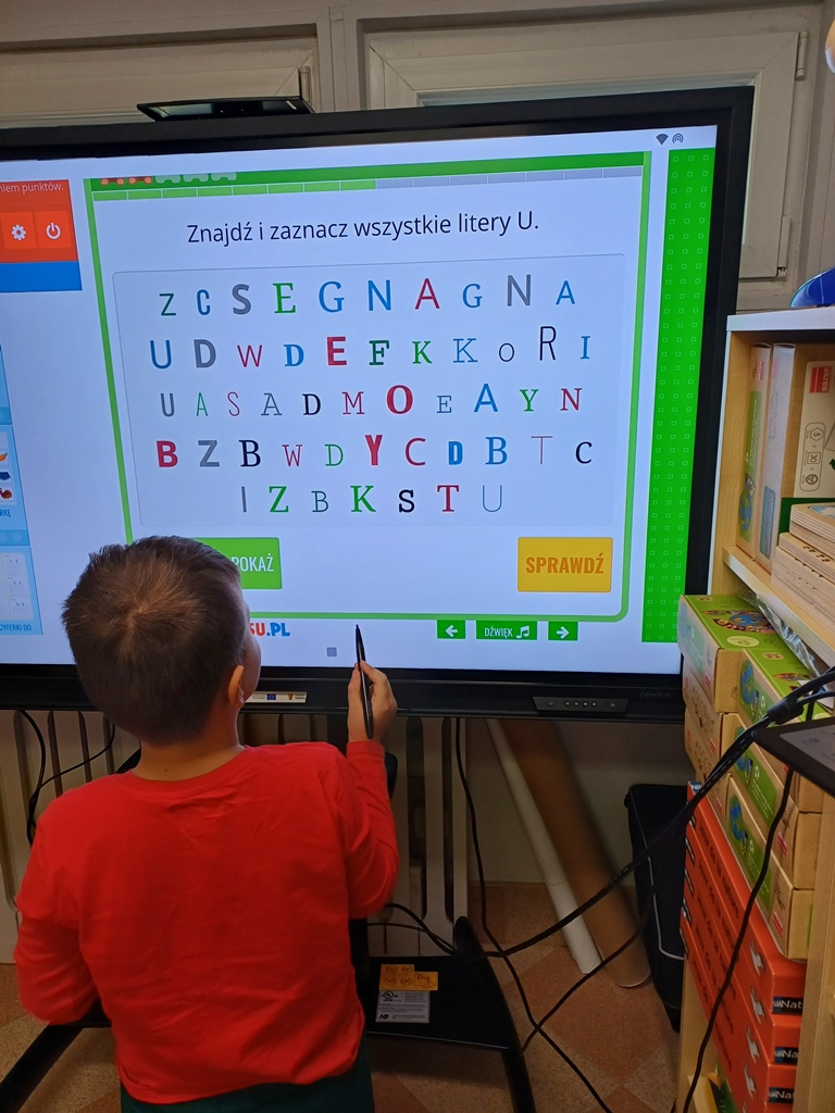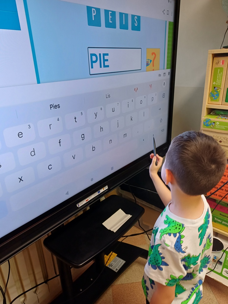Dzieci z grup „Wiewiórki" i „Jeżyki" z wielkim zaangażowaniem uczestniczą w zajęciach rozwijających kompetencje cyfrowe oraz przygotowujących je do podjęcia nauki w szkole. Podczas pracy z monitorem i interaktywnymi programami edukacyjnymi 6-latki poznają literki, łączą je w sylaby, a następnie tworzą pierwsze wyrazy.