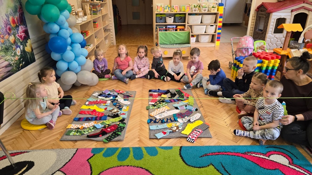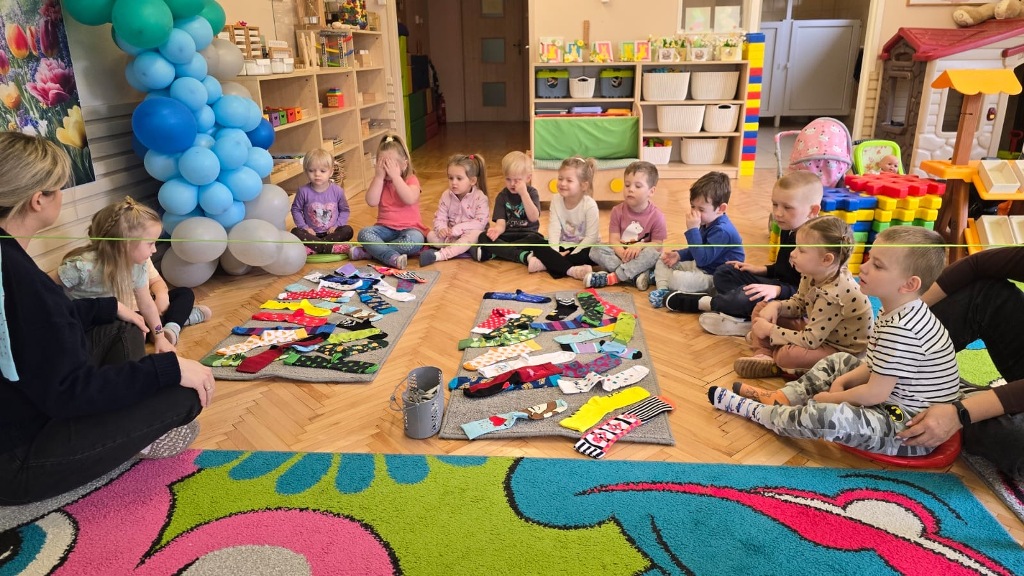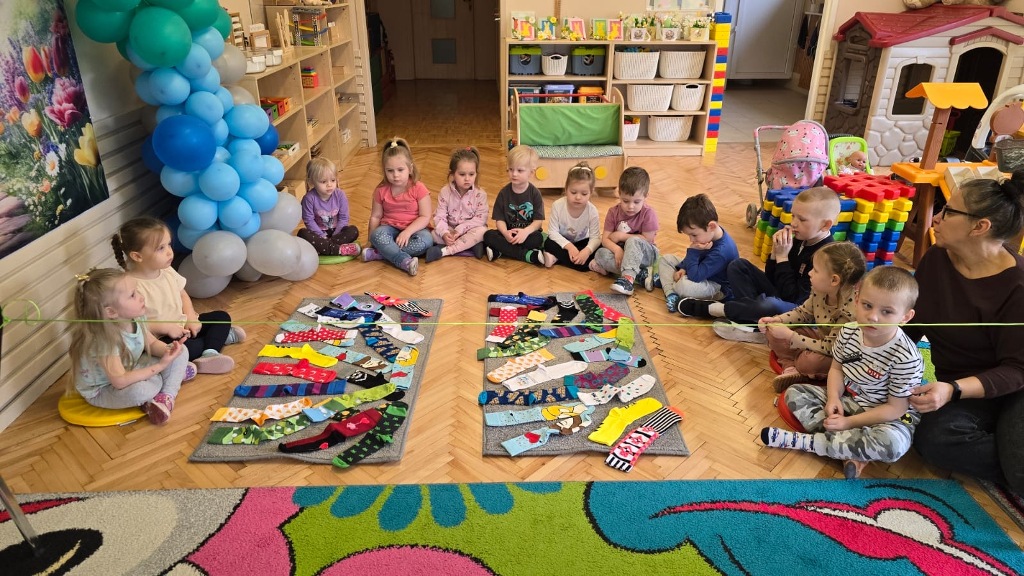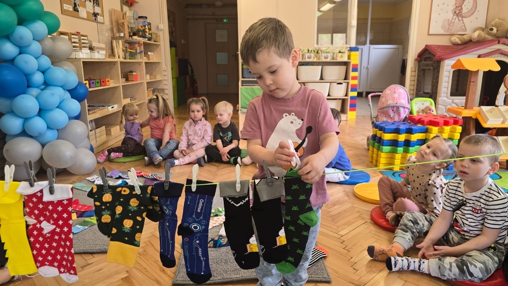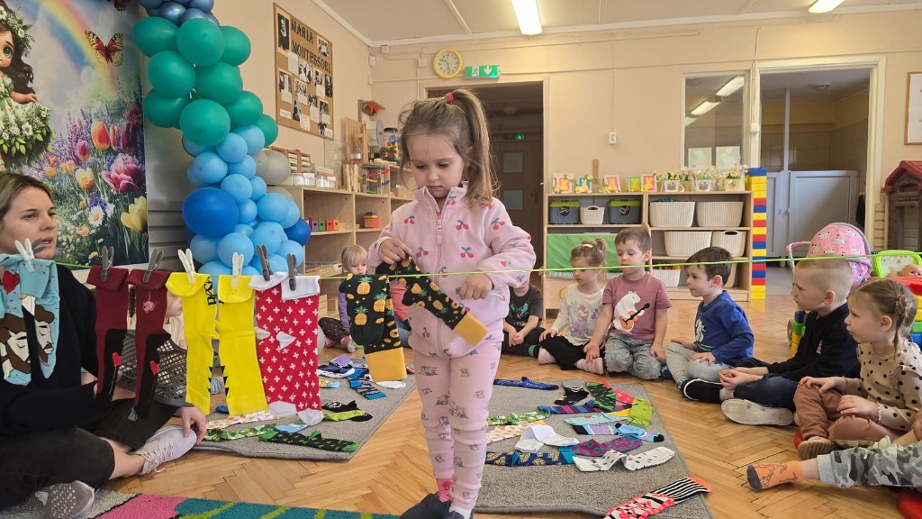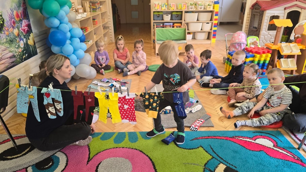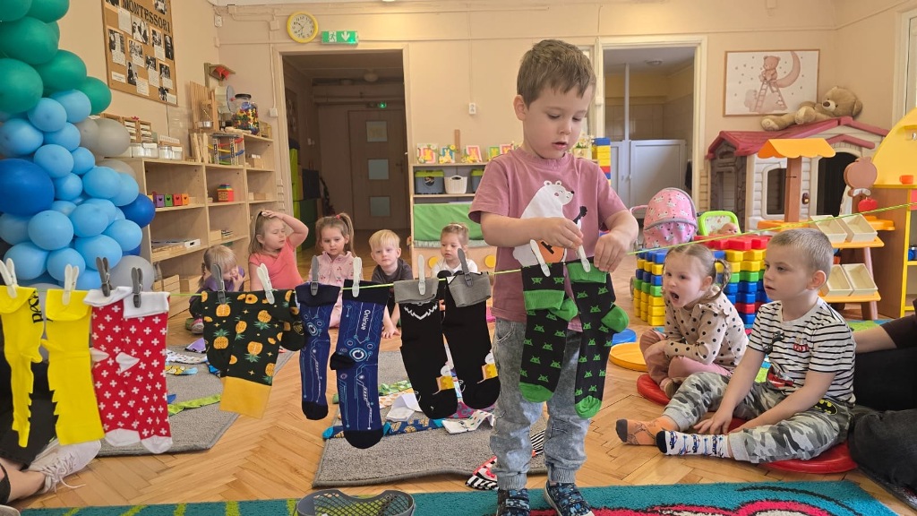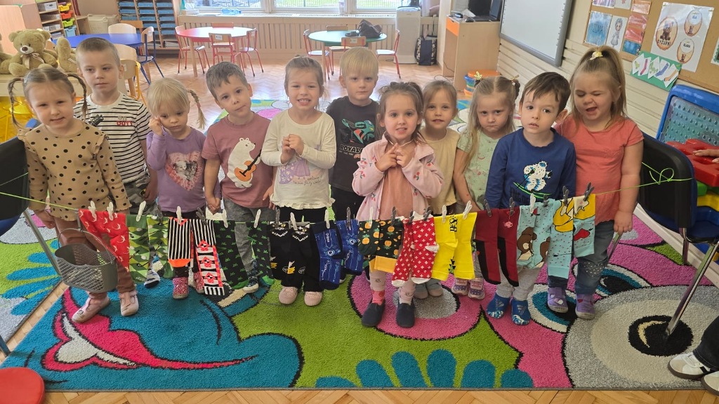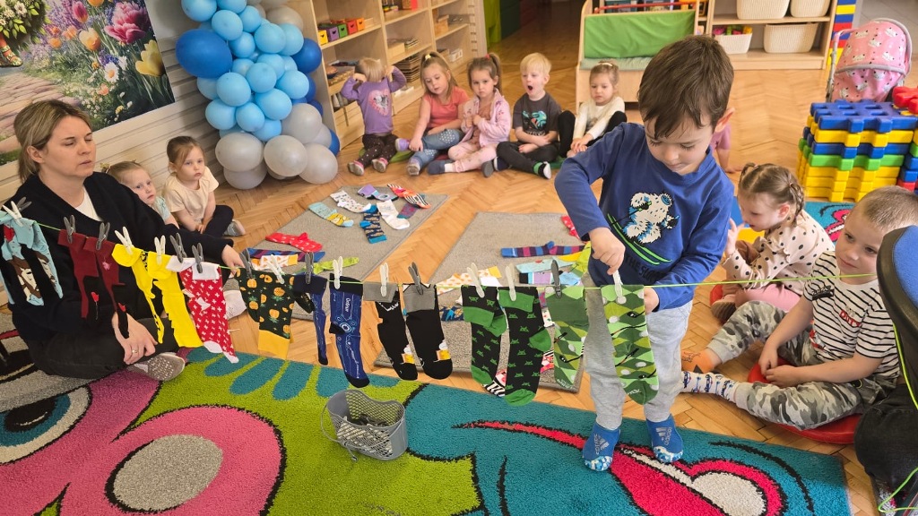Nawiązując do tego wydarzenia, podczas lekcji ciszy dzieci otrzymały zadanie polegające na odnalezieniu i dopasowaniu skarpetek w pary. Każde dziecko pracowało samodzielnie, starając się w ciszy i skupieniu odnaleźć odpowiednie pary pod względem koloru, wzoru i wielkości. Zadanie wymagało spostrzegawczości, cierpliwości oraz dokładności.