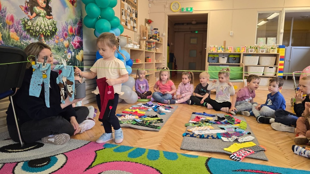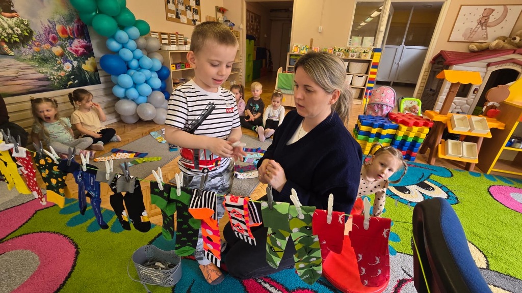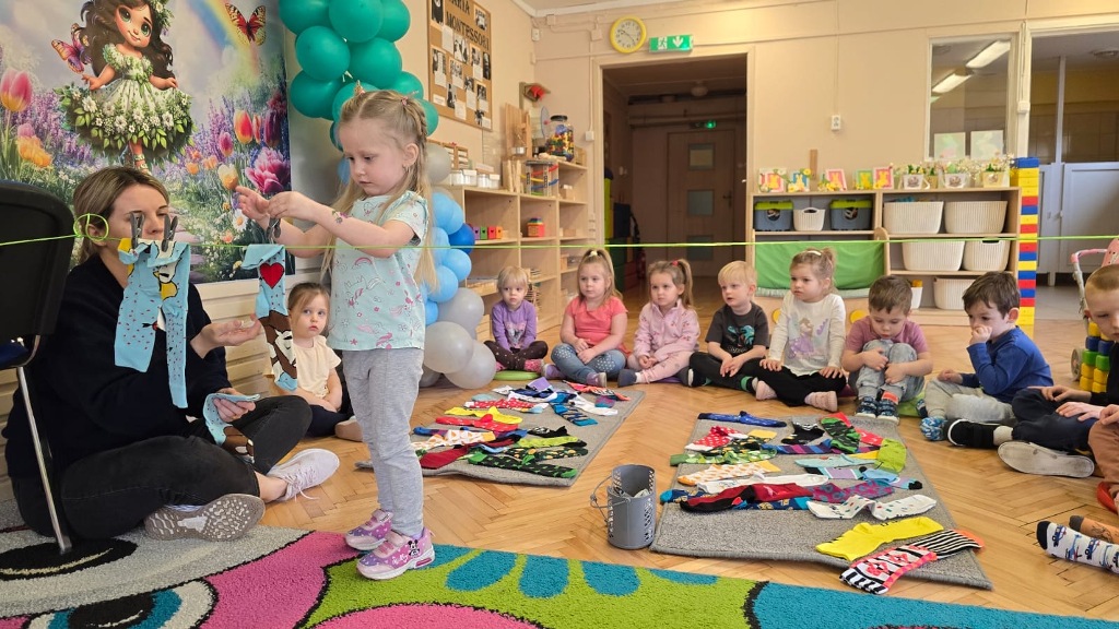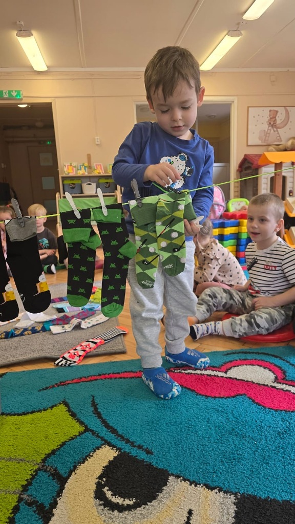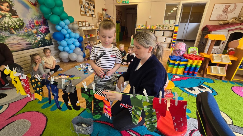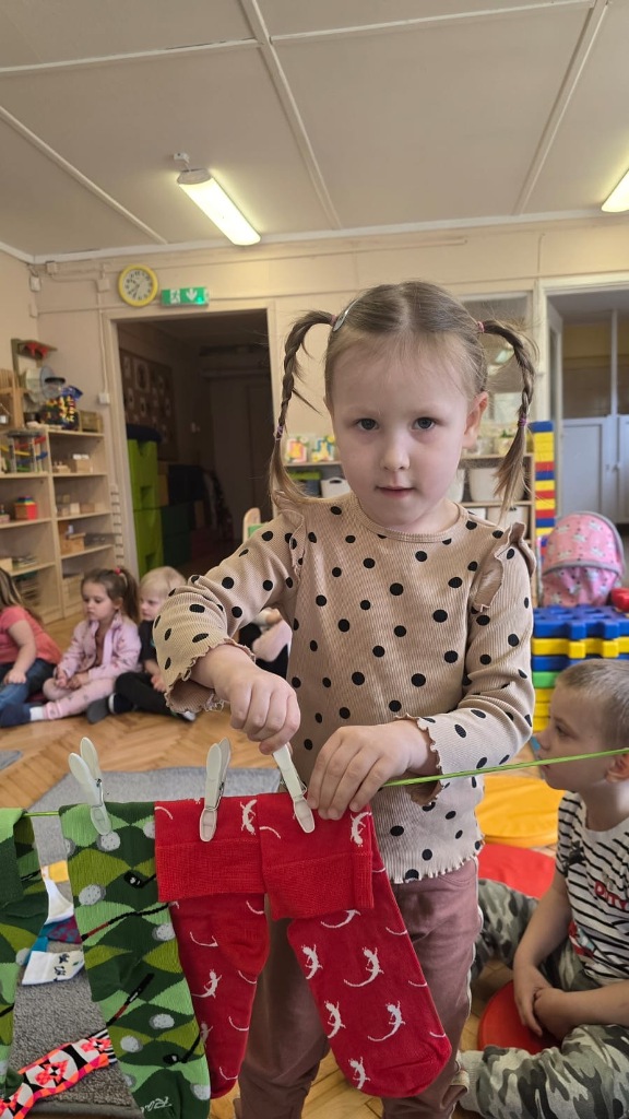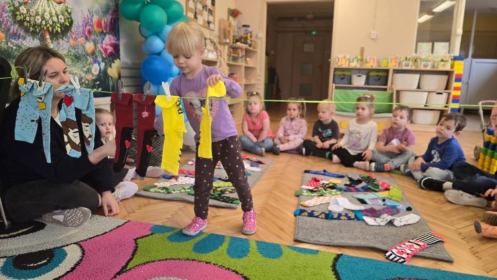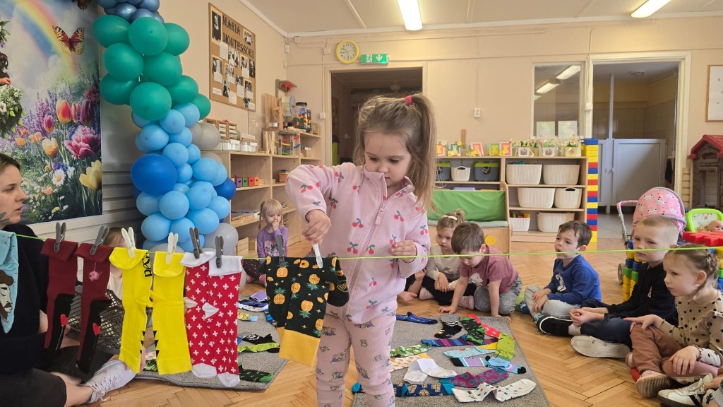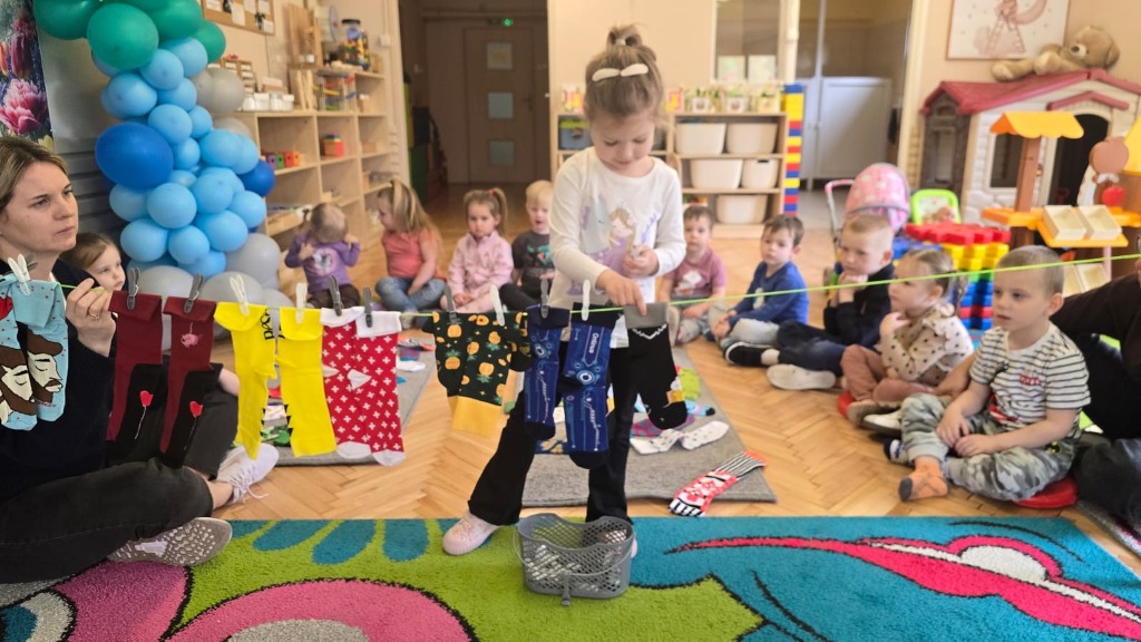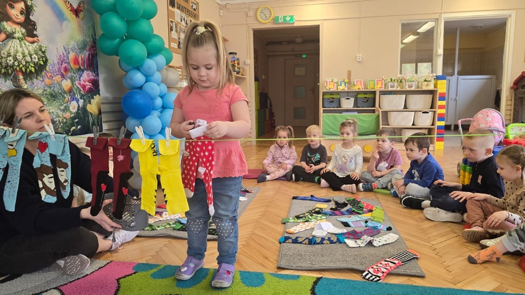 Nawiązując do tego wydarzenia, podczas lekcji ciszy dzieci otrzymały zadanie polegające na odnalezieniu i dopasowaniu skarpetek w pary. Każde dziecko pracowało samodzielnie, starając się w ciszy i skupieniu odnaleźć odpowiednie pary pod względem koloru, wzoru i wielkości. Zadanie wymagało spostrzegawczości, cierpliwości oraz dokładności.