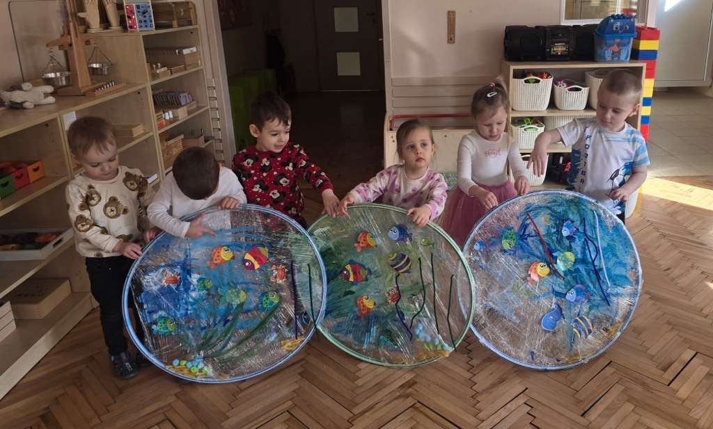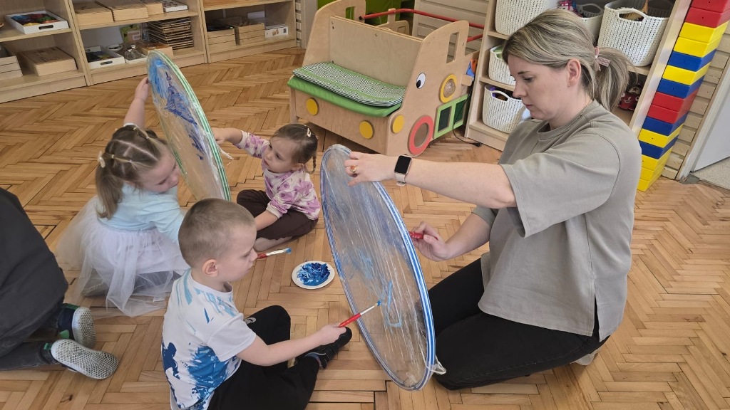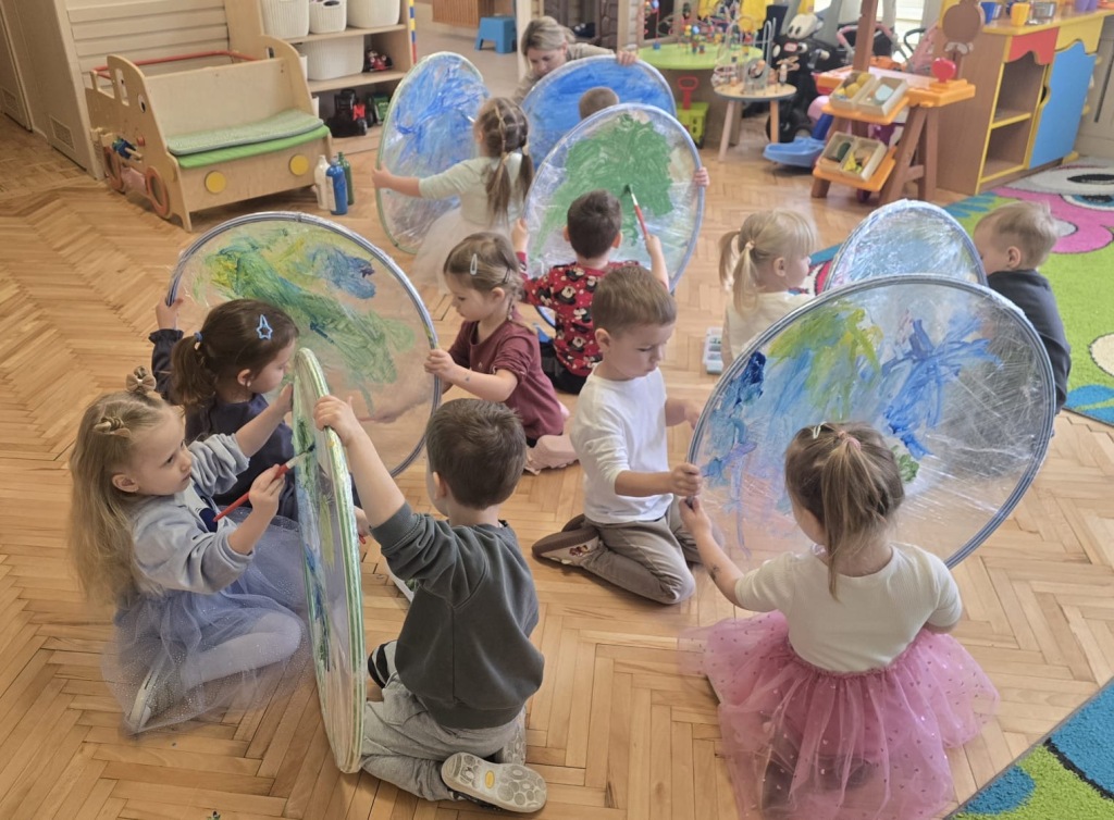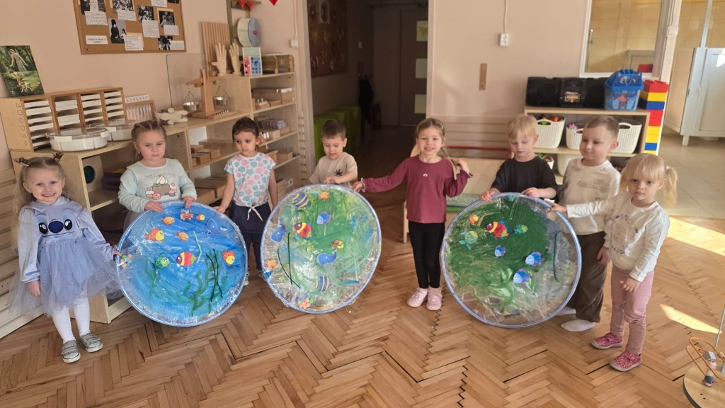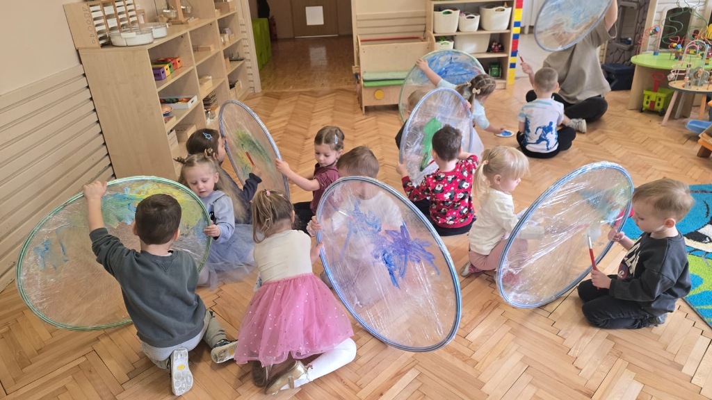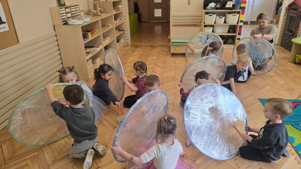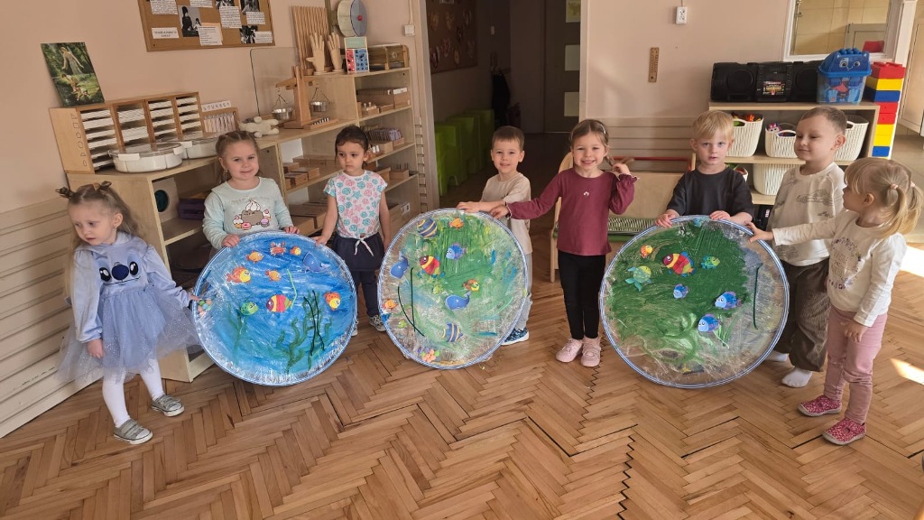 Dziś dzieci z grupy Niedźwiadki uczestniczyły w wielozmysłowych zajęciach plastycznych, tworząc zbiorową wizję oceanu na folii stretch. Głównym elementem zajęć było połączenie ekspresji malarskiej z aktywnym słuchaniem muzyki klasycznej- muzyki o tematyce wodnej. Spokojne tempo utworów klasycznych sprzyjało skupieniu uwagi na precyzyjnych ruchach pędzla. Malowanie na wspólnej, dużej płaszczyźnie folii stretch wymuszało współpracę i wzajemne dopasowanie swoich wizji artystycznych. Dzięki kojącym dźwiękom muzyki klasycznej, prace zyskały niezwykłą płynność i bogactwo barw. Dzieci z dużym zaangażowaniem tworzyły falujące wodorosty i kolorowe rybki, reagując dynamiką ruchów na zmiany w brzmieniu instrumentów.