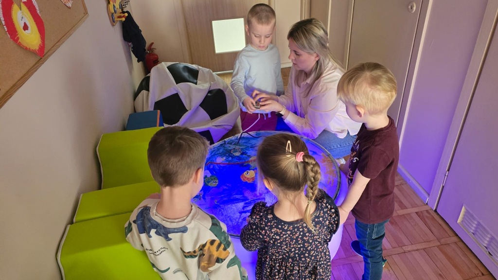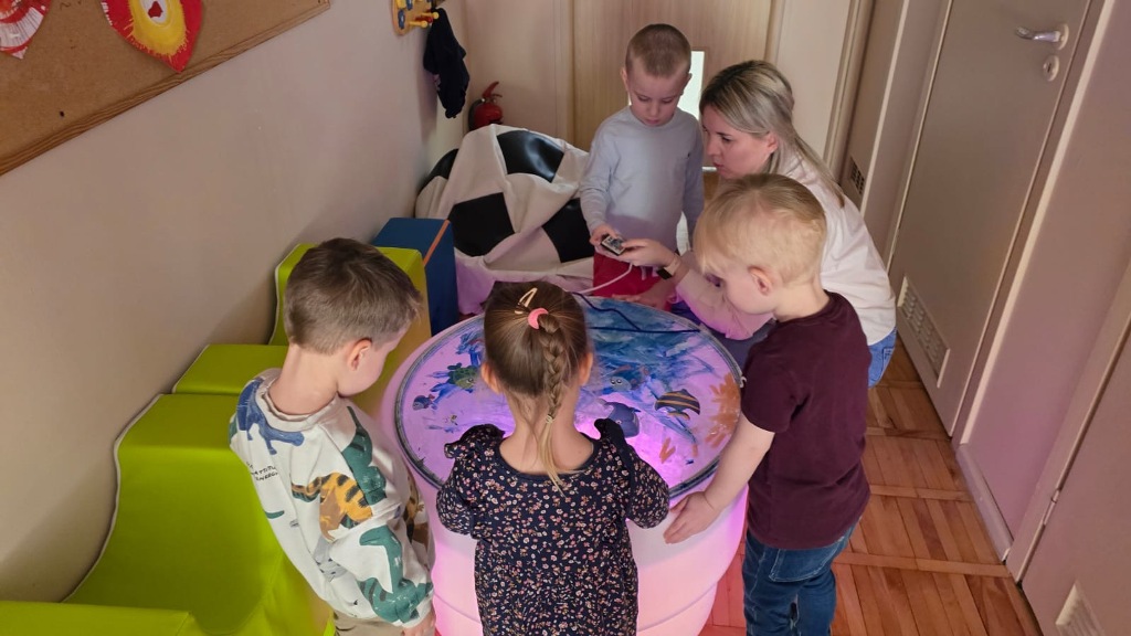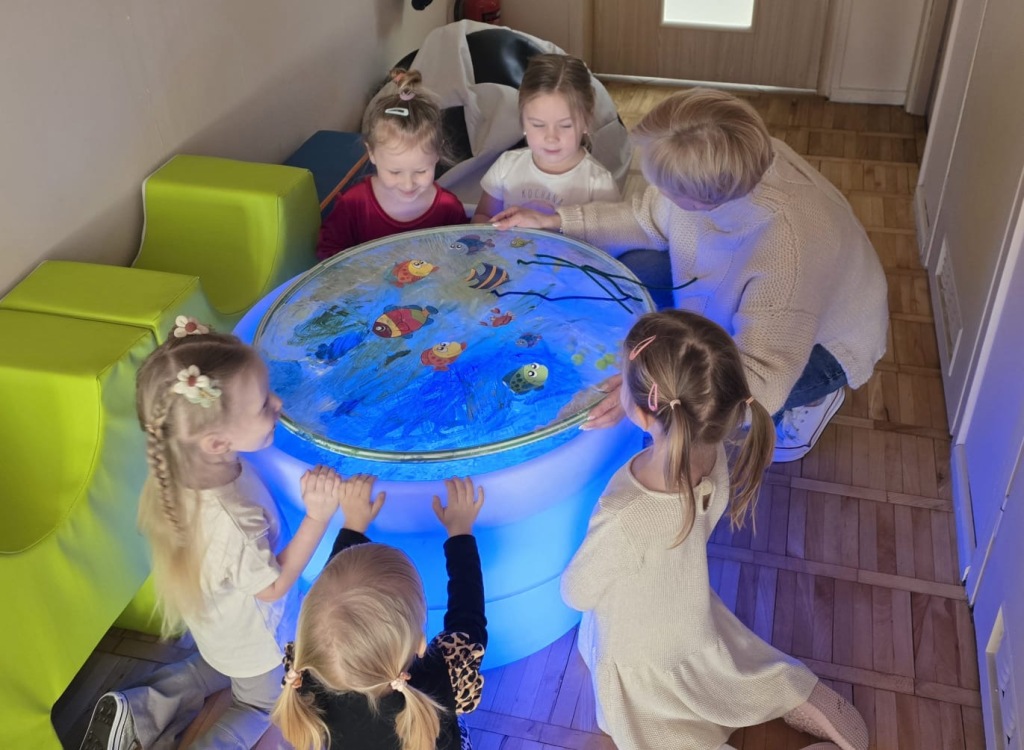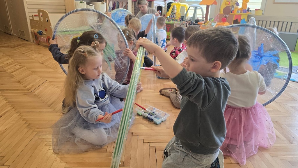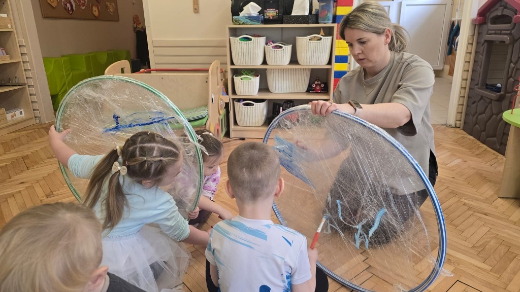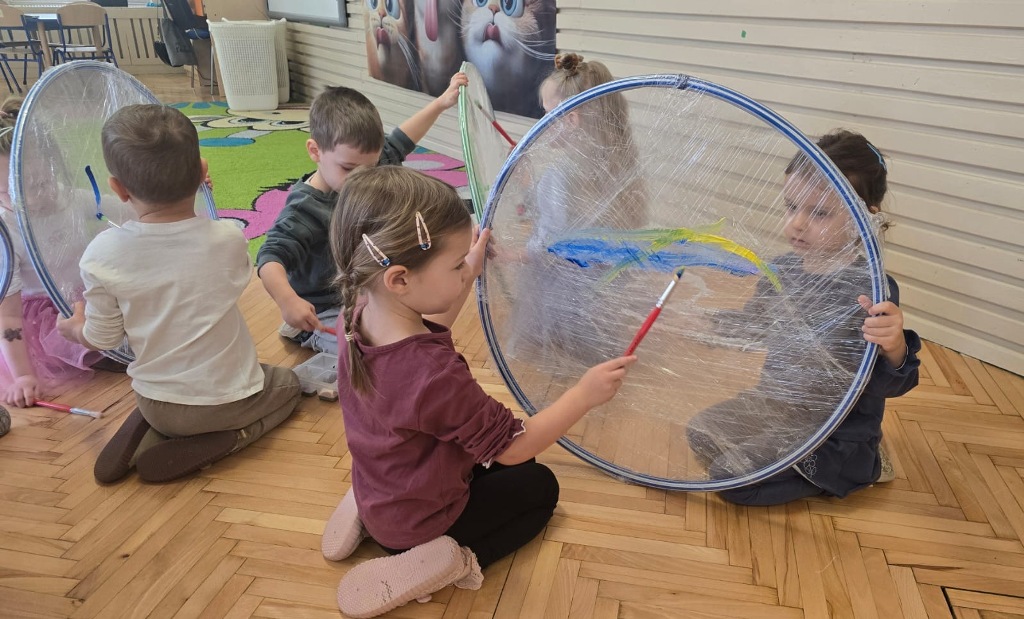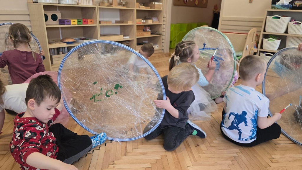 Dziś dzieci z grupy Niedźwiadki uczestniczyły w wielozmysłowych zajęciach plastycznych, tworząc zbiorową wizję oceanu na folii stretch. Głównym elementem zajęć było połączenie ekspresji malarskiej z aktywnym słuchaniem muzyki klasycznej- muzyki o tematyce wodnej. Spokojne tempo utworów klasycznych sprzyjało skupieniu uwagi na precyzyjnych ruchach pędzla. Malowanie na wspólnej, dużej płaszczyźnie folii stretch wymuszało współpracę i wzajemne dopasowanie swoich wizji artystycznych. Dzięki kojącym dźwiękom muzyki klasycznej, prace zyskały niezwykłą płynność i bogactwo barw. Dzieci z dużym zaangażowaniem tworzyły falujące wodorosty i kolorowe rybki, reagując dynamiką ruchów na zmiany w brzmieniu instrumentów.