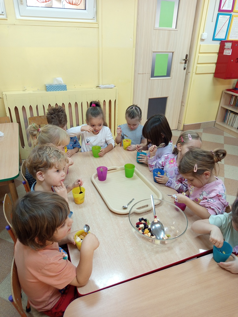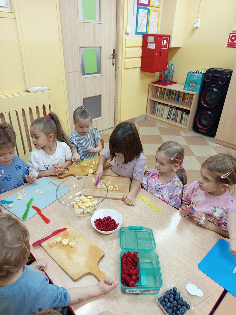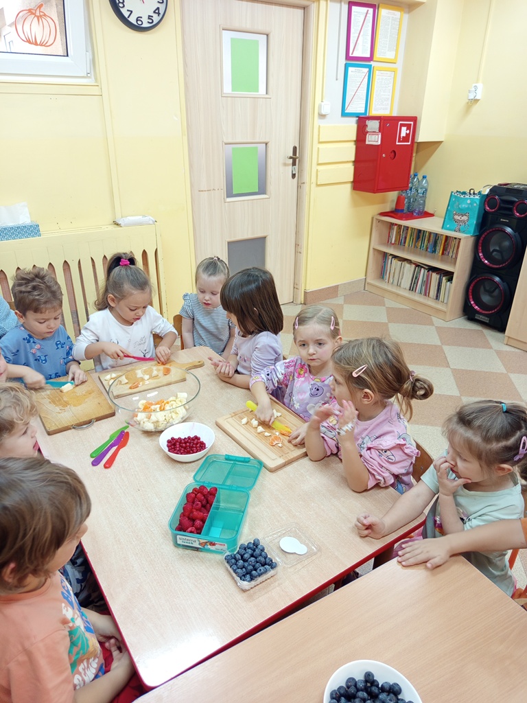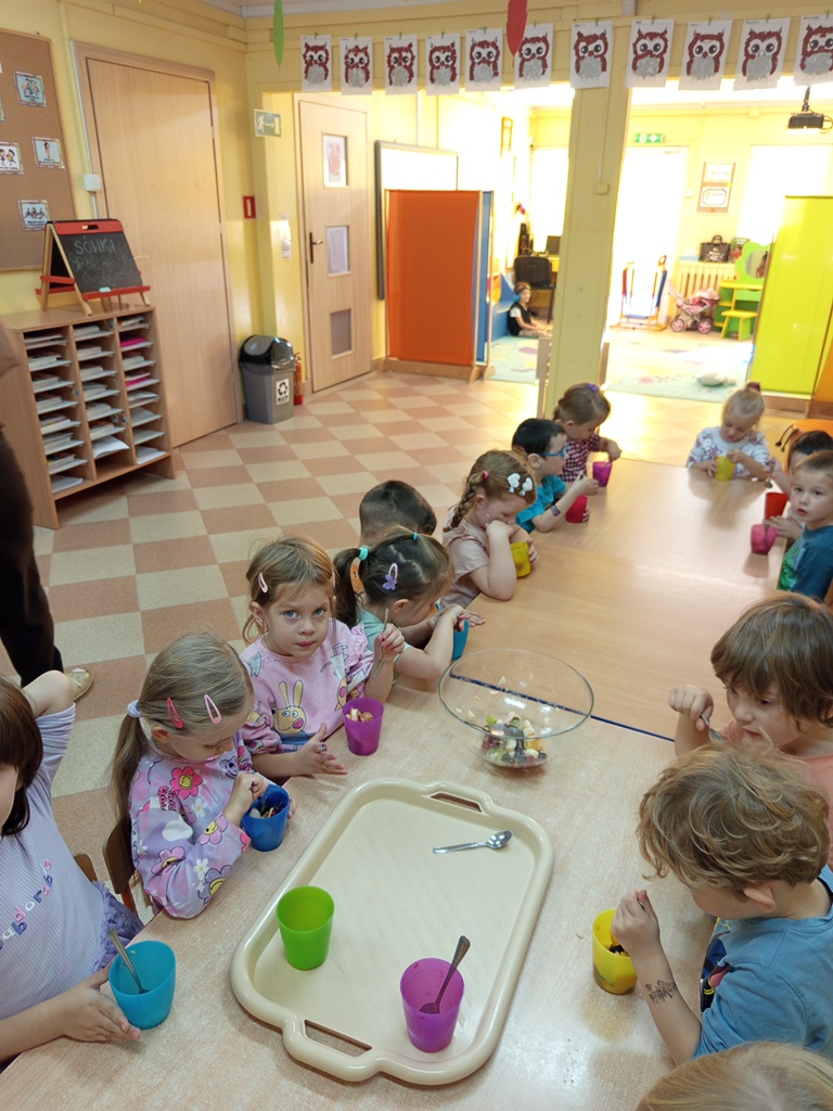 Dzieci z grupy „Sówki" z wielkim zaangażowaniem przygotowały pyszną i kolorową sałatkę owocową! Najpierw wspólnie rozmawiały o ulubionych owocach, ich kolorach i wartościach zdrowotnych. Następnie mali kucharze z zapałem obierali, kroili i mieszali owoce, ucząc się przy tym współpracy oraz zasad bezpieczeństwa. Na koniec wszyscy z dumą częstowali się własnoręcznie przygotowaną sałatką – była pyszna, pachnąca i pełna witamin!