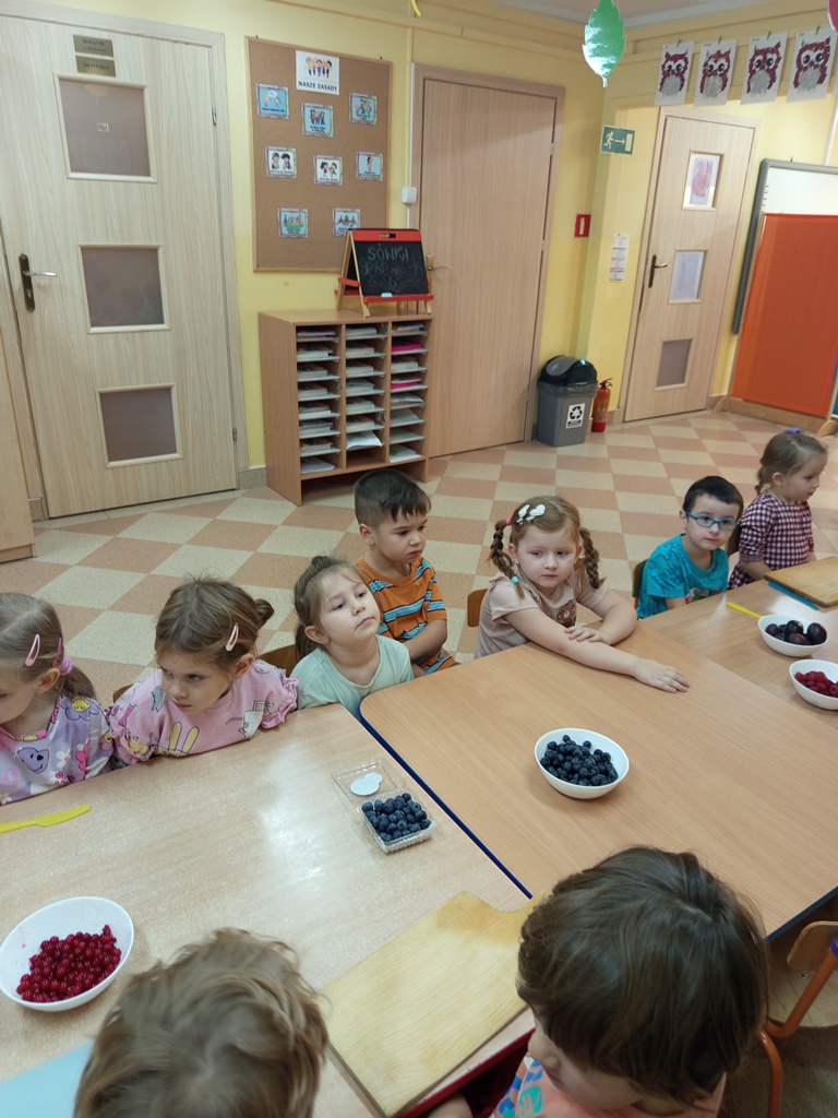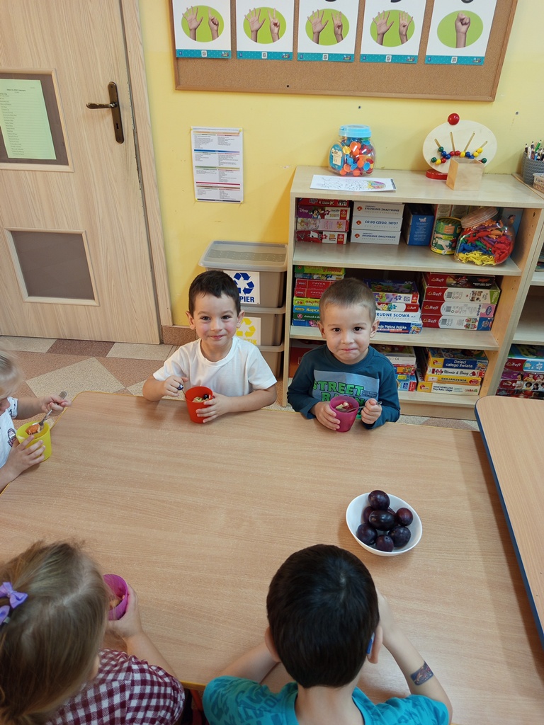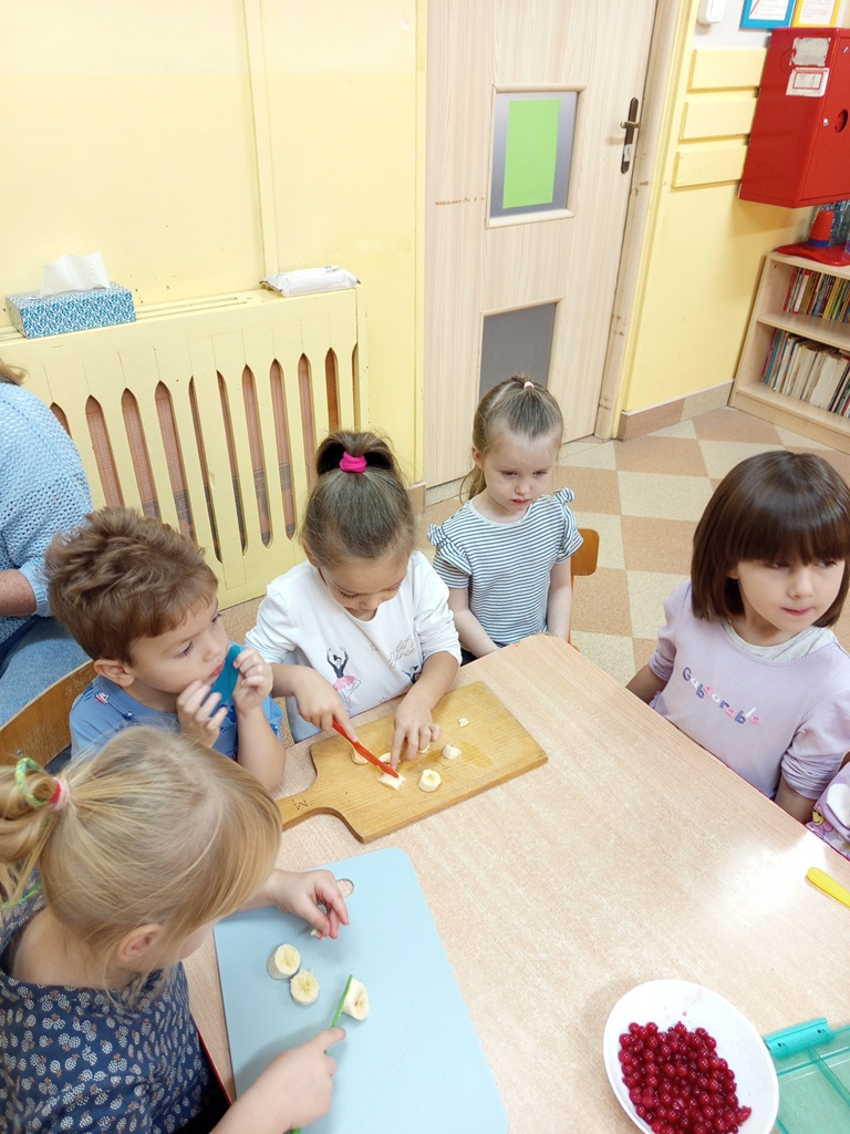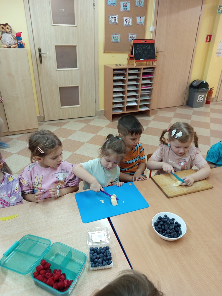 Dzieci z grupy „Sówki" z wielkim zaangażowaniem przygotowały pyszną i kolorową sałatkę owocową! Najpierw wspólnie rozmawiały o ulubionych owocach, ich kolorach i wartościach zdrowotnych. Następnie mali kucharze z zapałem obierali, kroili i mieszali owoce, ucząc się przy tym współpracy oraz zasad bezpieczeństwa. Na koniec wszyscy z dumą częstowali się własnoręcznie przygotowaną sałatką – była pyszna, pachnąca i pełna witamin!