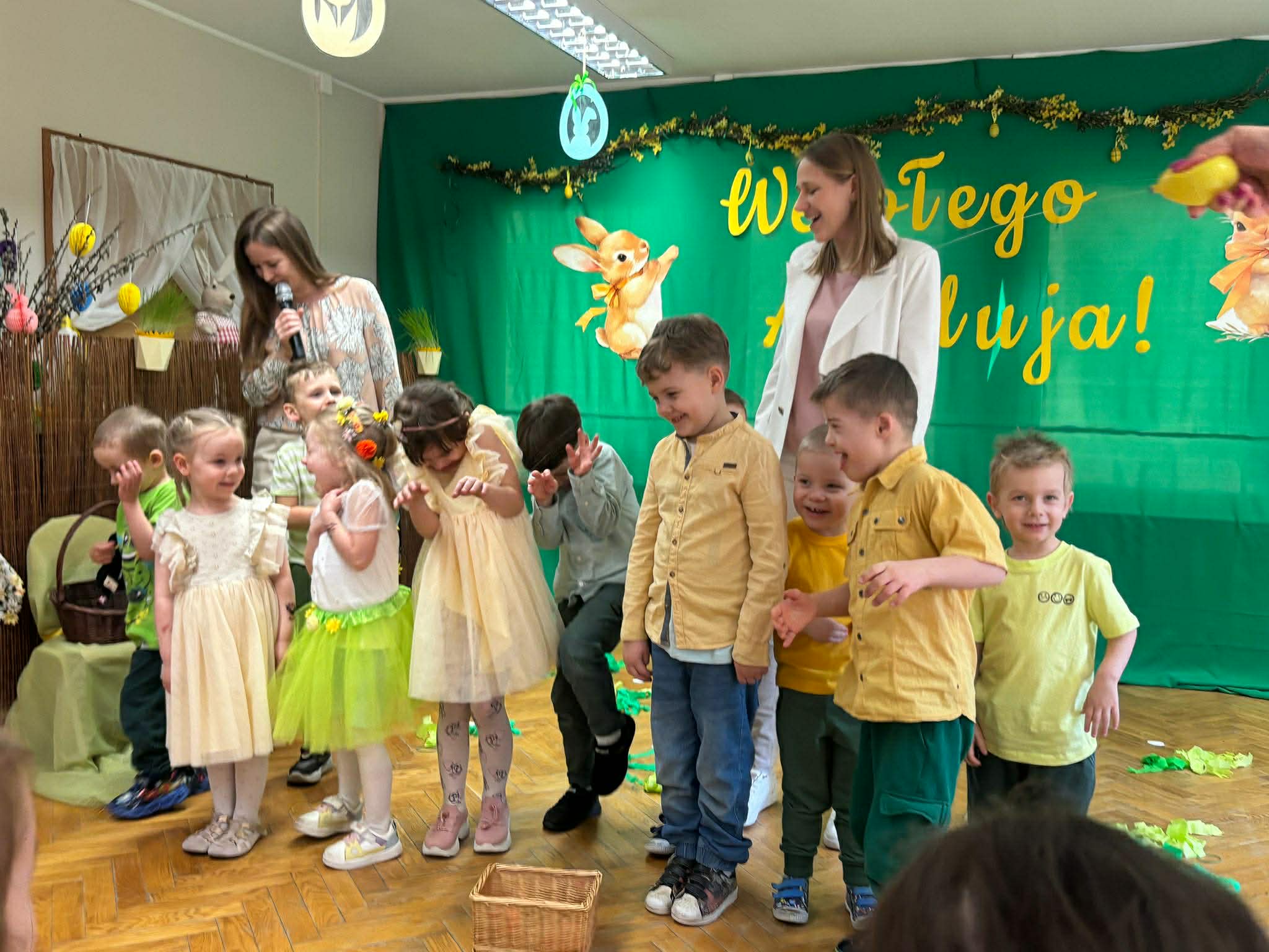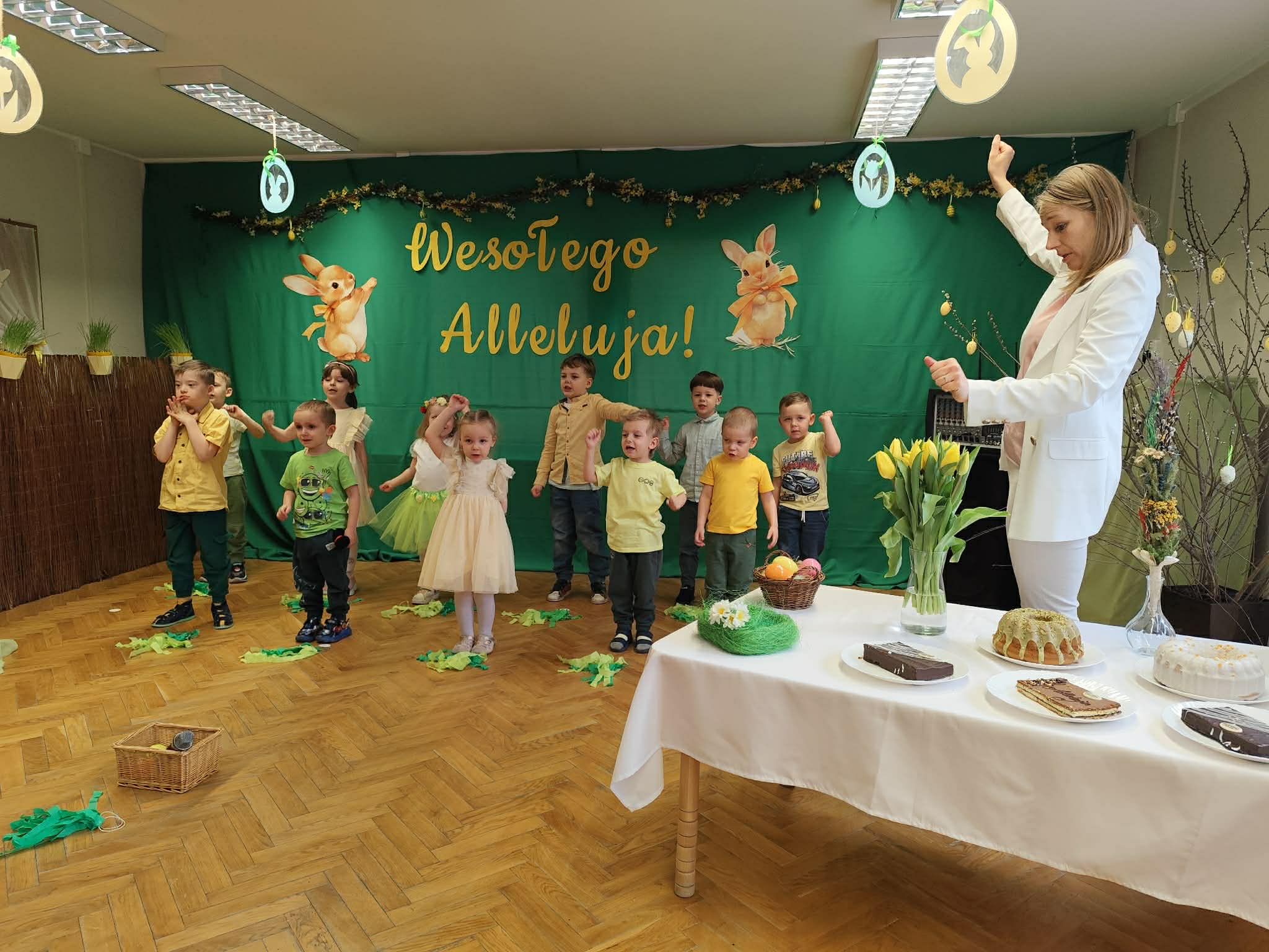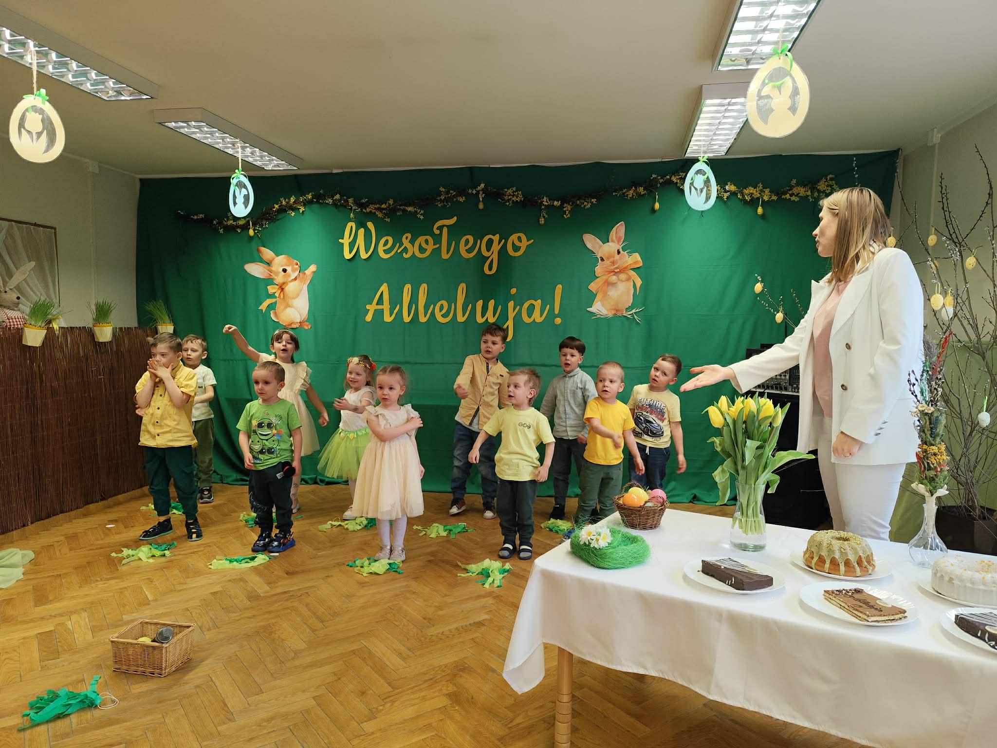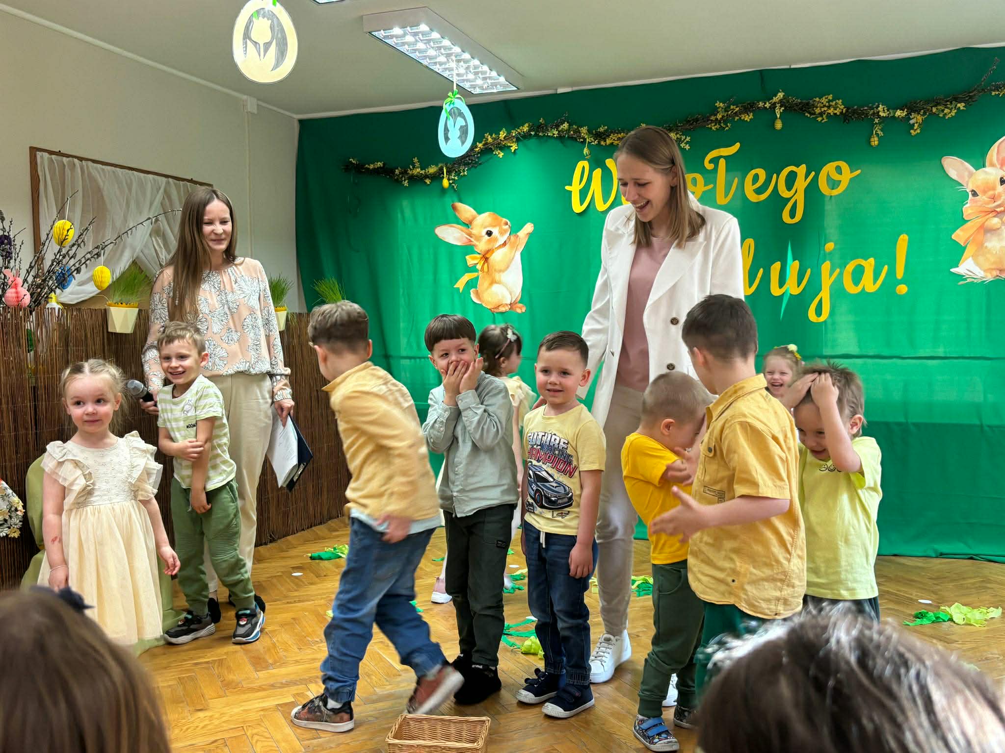 To był wyjątkowy czas spędzony wspólnie z Rodzicami. Dzieci przygotowały piękne występy, które wprowadziły wszystkich w świąteczny nastrój. Nie zabrakło także pysznego, wielkanocnego poczęstunku, a rozmowom i śmiechom nie było końca. Dziękujemy za wspólnie spędzone chwile i stworzenie tak ciepłej, rodzinnej atmosfery! Życzymy wszystkim radosnych, spokojnych Świąt Wielkanocnych, pełnych uśmiechu i wiosennej nadziei. Wesołego Alleluja!
