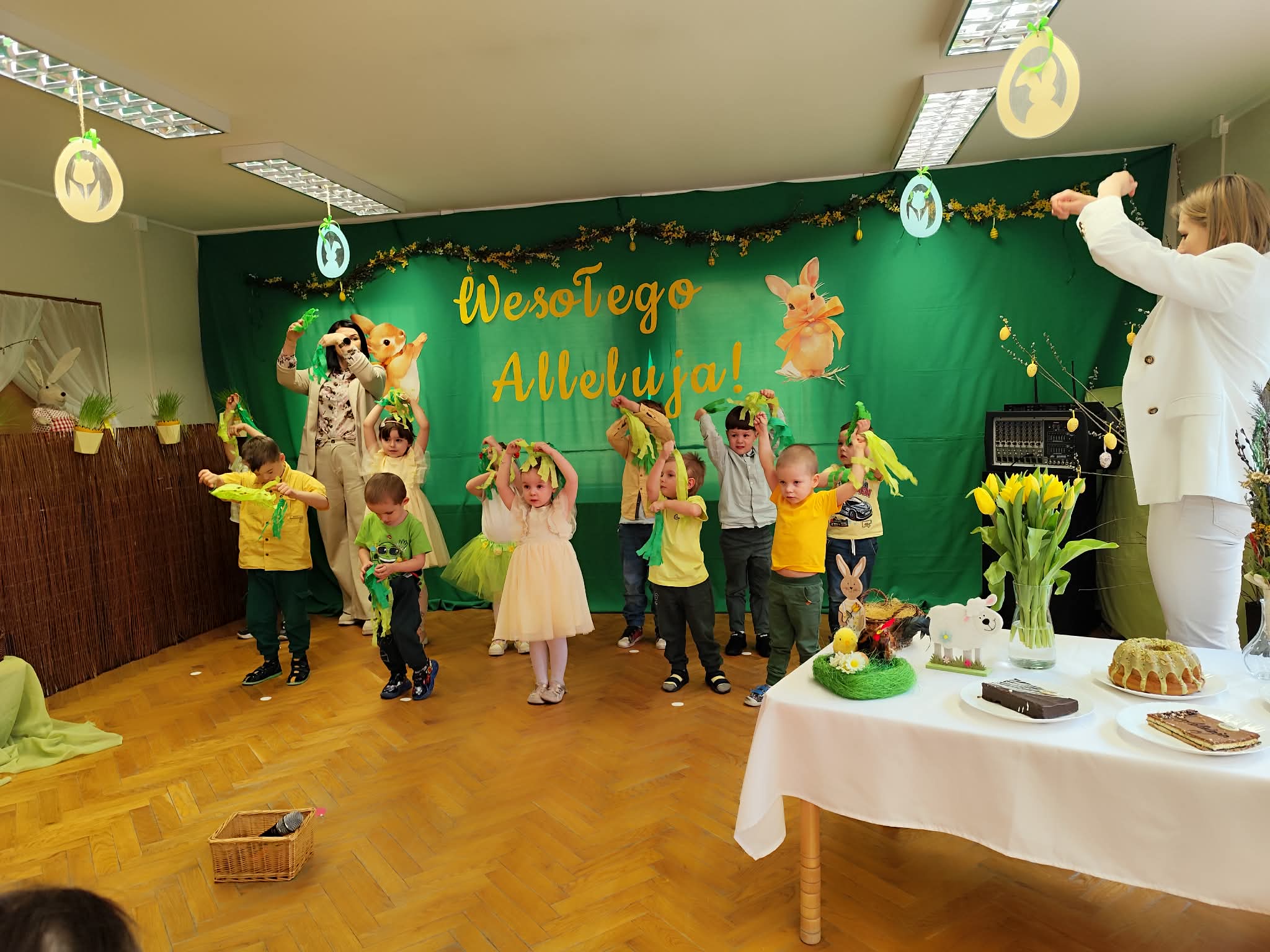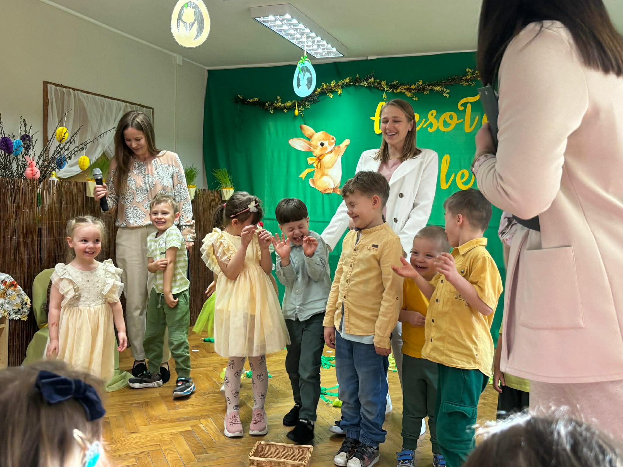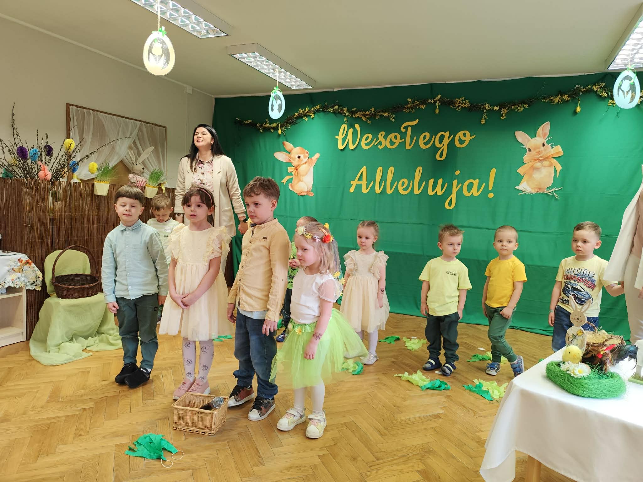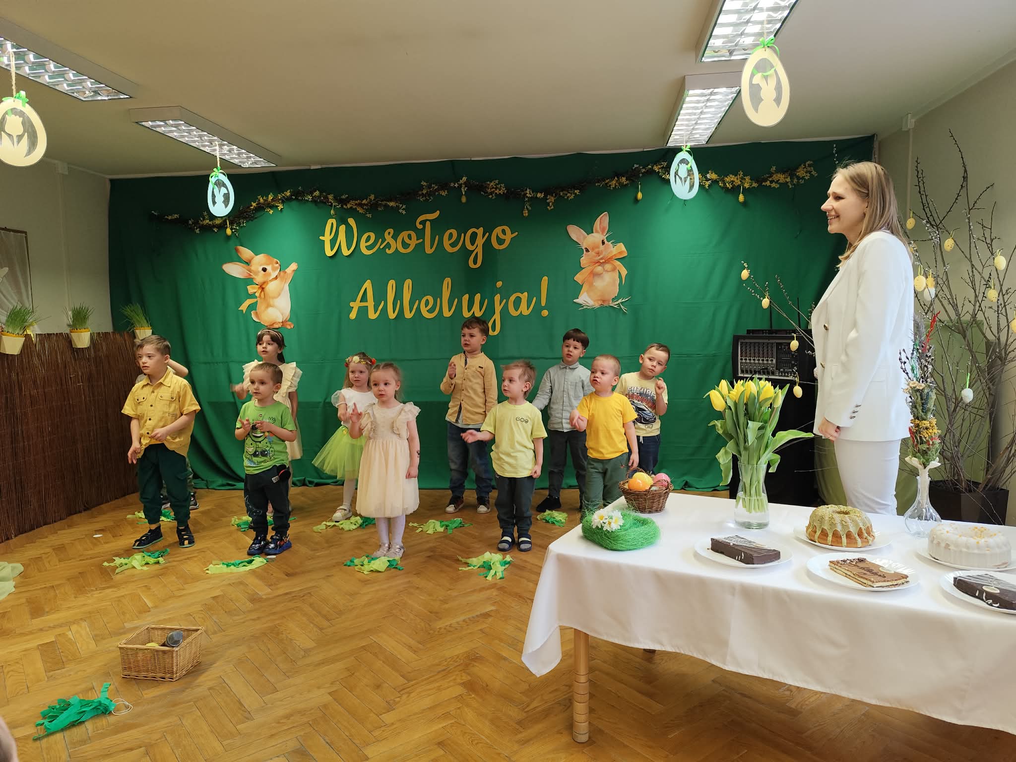 To był wyjątkowy czas spędzony wspólnie z Rodzicami. Dzieci przygotowały piękne występy, które wprowadziły wszystkich w świąteczny nastrój. Nie zabrakło także pysznego, wielkanocnego poczęstunku, a rozmowom i śmiechom nie było końca. Dziękujemy za wspólnie spędzone chwile i stworzenie tak ciepłej, rodzinnej atmosfery! Życzymy wszystkim radosnych, spokojnych Świąt Wielkanocnych, pełnych uśmiechu i wiosennej nadziei. Wesołego Alleluja!