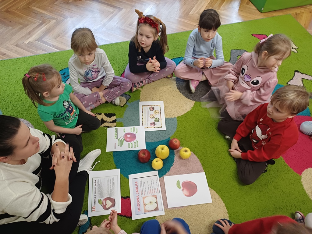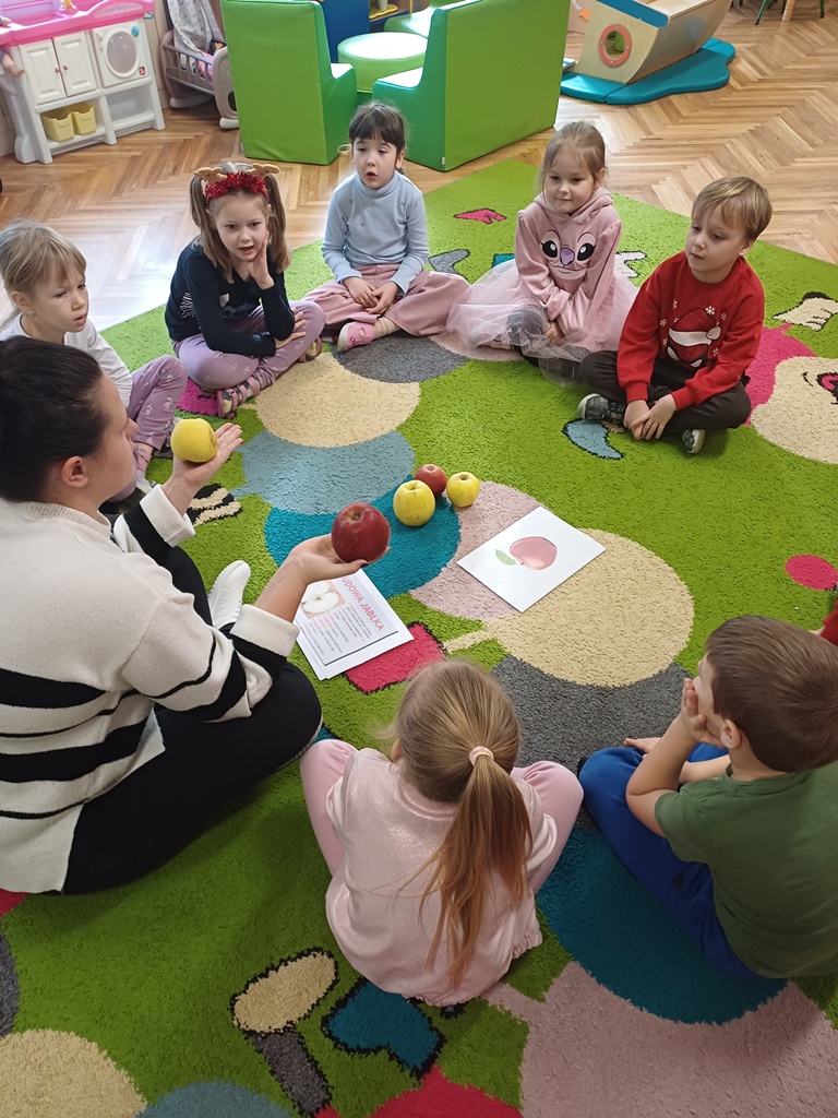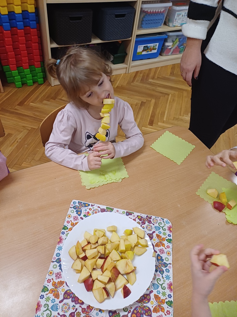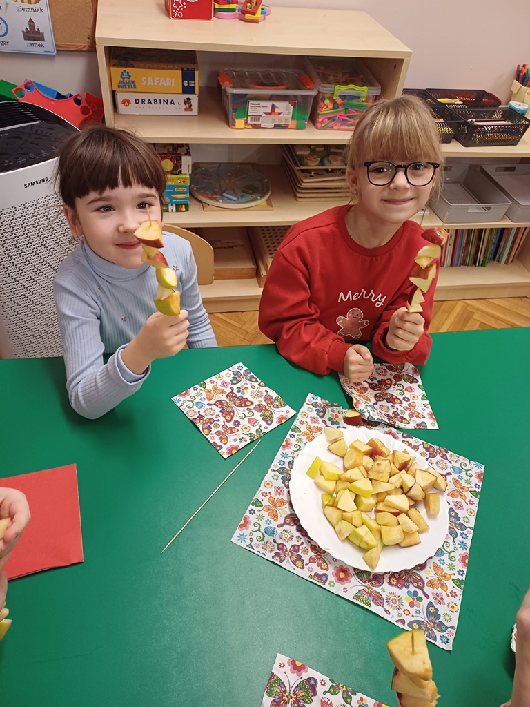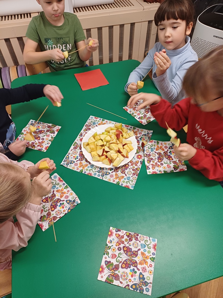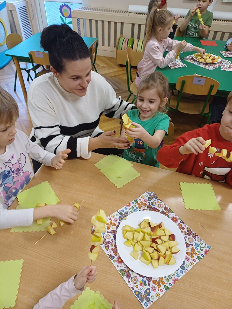 W ramach programu "Zdrowo rośniemy akcja miesiąca - jabłka" grupa Wiewiórki wzięła udział w wyjątkowych zajęciach poświęconych tym pysznym owocom! Dzieci miały okazję degustować różne odmiany jabłek, odkrywając ich różnorodne smaki i aromaty. Następnie przygotowały szaszłyki z jabłek. To była nie tylko świetna zabawa, ale także doskonała okazja do nauki o zdrowym odżywianiu!