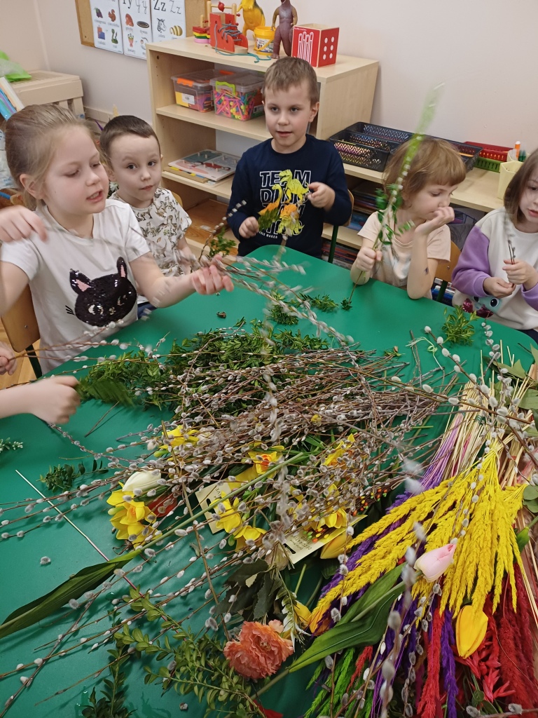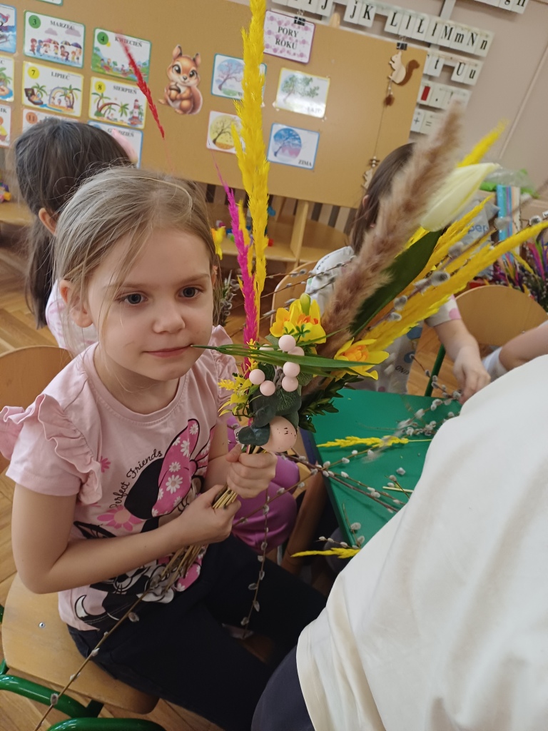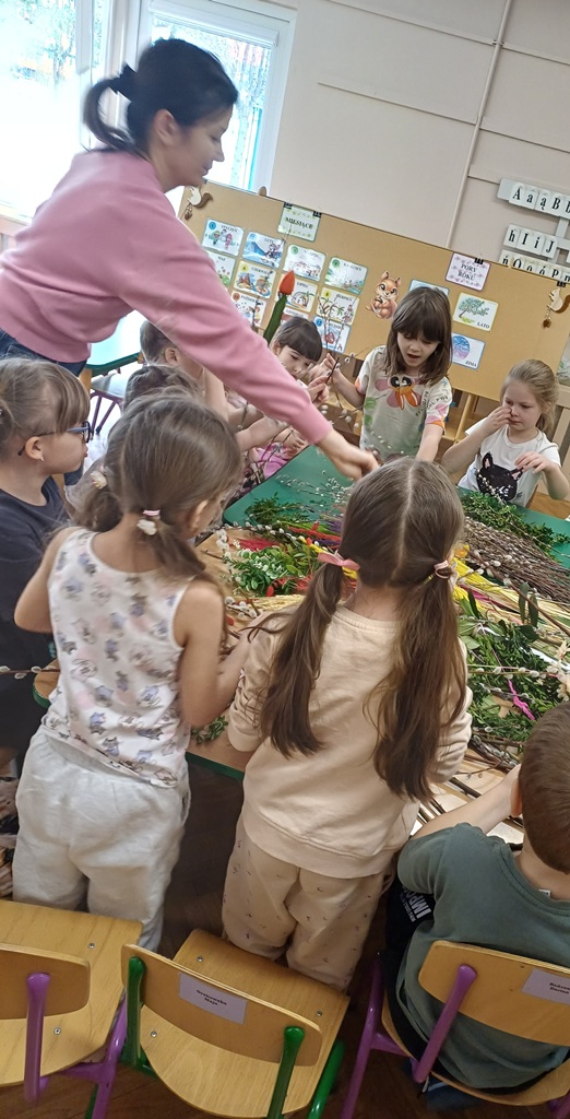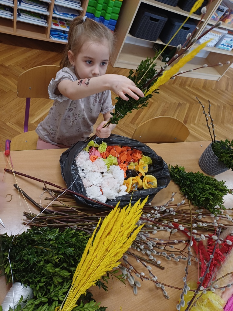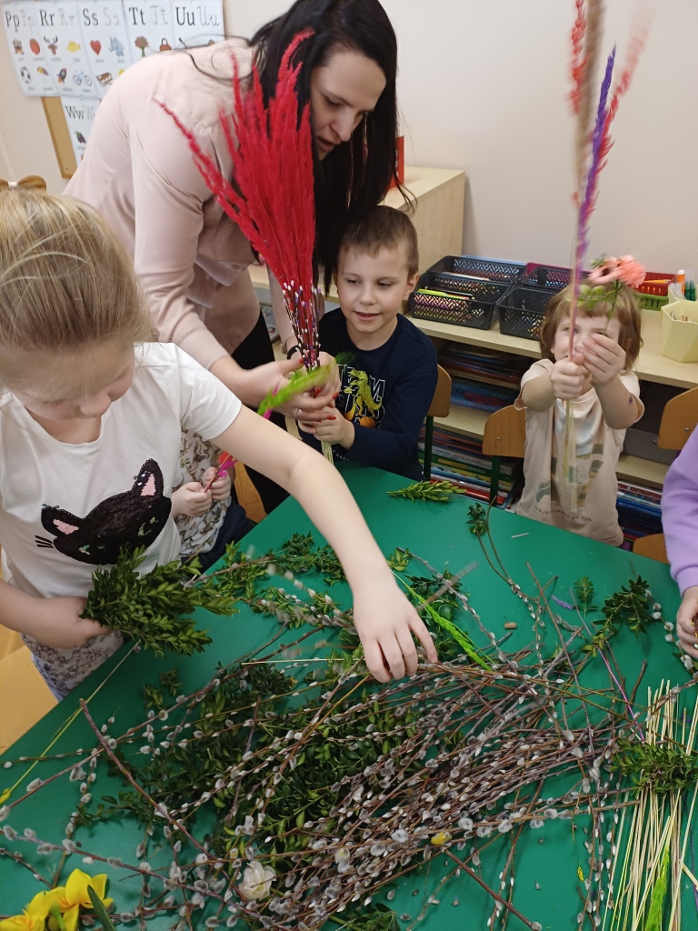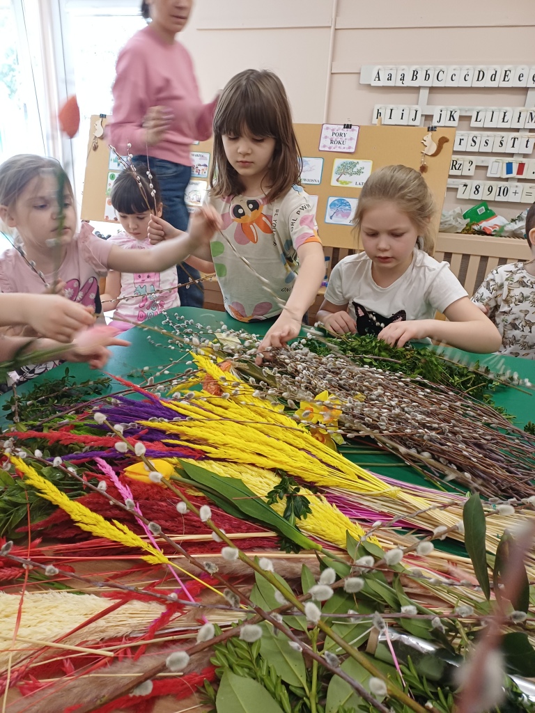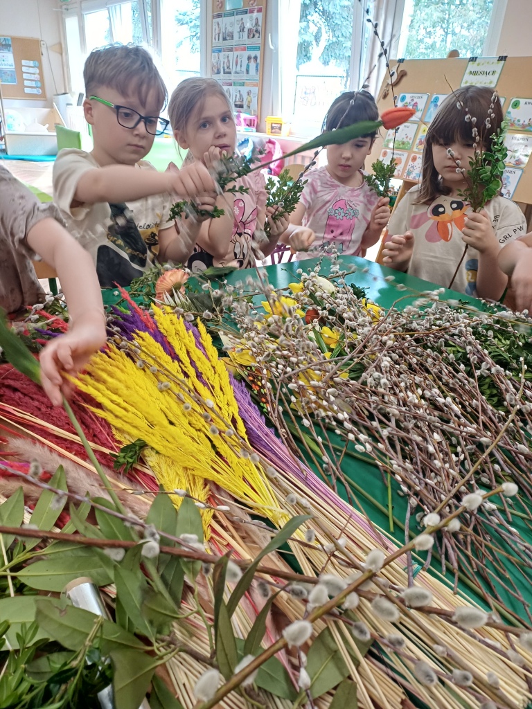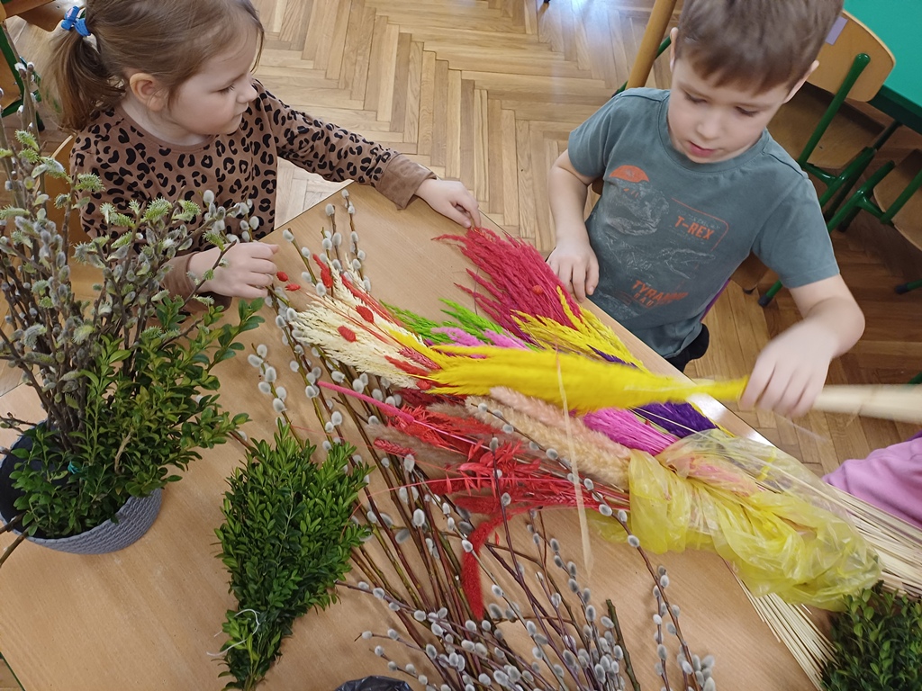 Dzieci z ogromnym zaangażowaniem wykonują piękne, kolorowe palmy, rozwijając swoją kreatywność i zdolności manualne.