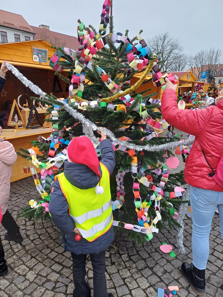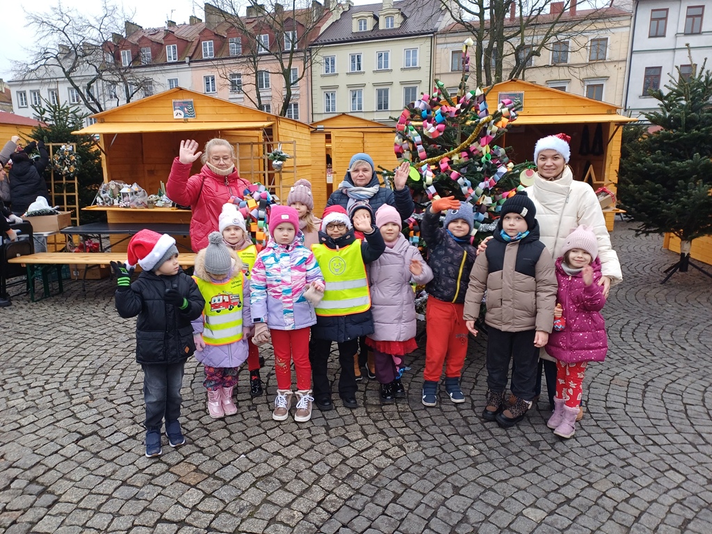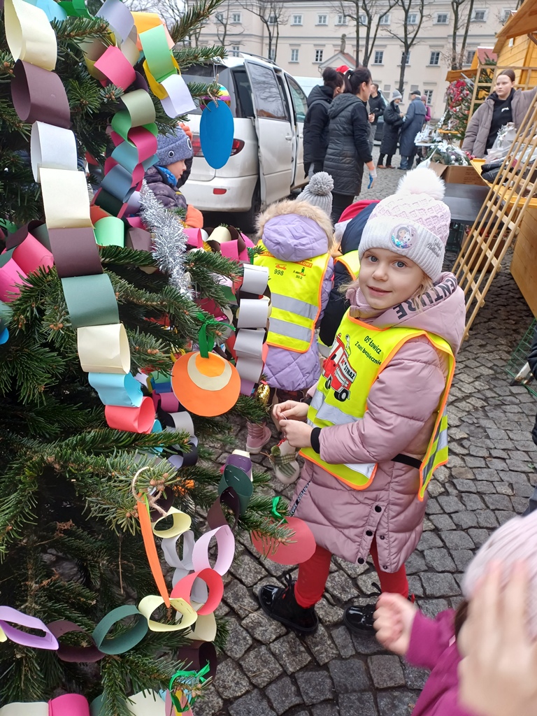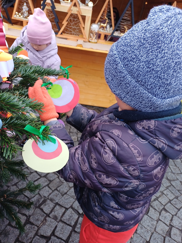 Dnia 5 grudnia 2025 r. dzieci z grupy "Wiewiórki" wybrały się na Stary Rynek, aby udekorować miejskie choinki. Na to wydarzenie przygotowano piękny, kolorowy łańcuch i pawie oczka wykonane przez grupę "Jeżyki " oraz kolorowe bombki, błyszczące gwiazdki i drewniane zawieszki. Wspólne strojenie choinki było nie tylko świetną zabawą, ale także okazją do integracji i budowania świątecznej atmosfery w naszym mieście.