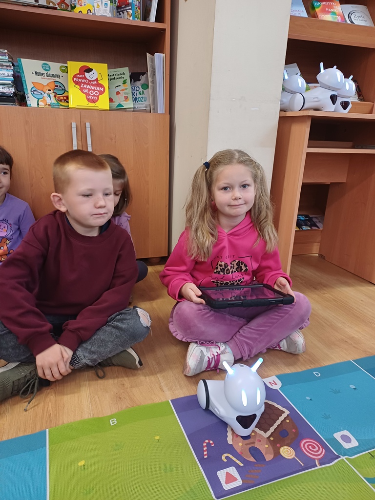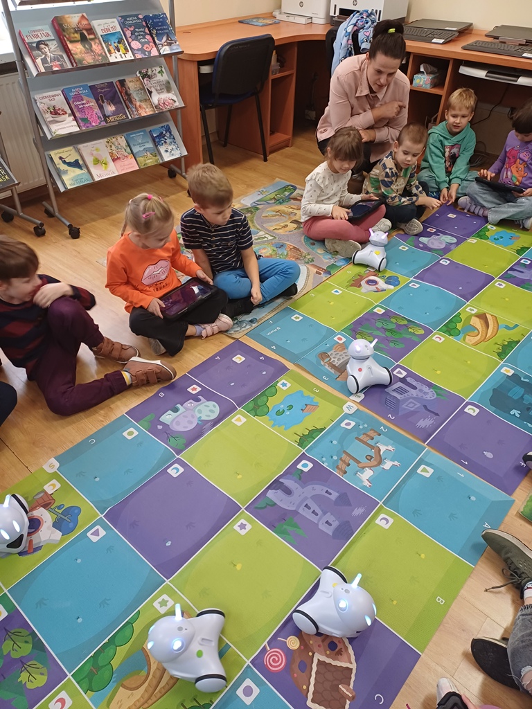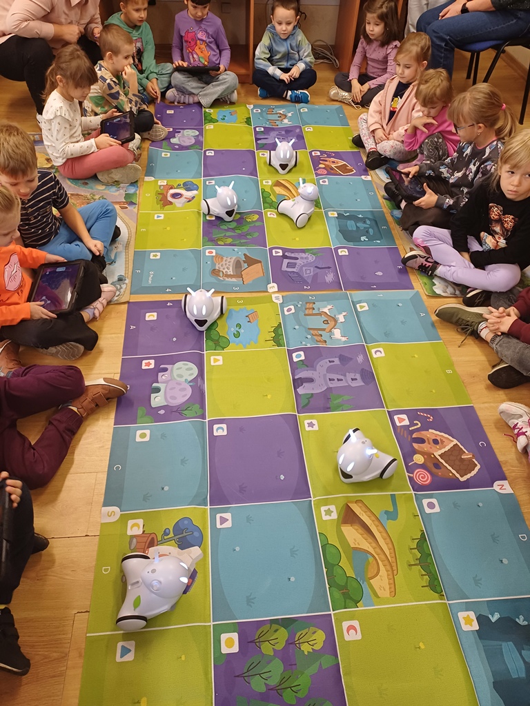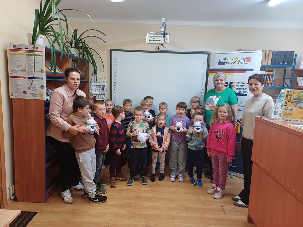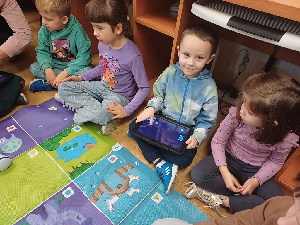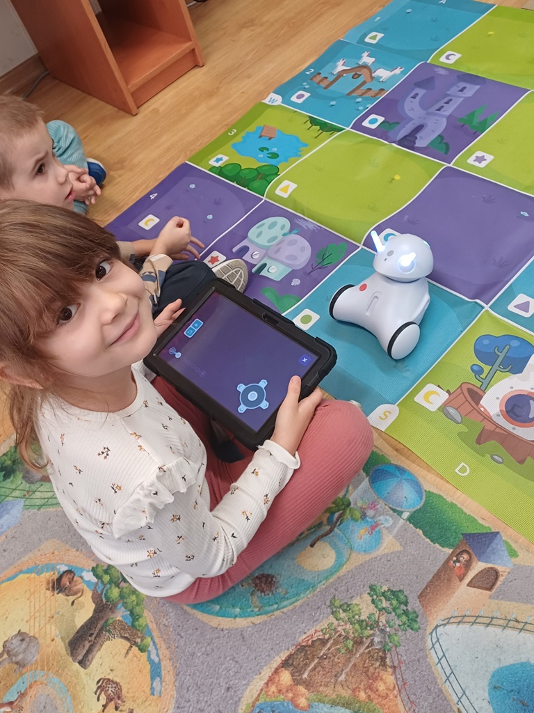 8 października 2025 r. grupa ,,Wiewiórki" wybrała się do Biblioteki Pedagogicznej w Łowiczu na zajęcia edukacyjne pt.: "Raz, dwa, trzy - kodujesz Ty". Uczyli się zasad obsługi robotów Photon EDU i podstaw kodowania. Na zakończenie zajęć potrafili już zaprogramować robota w taki sposób, żeby przejechał wyznaczoną trasę, zmieniał kolory i wydawał określone dźwięki. Wszystkie dzieci z radością wykonały swoje zadania.