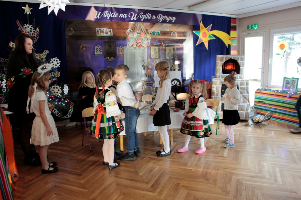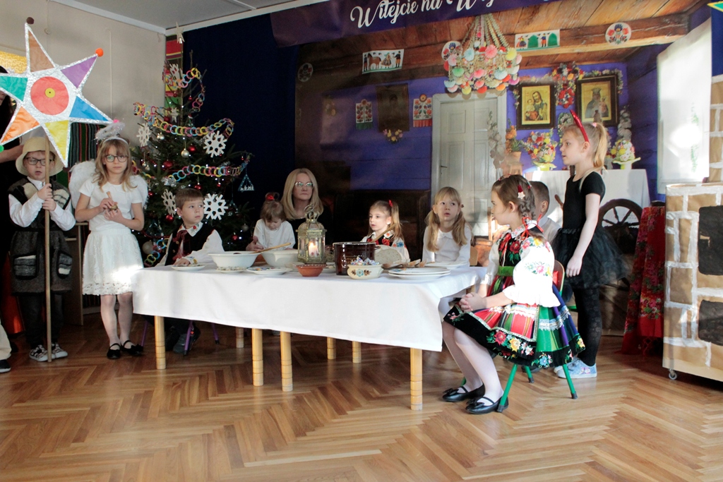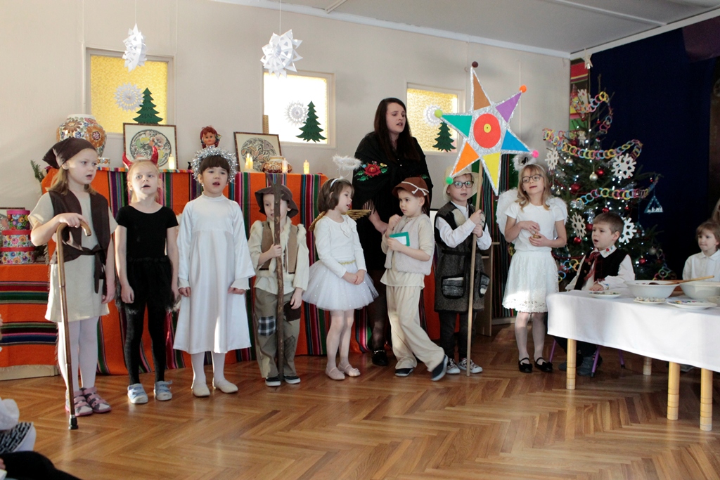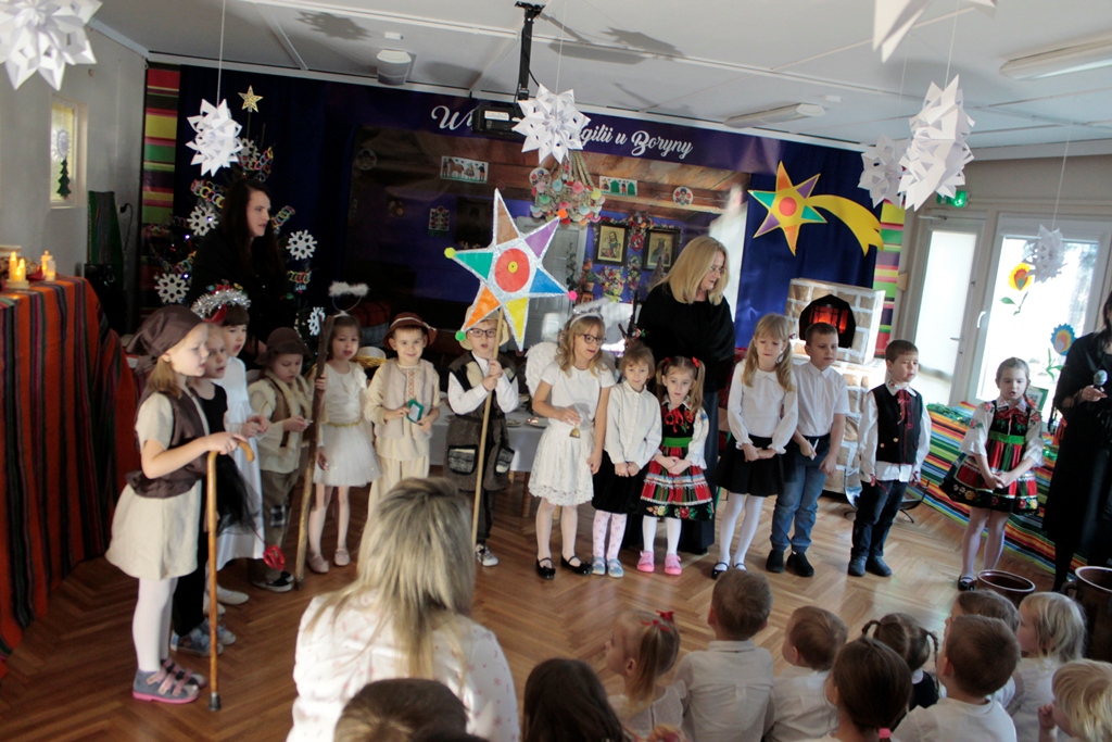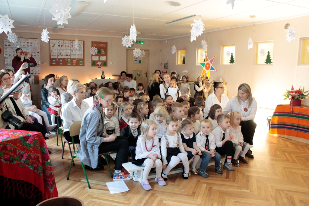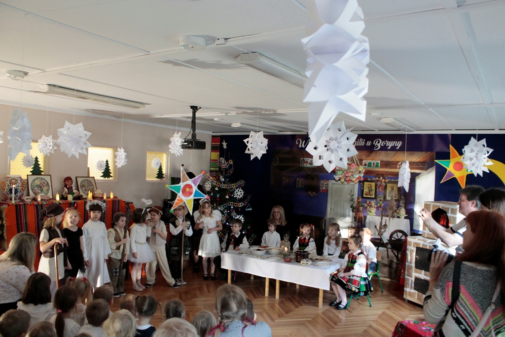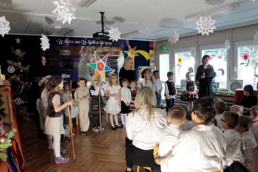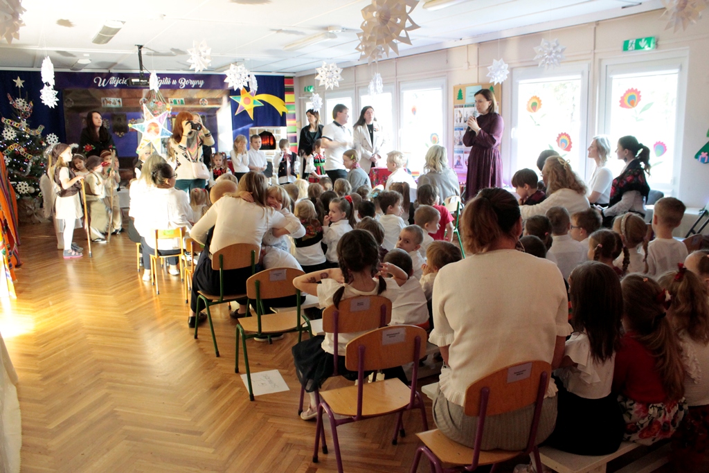 W programie artystycznym wystąpiły dzieci z grupy V „Wiewiórki", które z wielkim zaangażowaniem zaprezentowały przygotowane role, kolędy i pastorałki. Mali artyści zachwycili publiczność nie tylko piękną grą aktorską, ale także strojami i autentycznością przekazu. Wspólne kolędowanie, świąteczne dekoracje oraz ciepła, rodzinna atmosfera sprawiły, że wydarzenie stało się niezapomnianym przeżyciem dla dzieci, nauczycieli i zaproszonych gości. Spotkanie było pięknym podsumowaniem przedświątecznego czasu oraz okazją do kultywowania polskich tradycji.