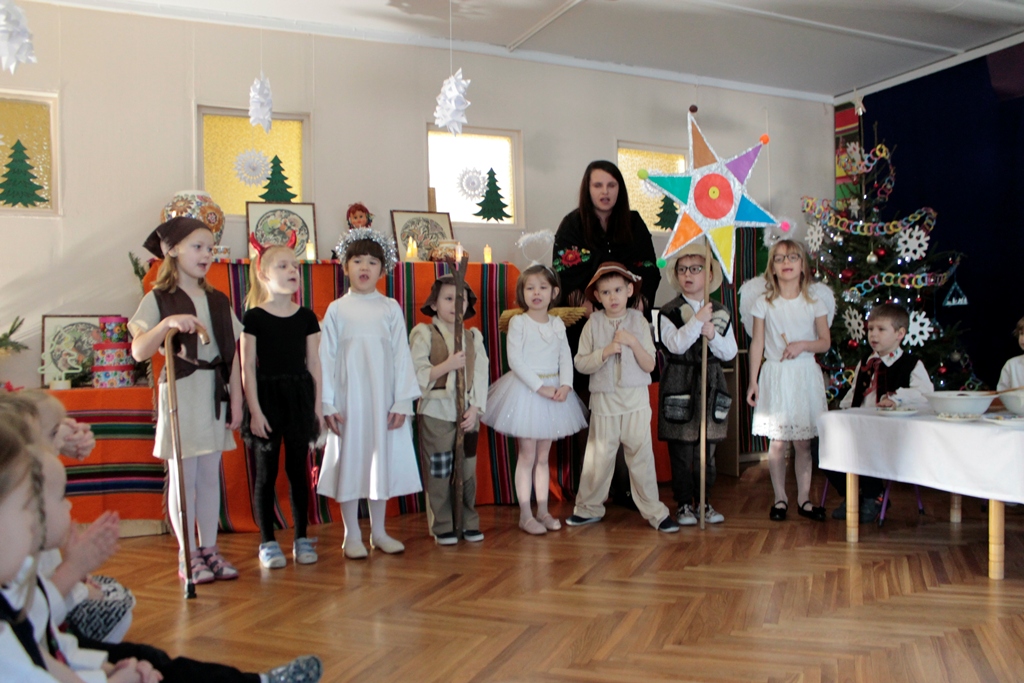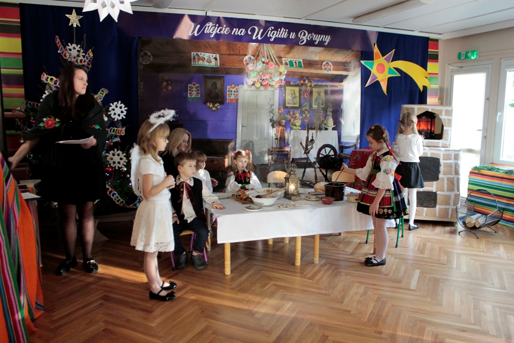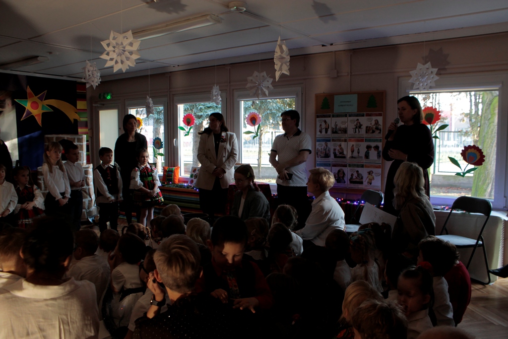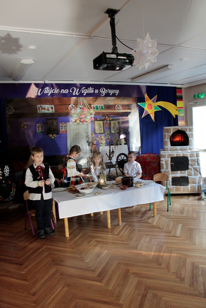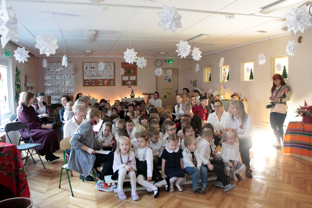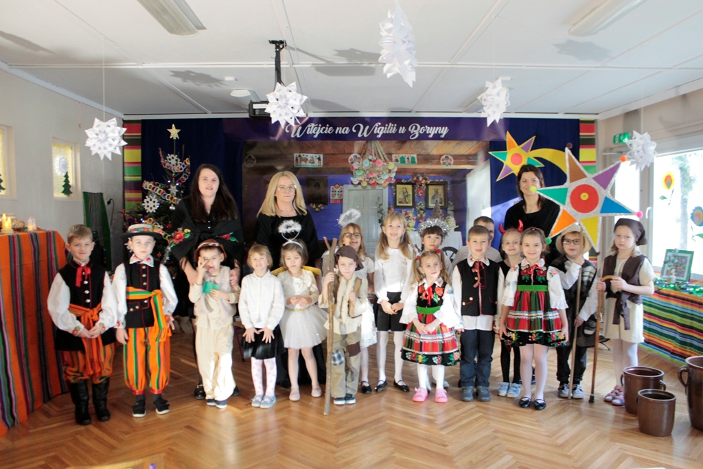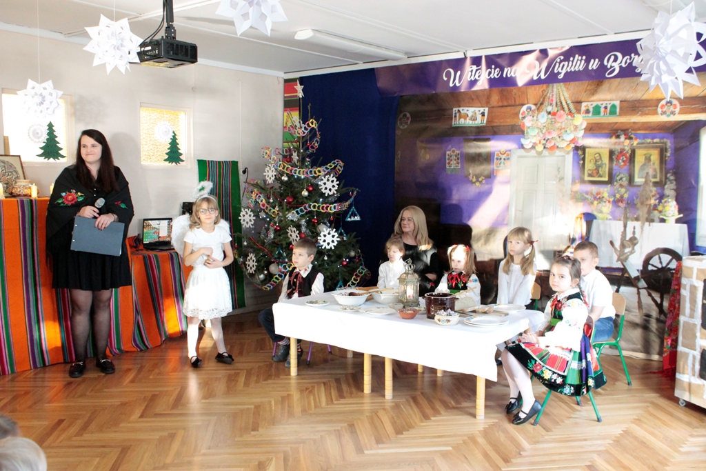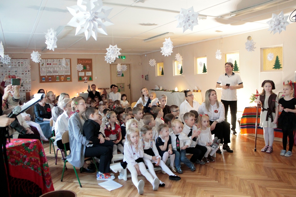 W programie artystycznym wystąpiły dzieci z grupy V „Wiewiórki", które z wielkim zaangażowaniem zaprezentowały przygotowane role, kolędy i pastorałki. Mali artyści zachwycili publiczność nie tylko piękną grą aktorską, ale także strojami i autentycznością przekazu. Wspólne kolędowanie, świąteczne dekoracje oraz ciepła, rodzinna atmosfera sprawiły, że wydarzenie stało się niezapomnianym przeżyciem dla dzieci, nauczycieli i zaproszonych gości. Spotkanie było pięknym podsumowaniem przedświątecznego czasu oraz okazją do kultywowania polskich tradycji.